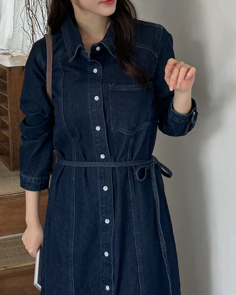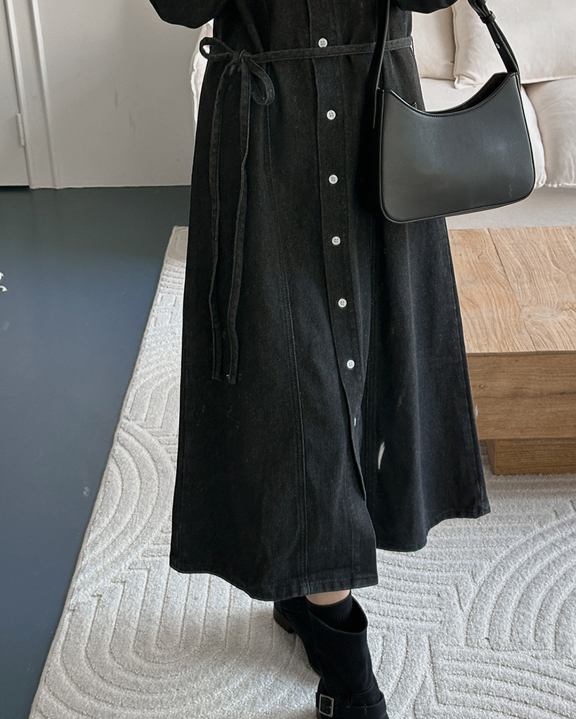 切替ウエストストラップ付フロントスリット入りデニムロングワンピース