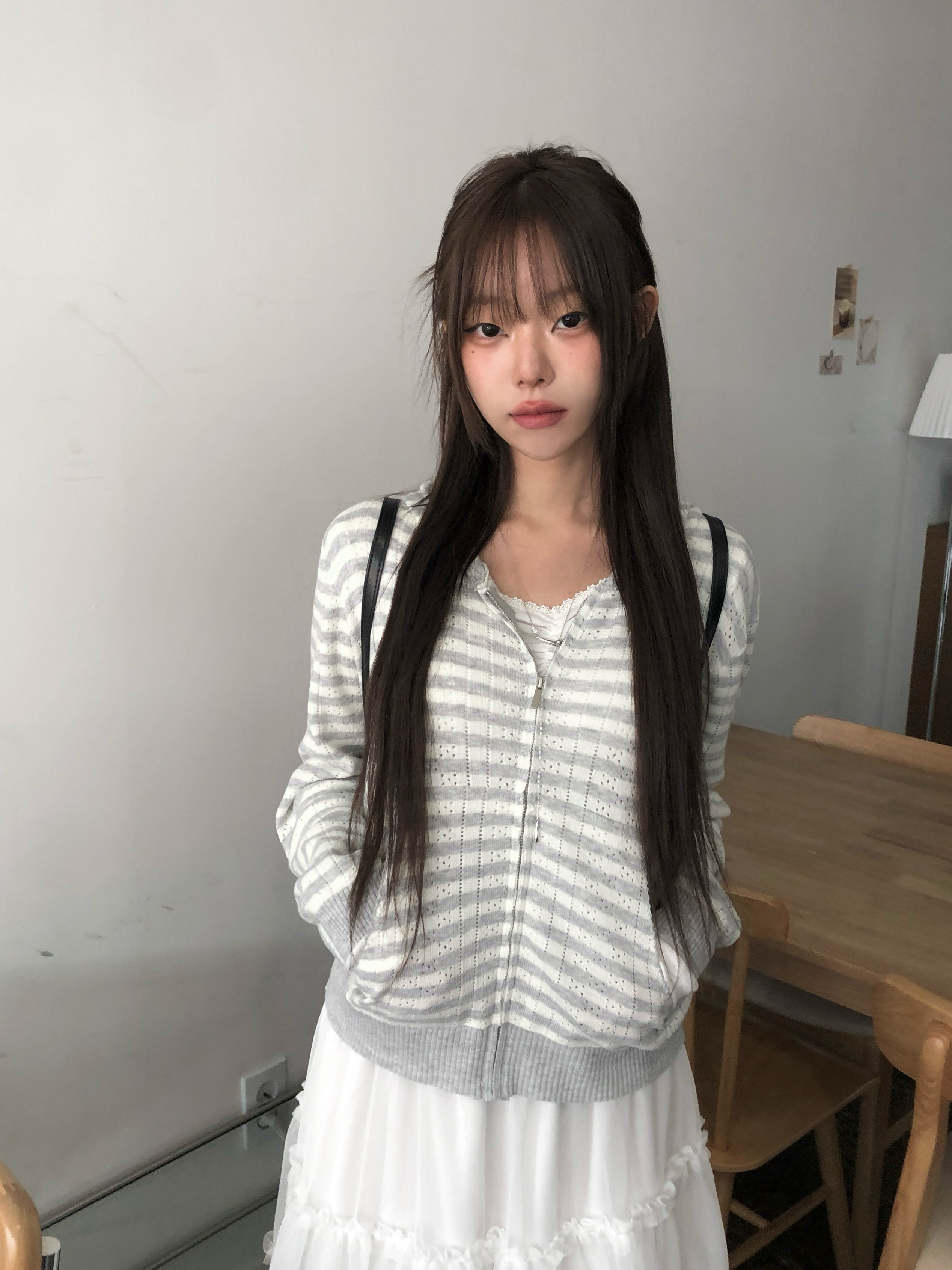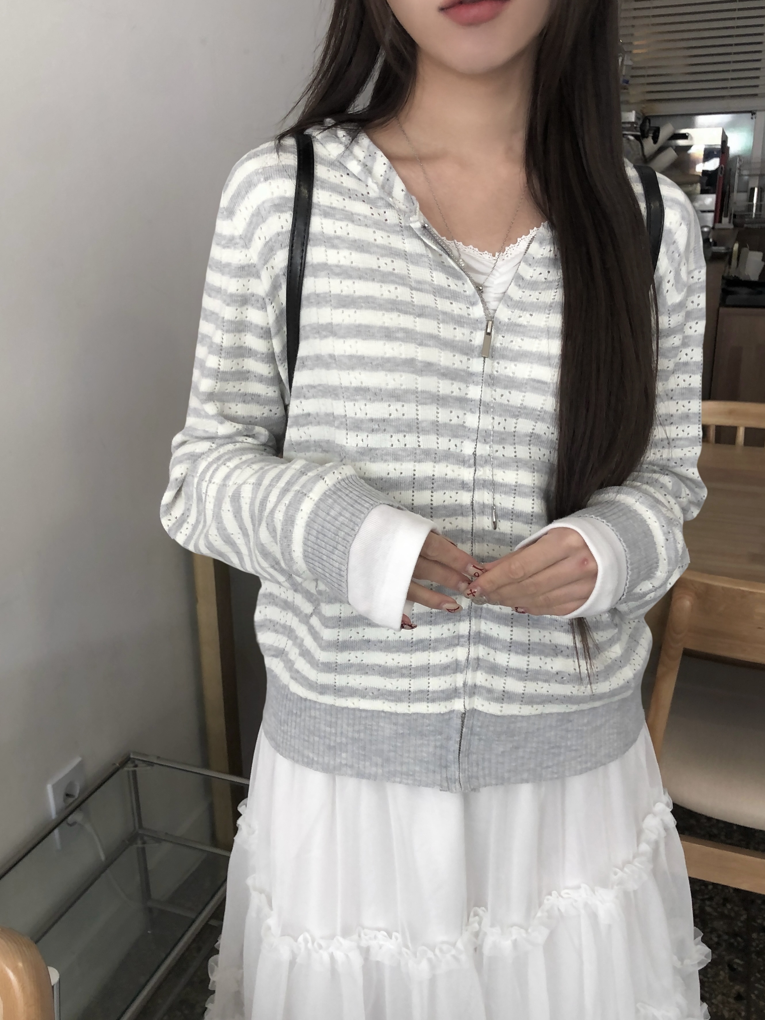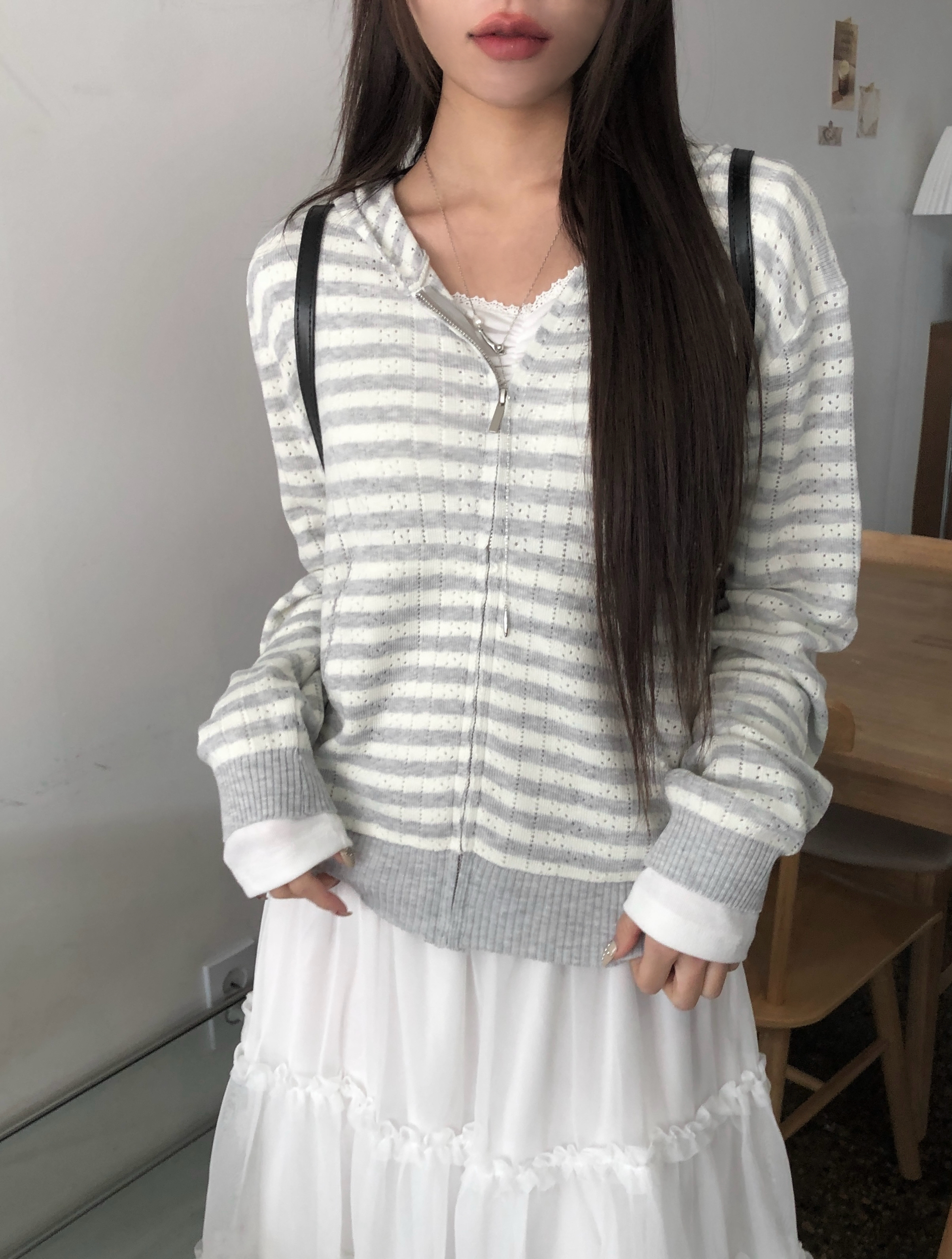 アイレット編みボーダーニットジップパーカー