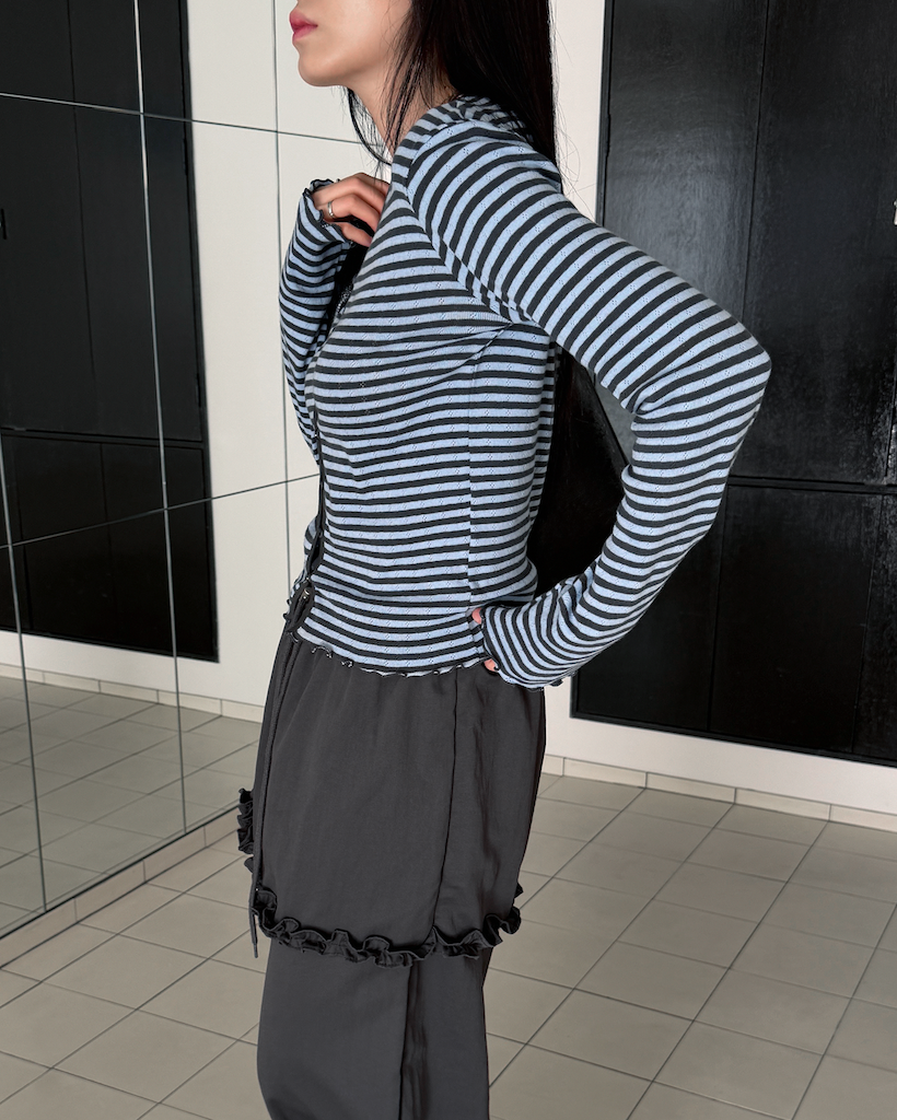 ボーダーのカラーと同系色のステッチを使用することで、主張しすぎず、手元や腰回りにさりげない立体感とアクセントをプラスしました。