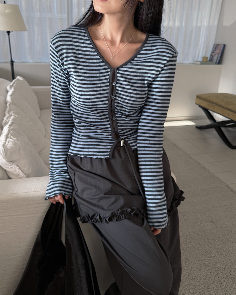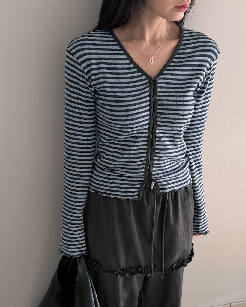 "繊細なメローステッチとループボタンのディテールで、完成度を高めたカーディガンです。"
