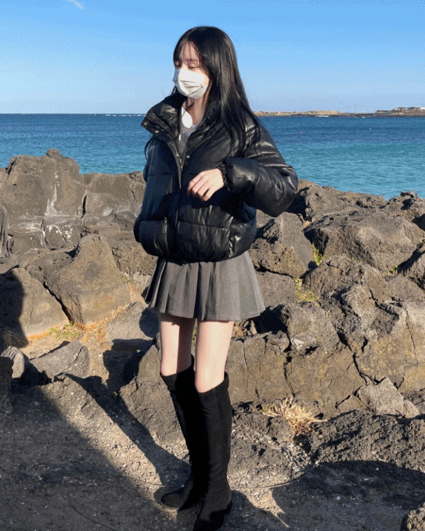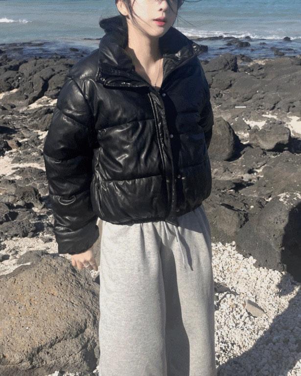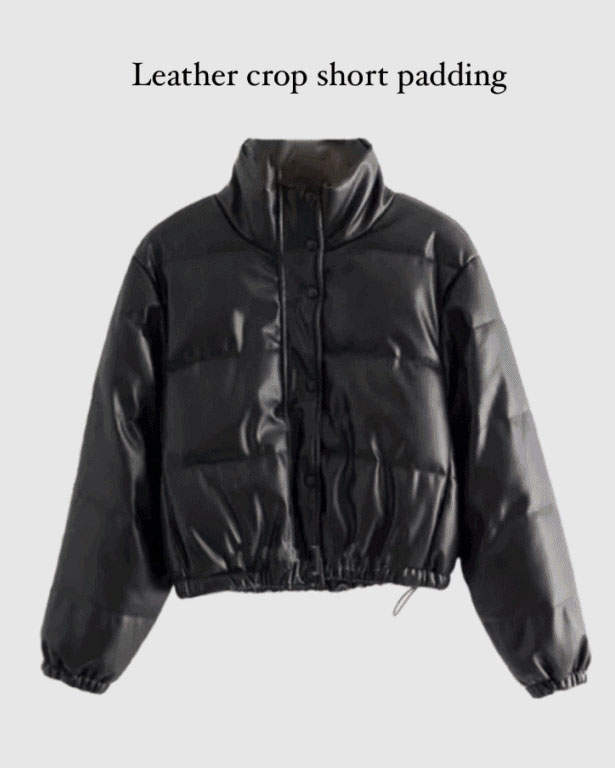 クロップドハイネックレザーショートダウンジャケット