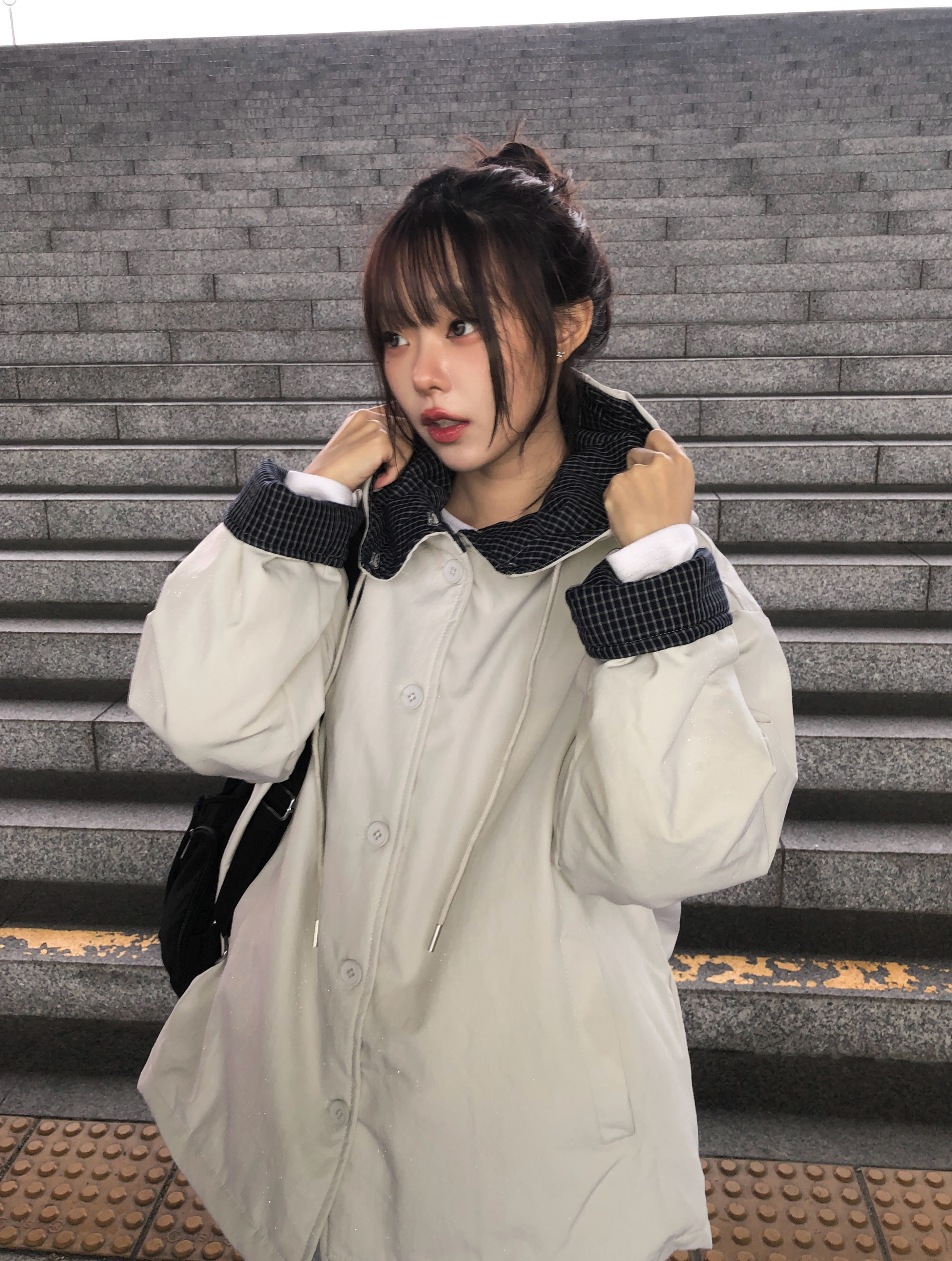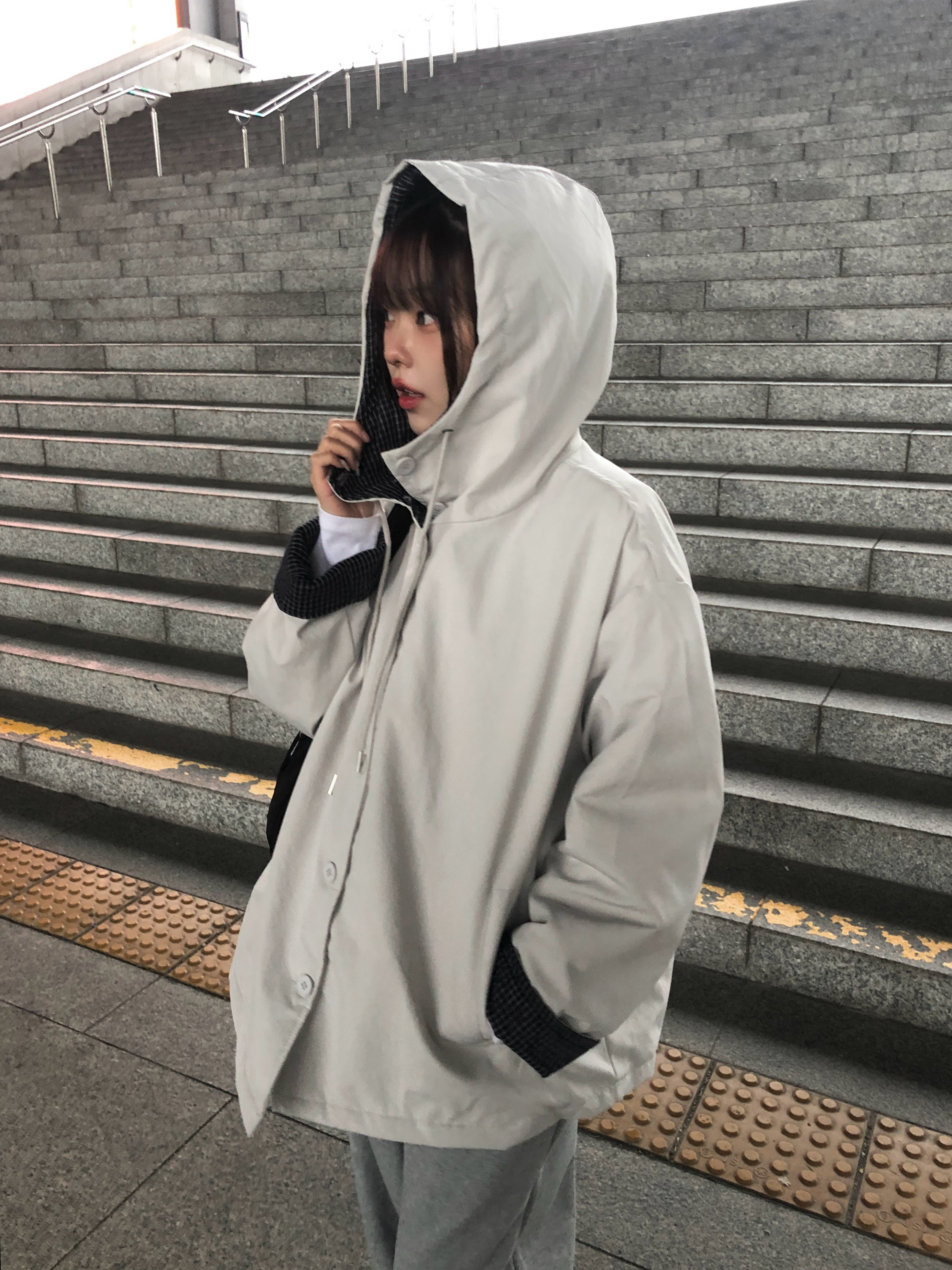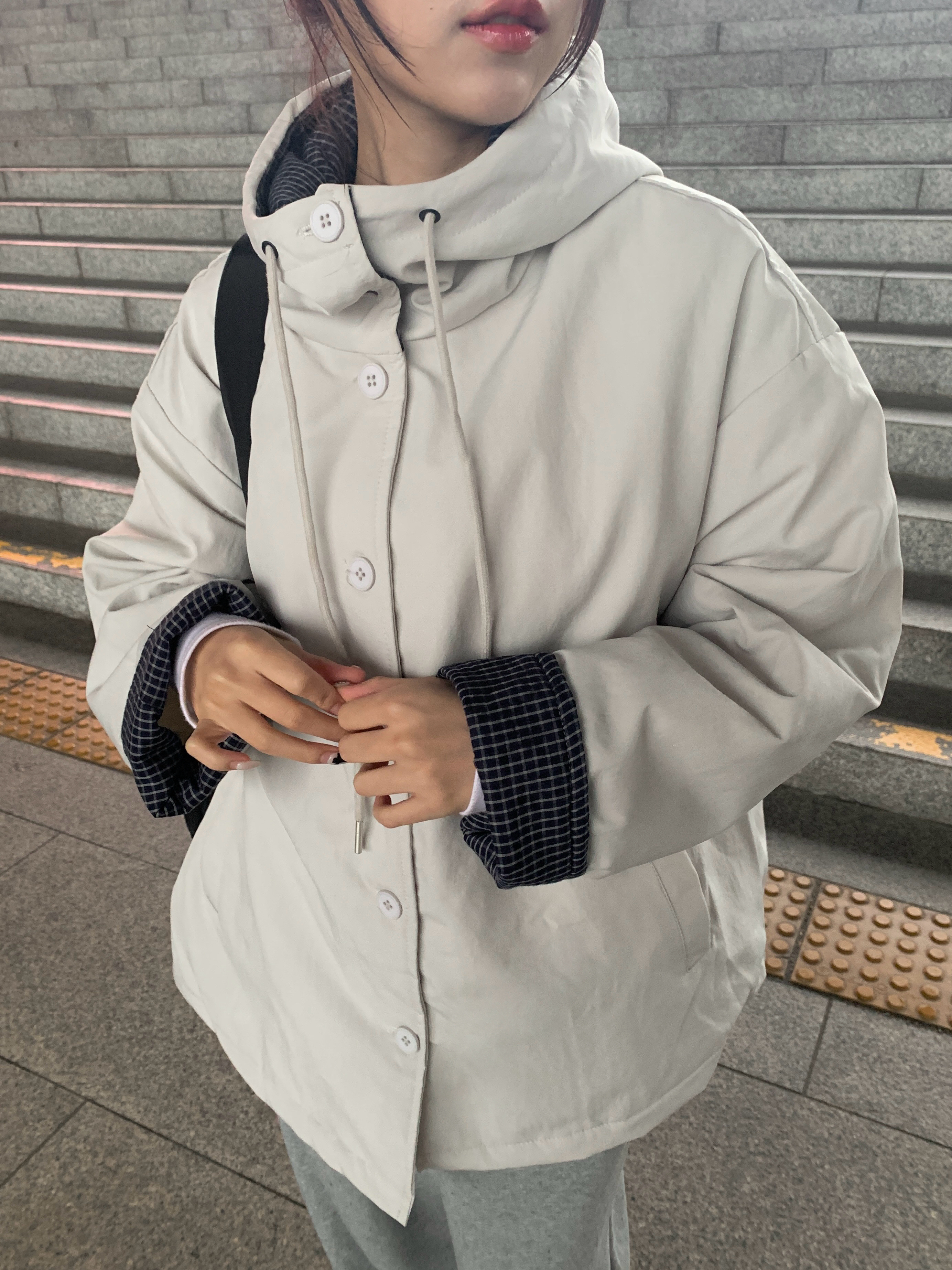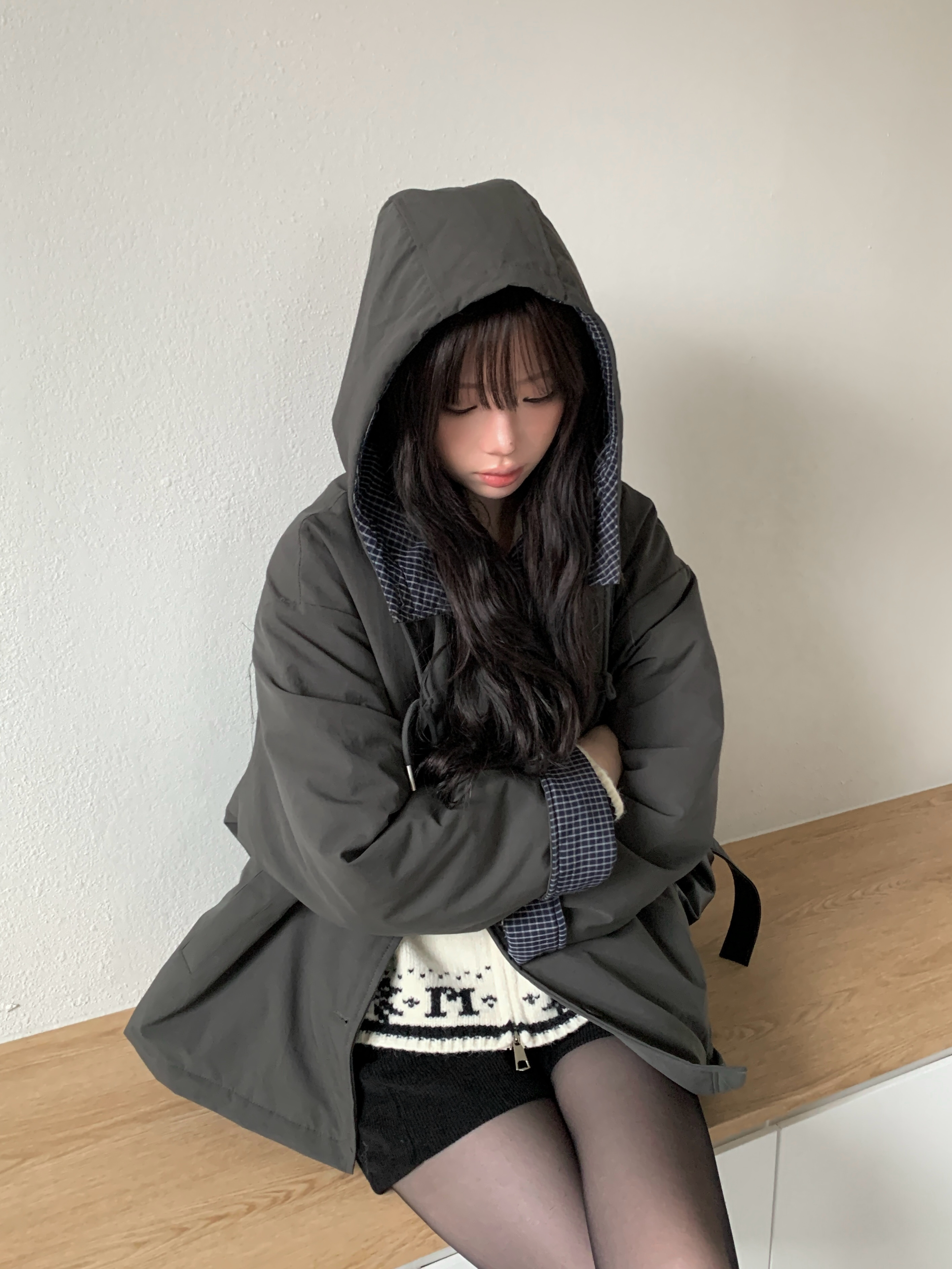 チェック配色オーバーサイズフードダウンブルゾン