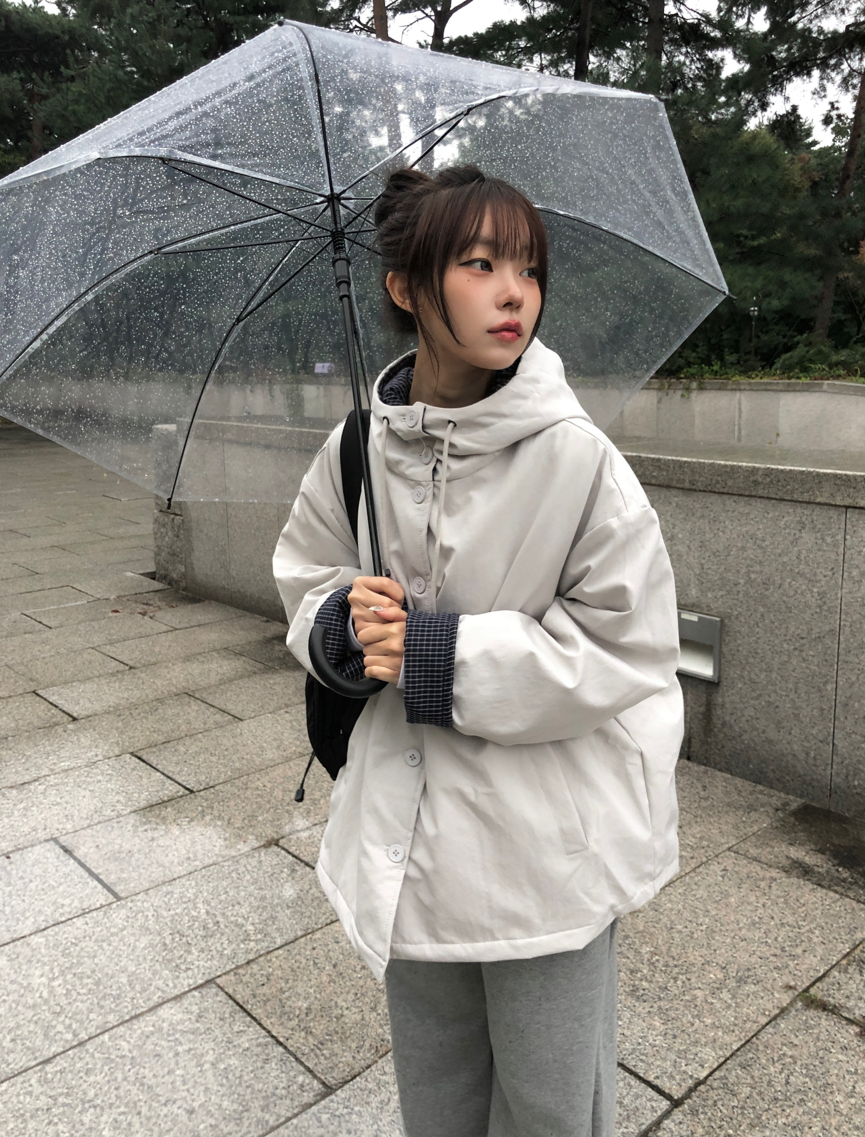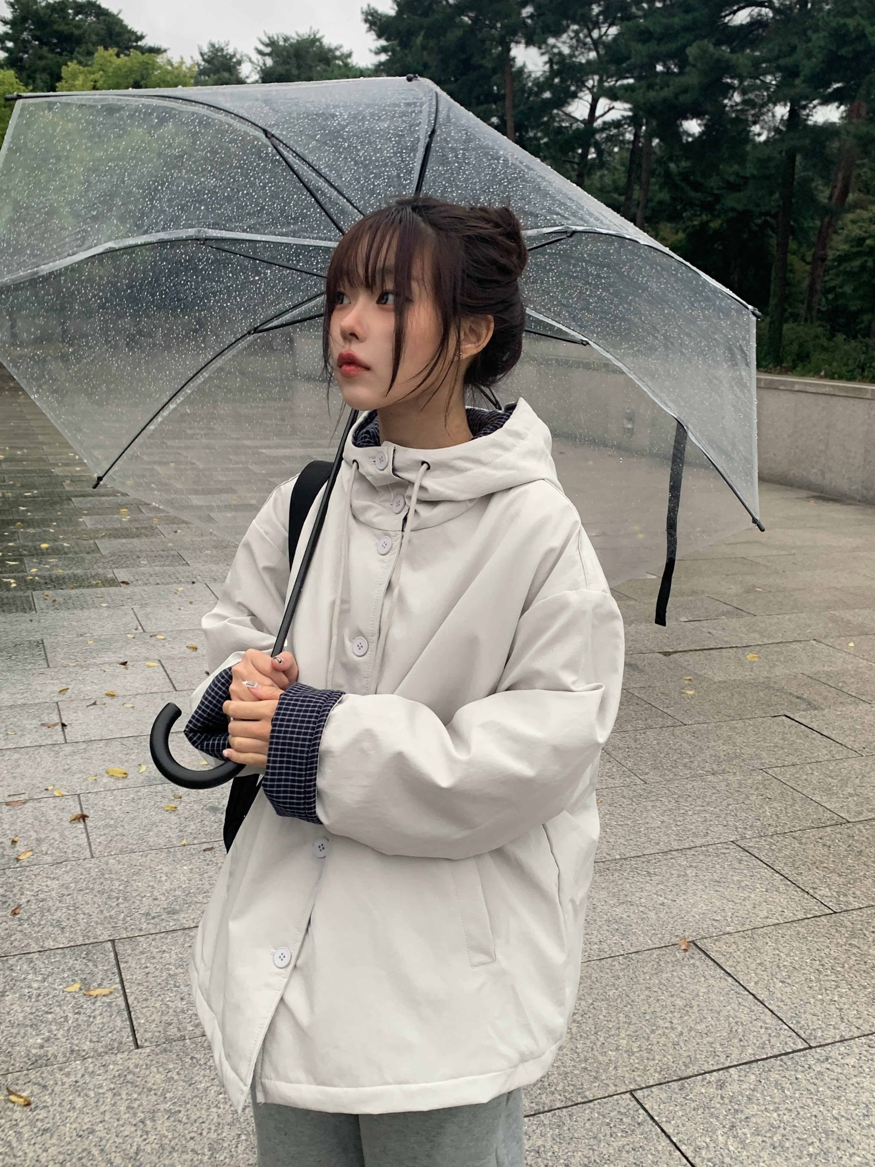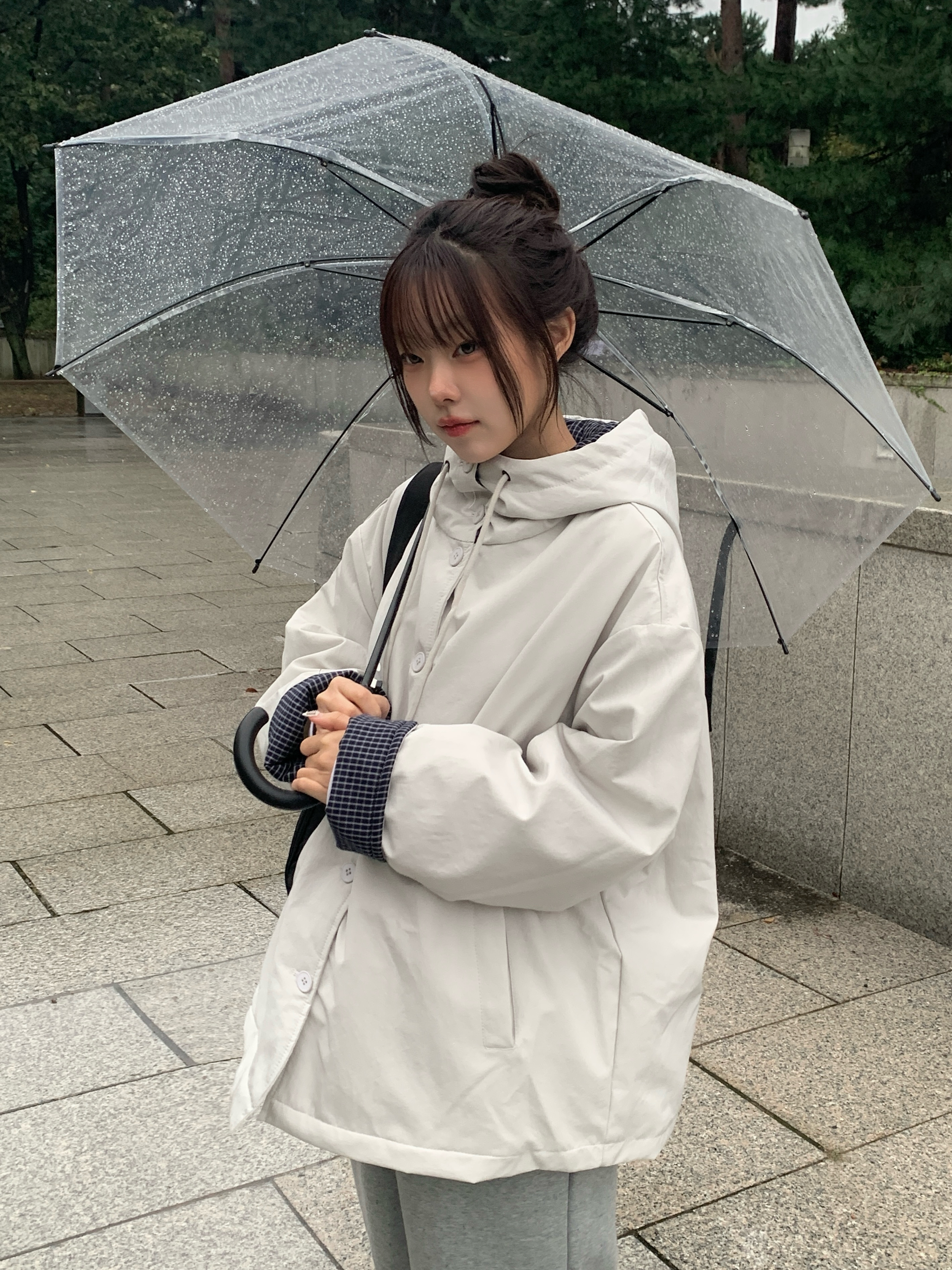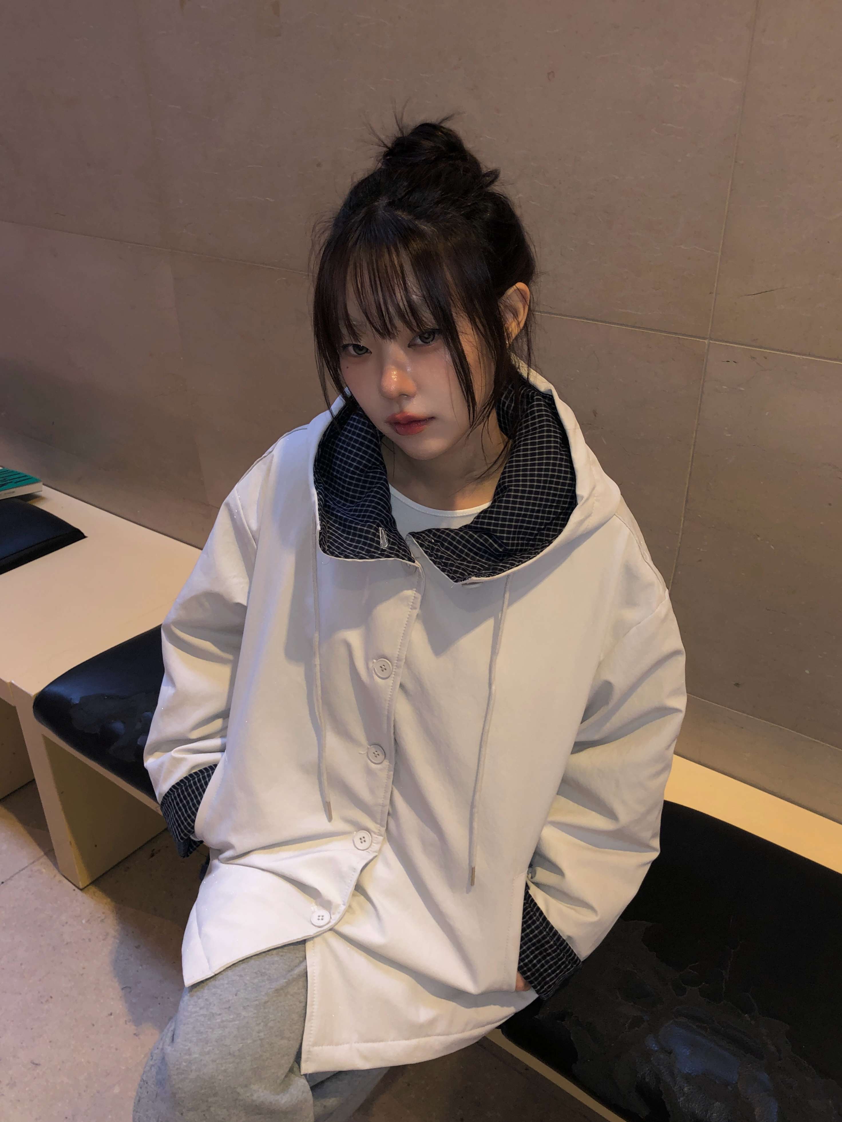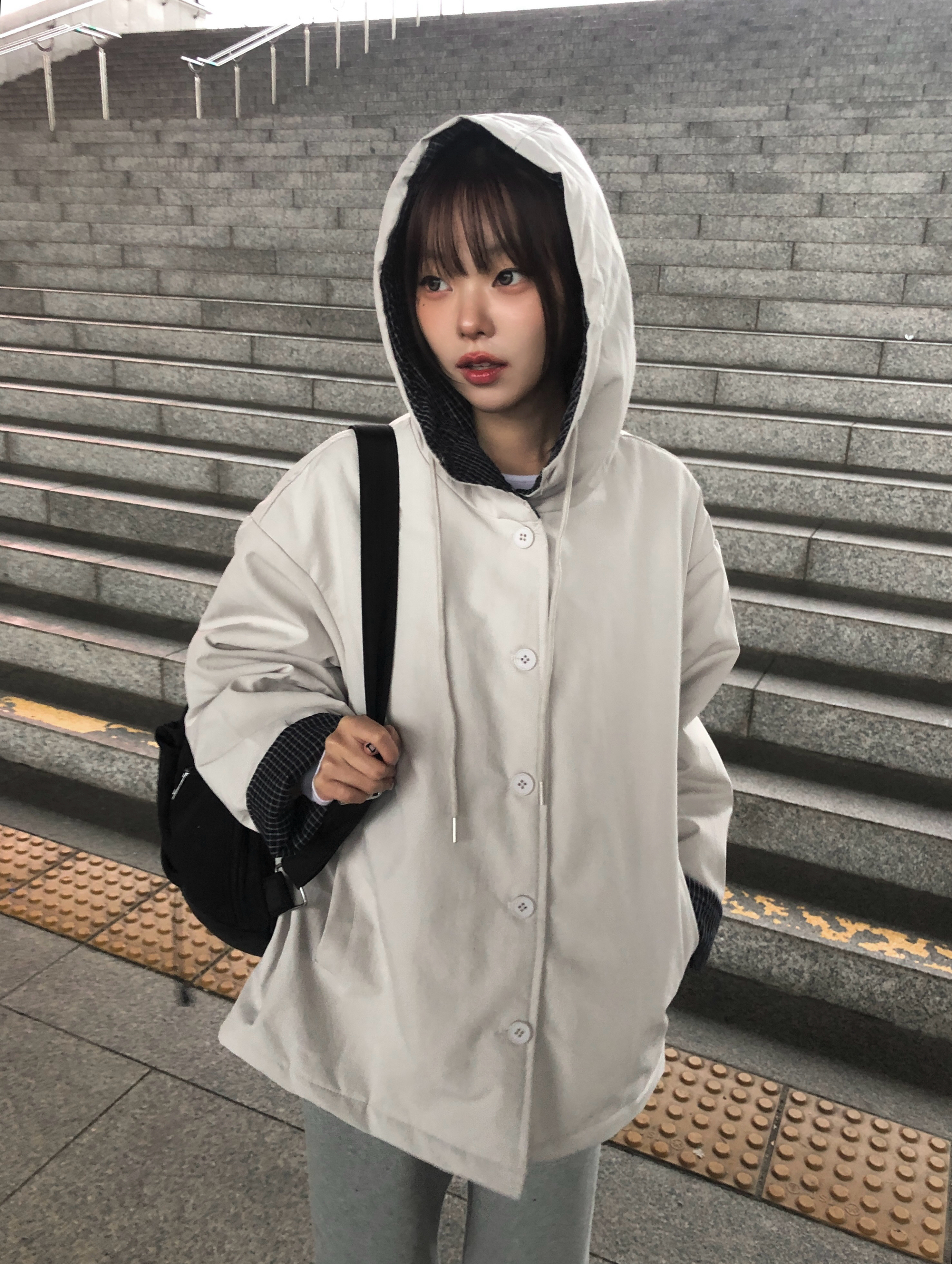 チェック配色オーバーサイズフードダウンブルゾン