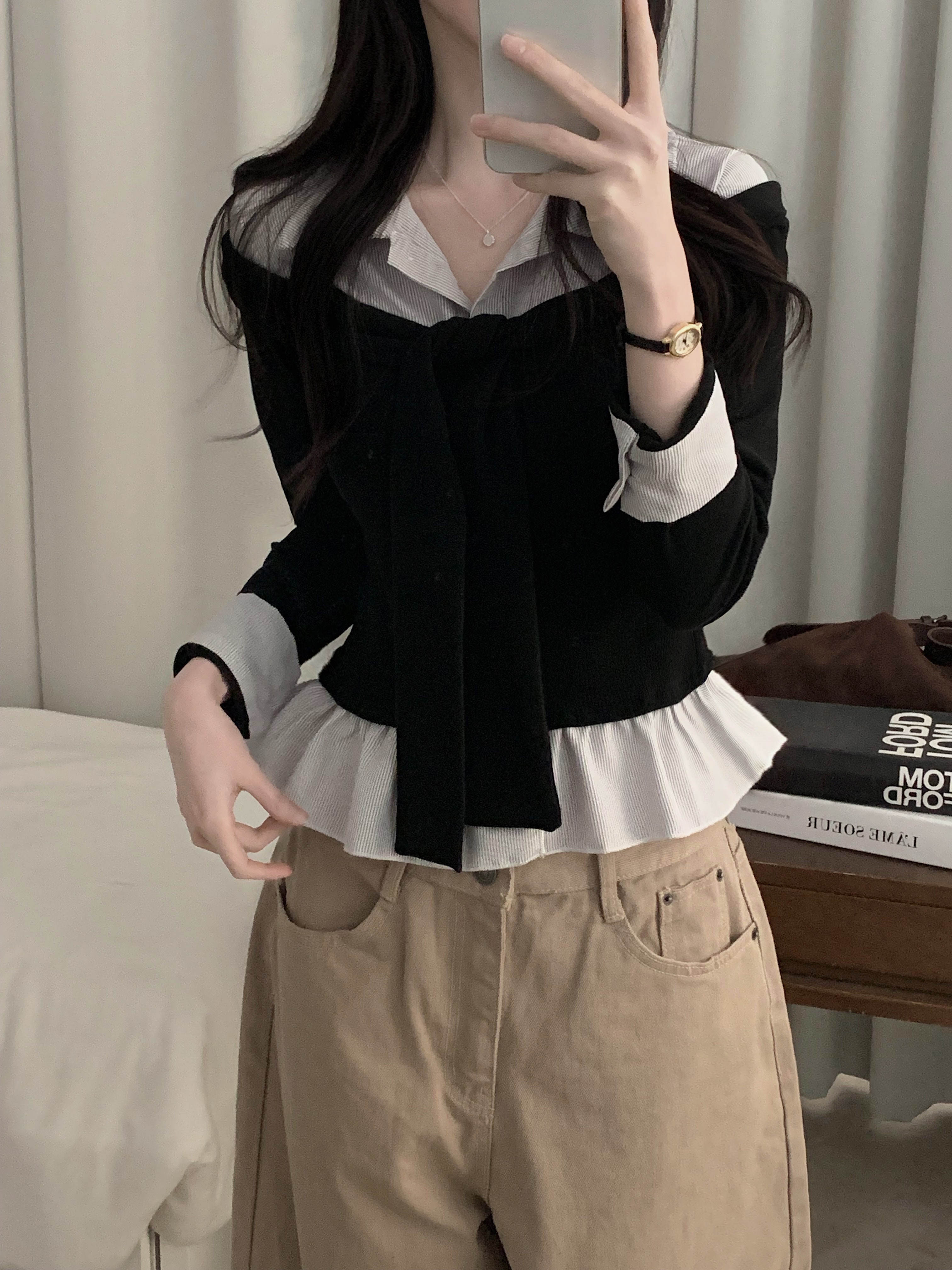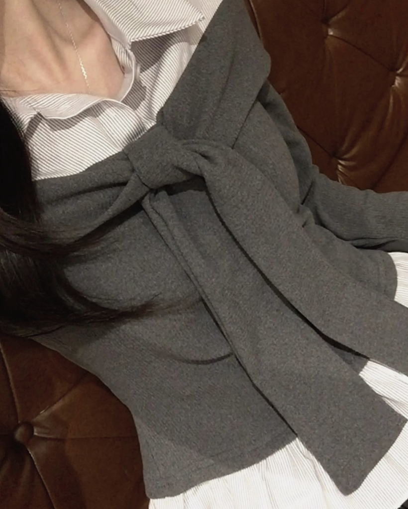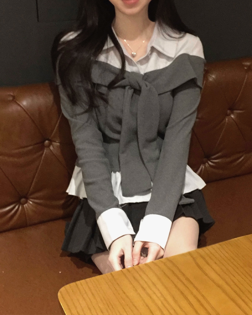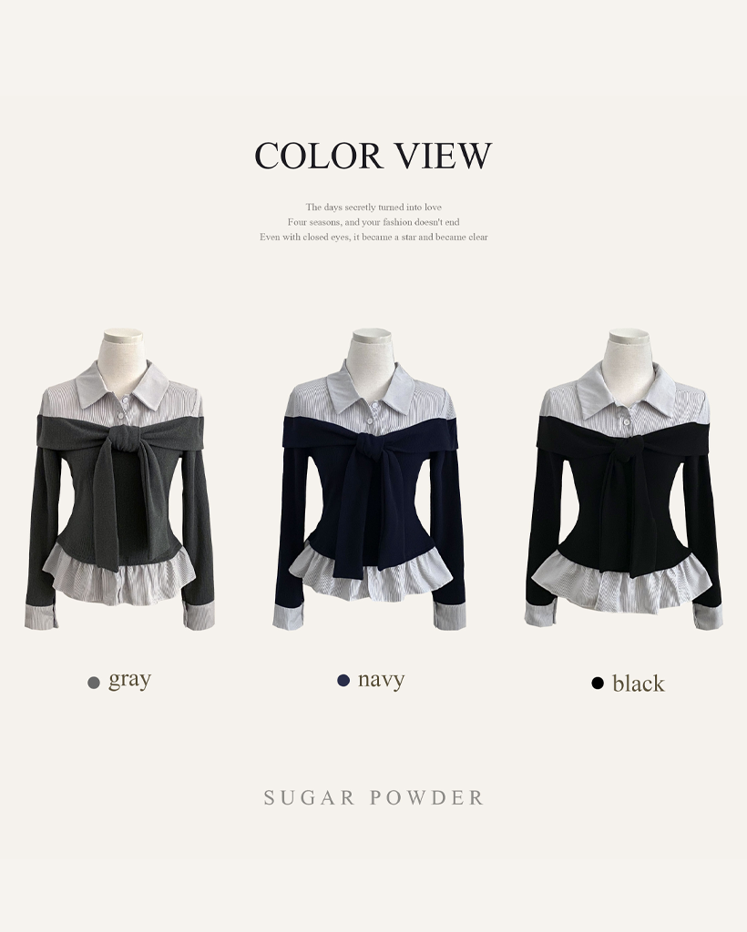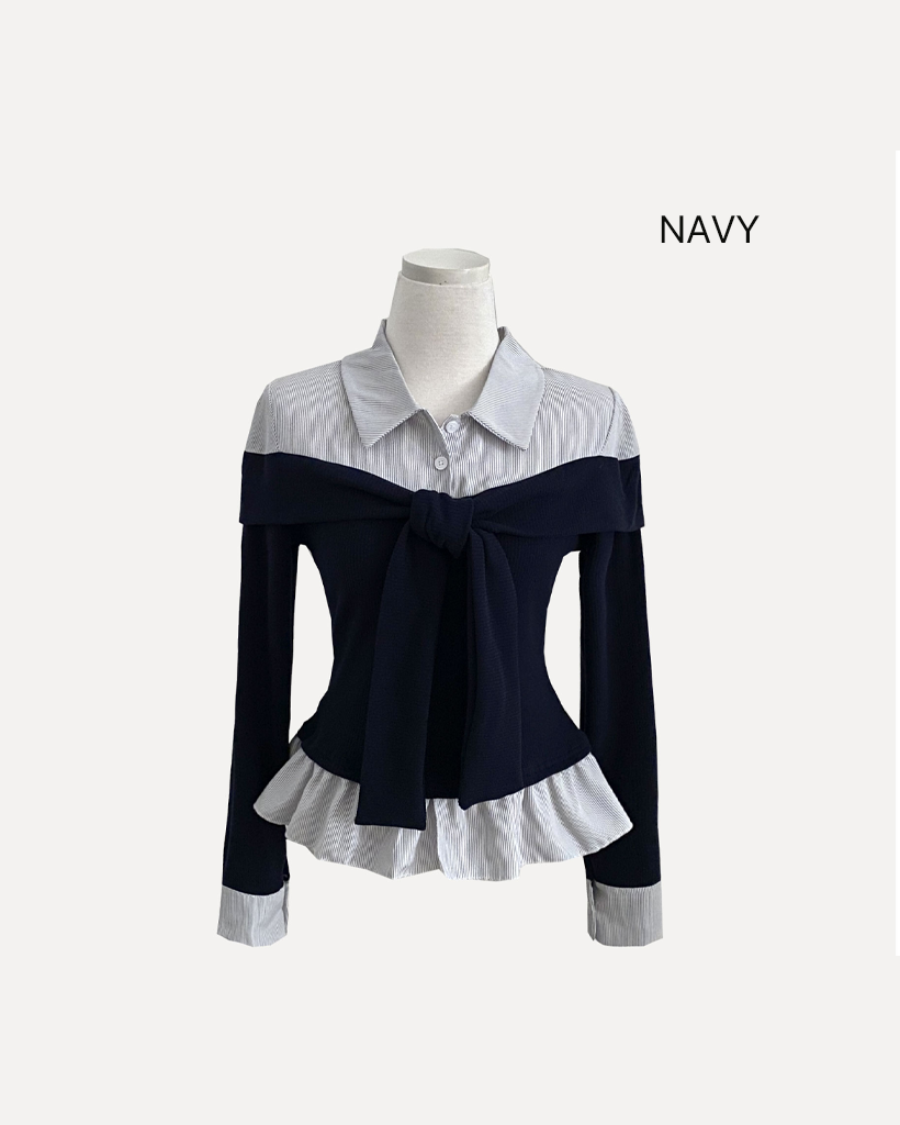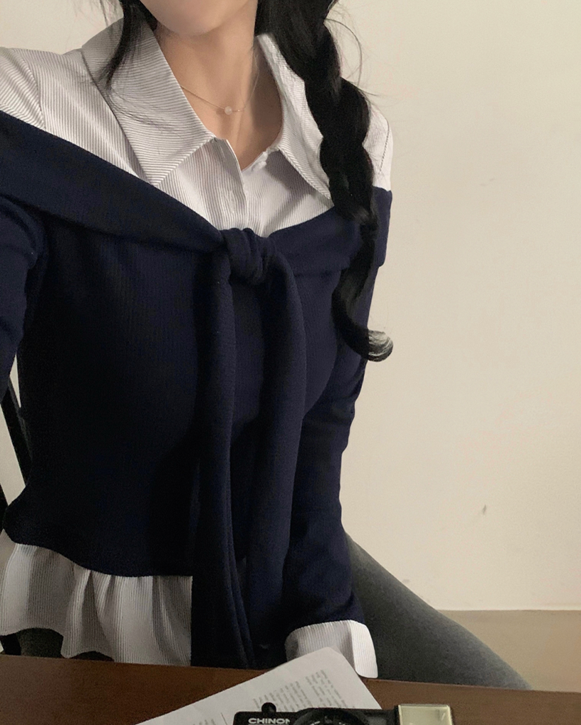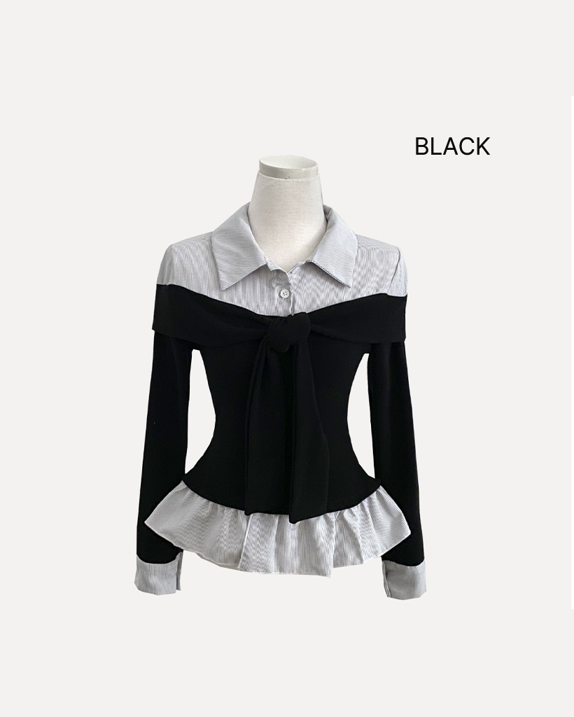 (3color) タイ リボン フリル レイヤード ドッキング シャツ Tシャツ トップス