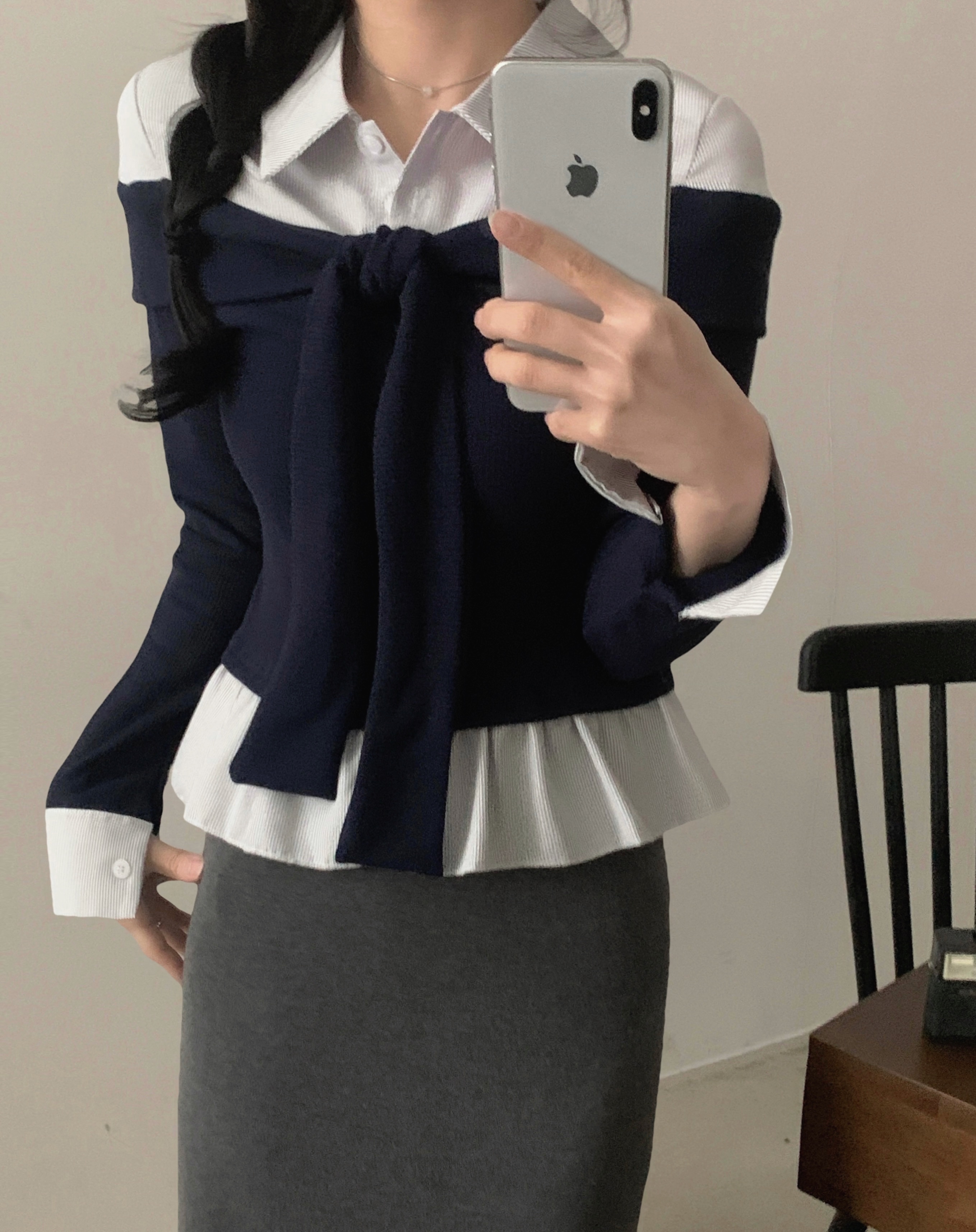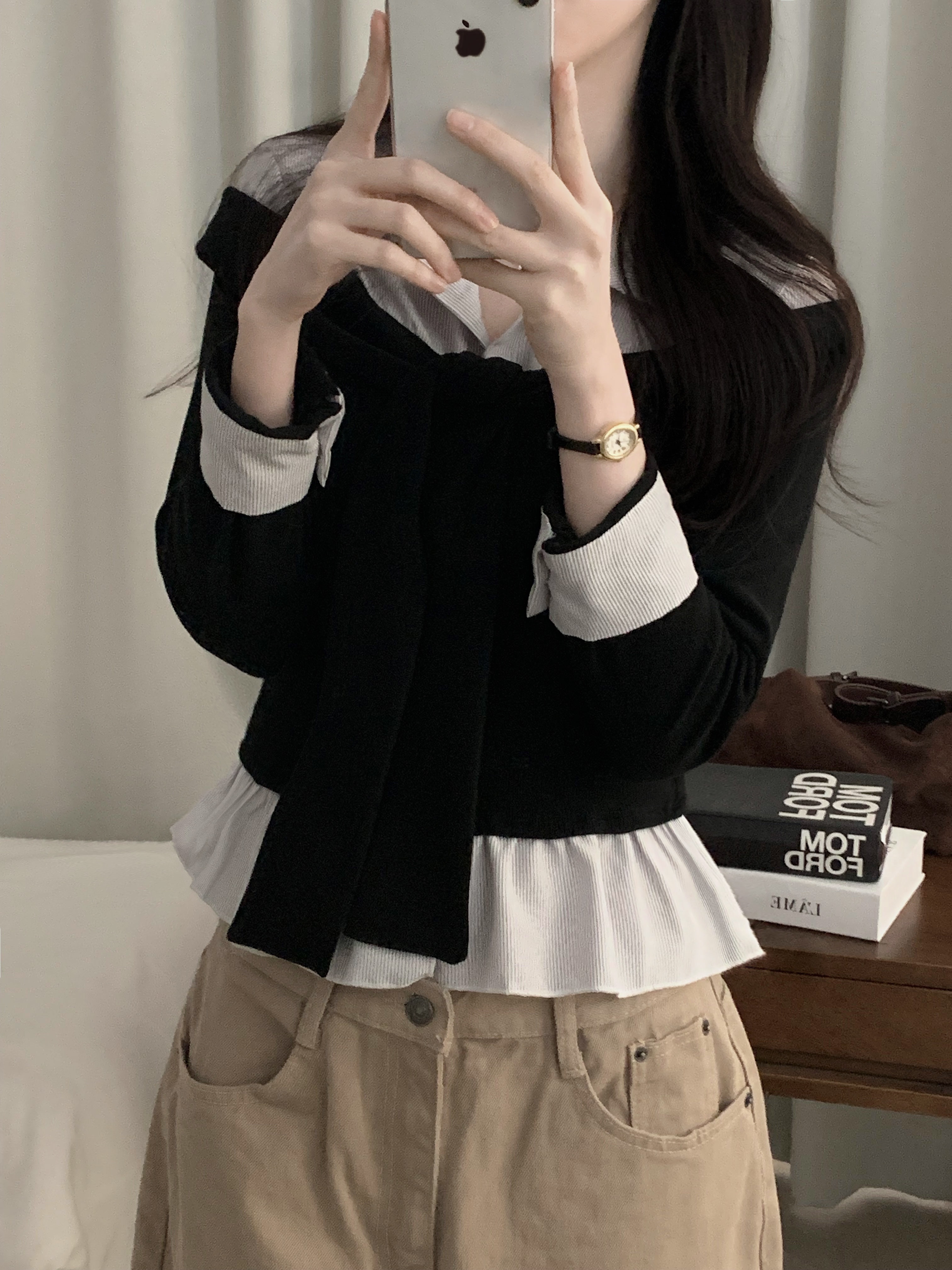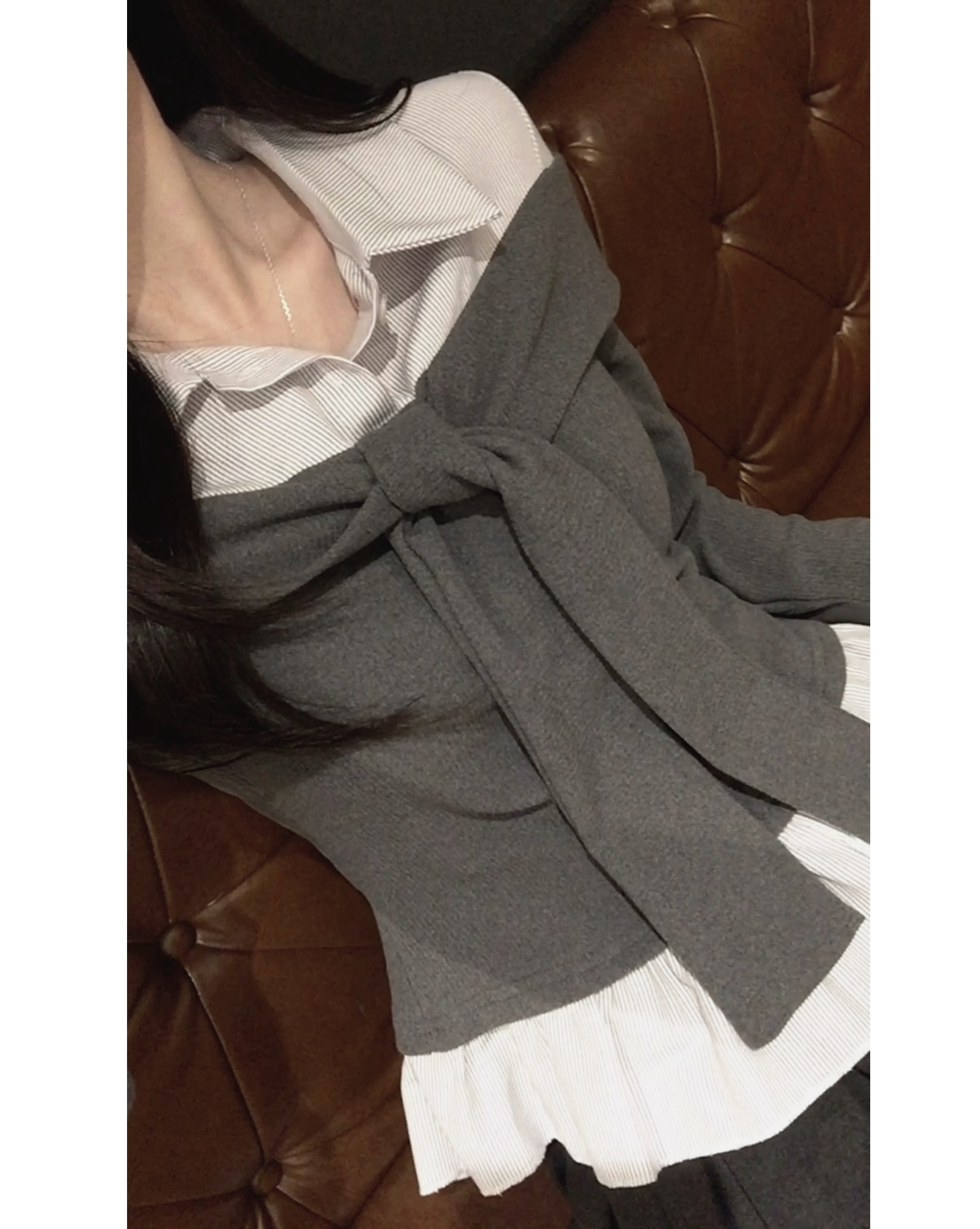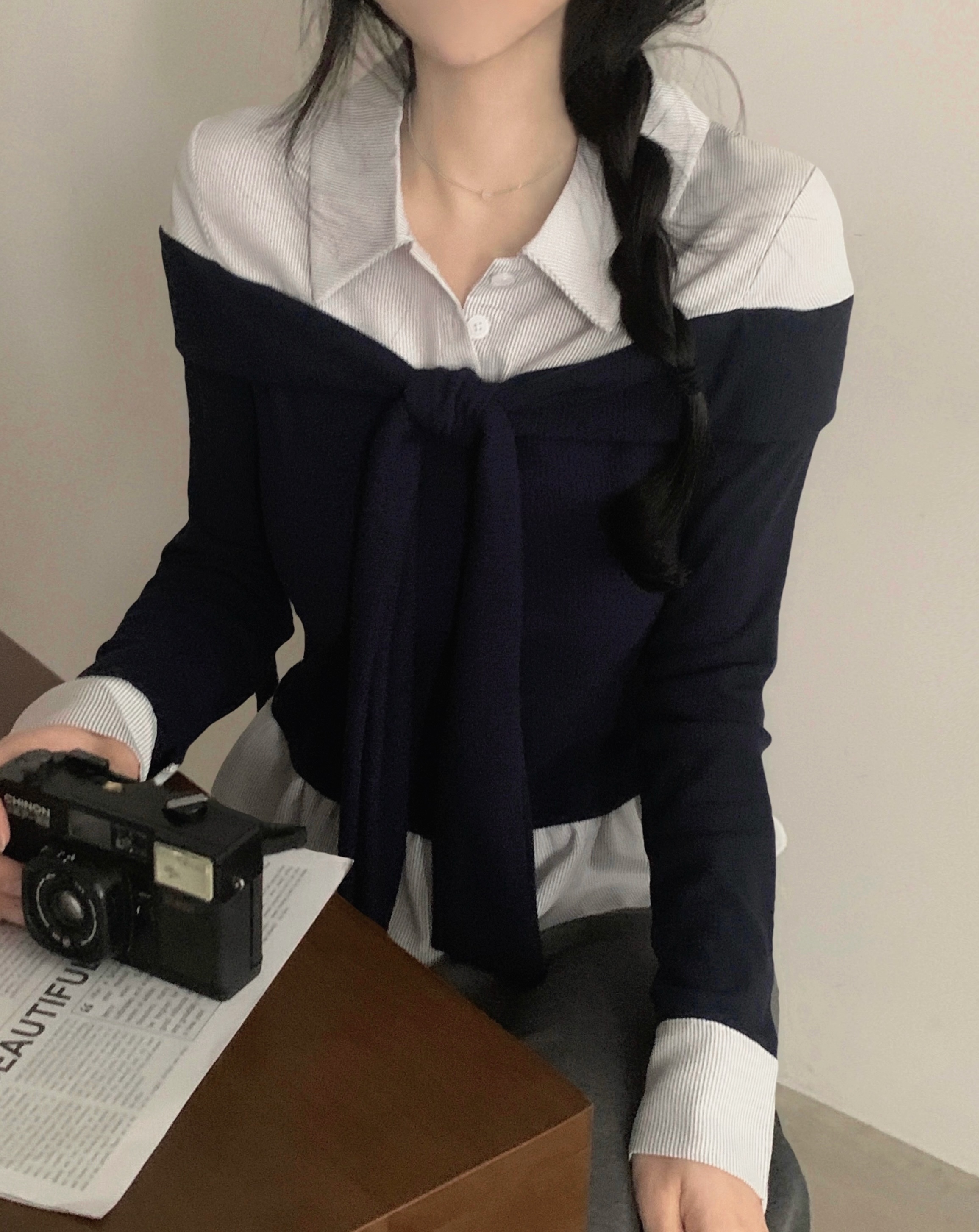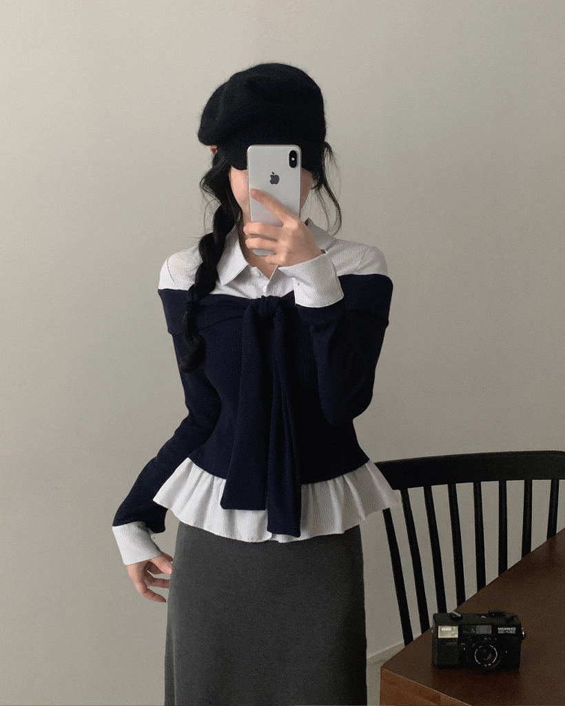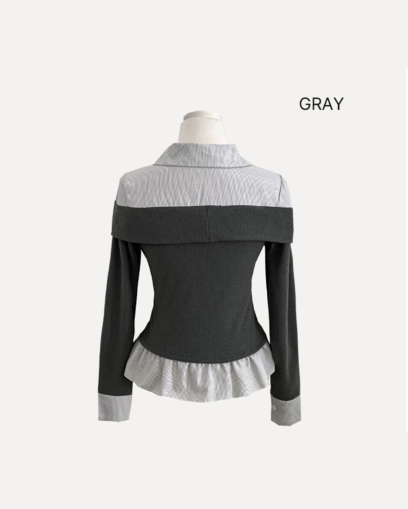 (3color) タイ リボン フリル レイヤード ドッキング シャツ Tシャツ トップス