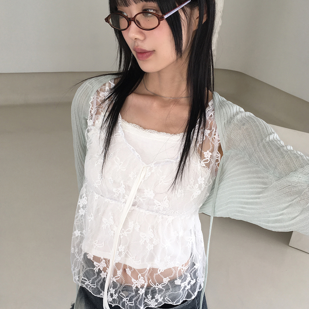レースステッチフリルリボンノースリーブビスチェ