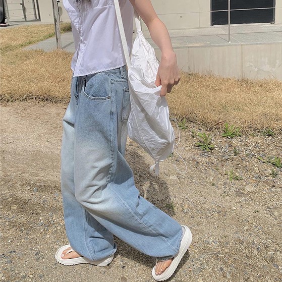 ウォッシングライトブルーデニムロングワイドパンツ