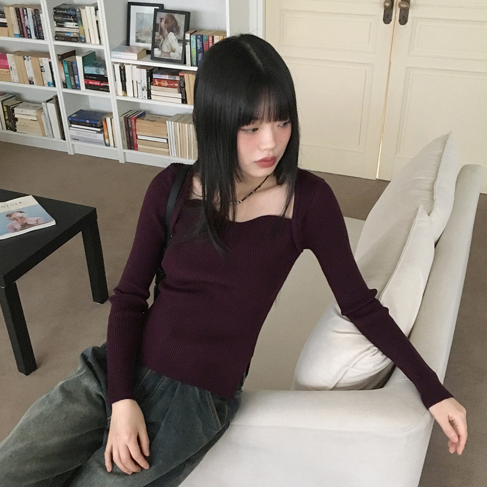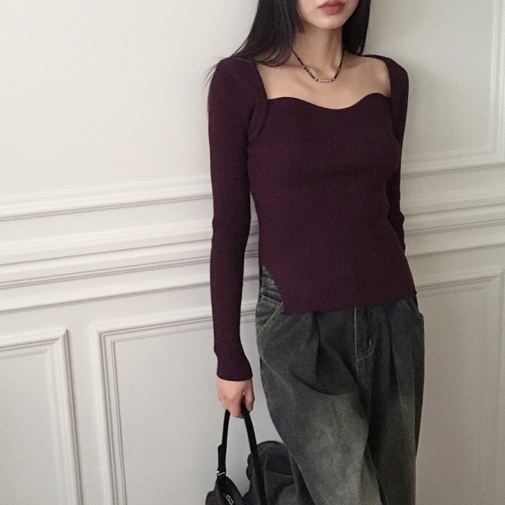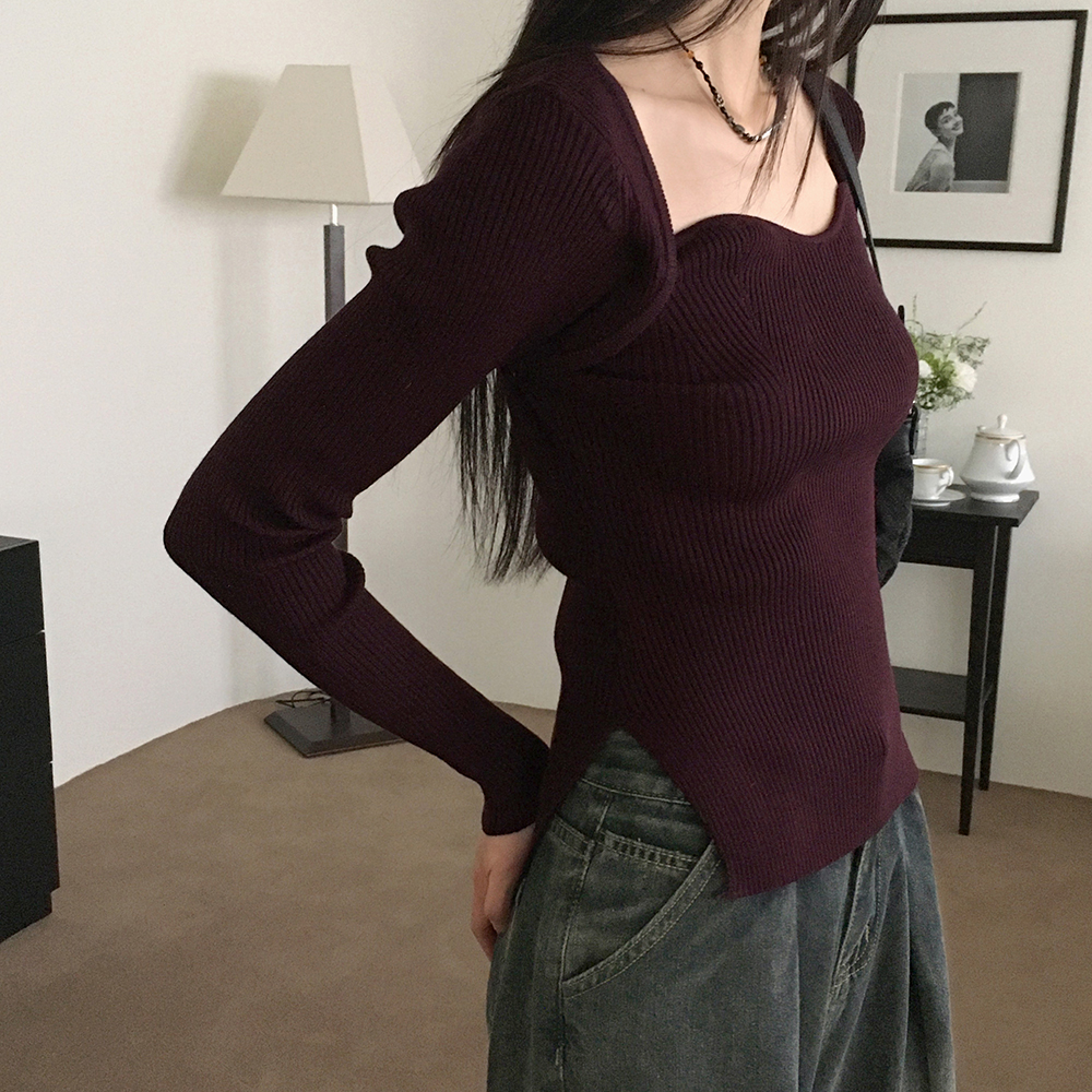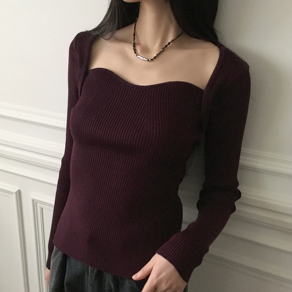 ボレロスリットリブウェーブスクエアネック長袖ニット