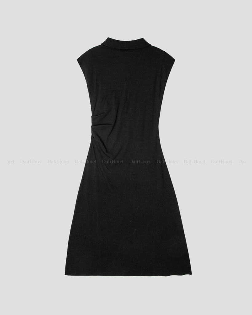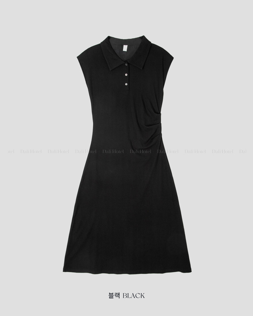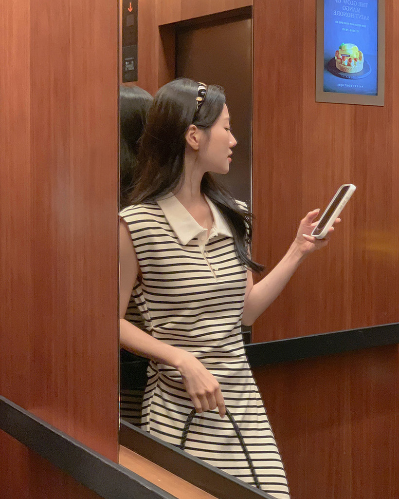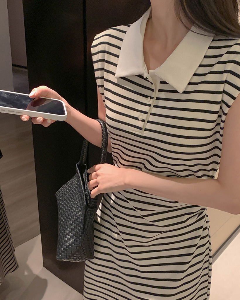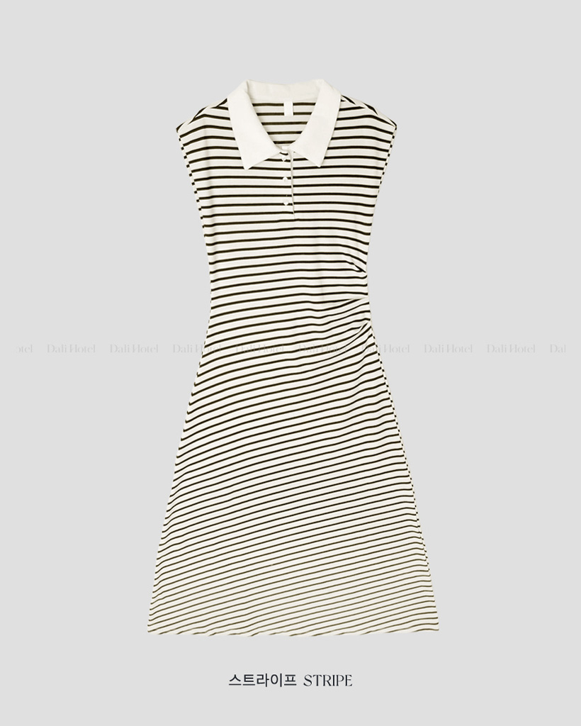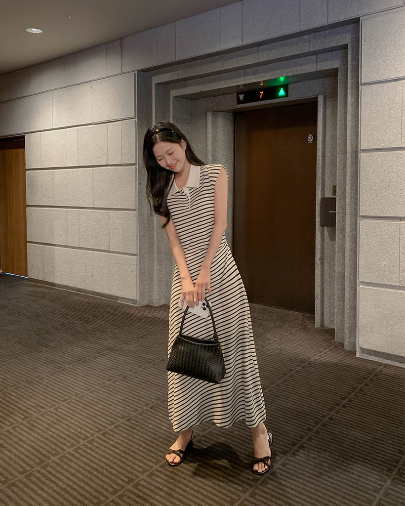 (black/stripe) 襟付き シャーリング Aライン ロング ワンピース