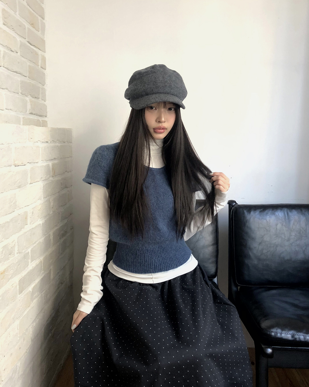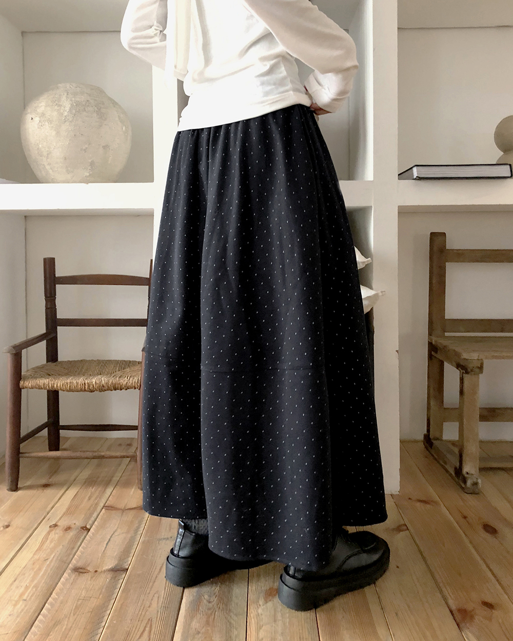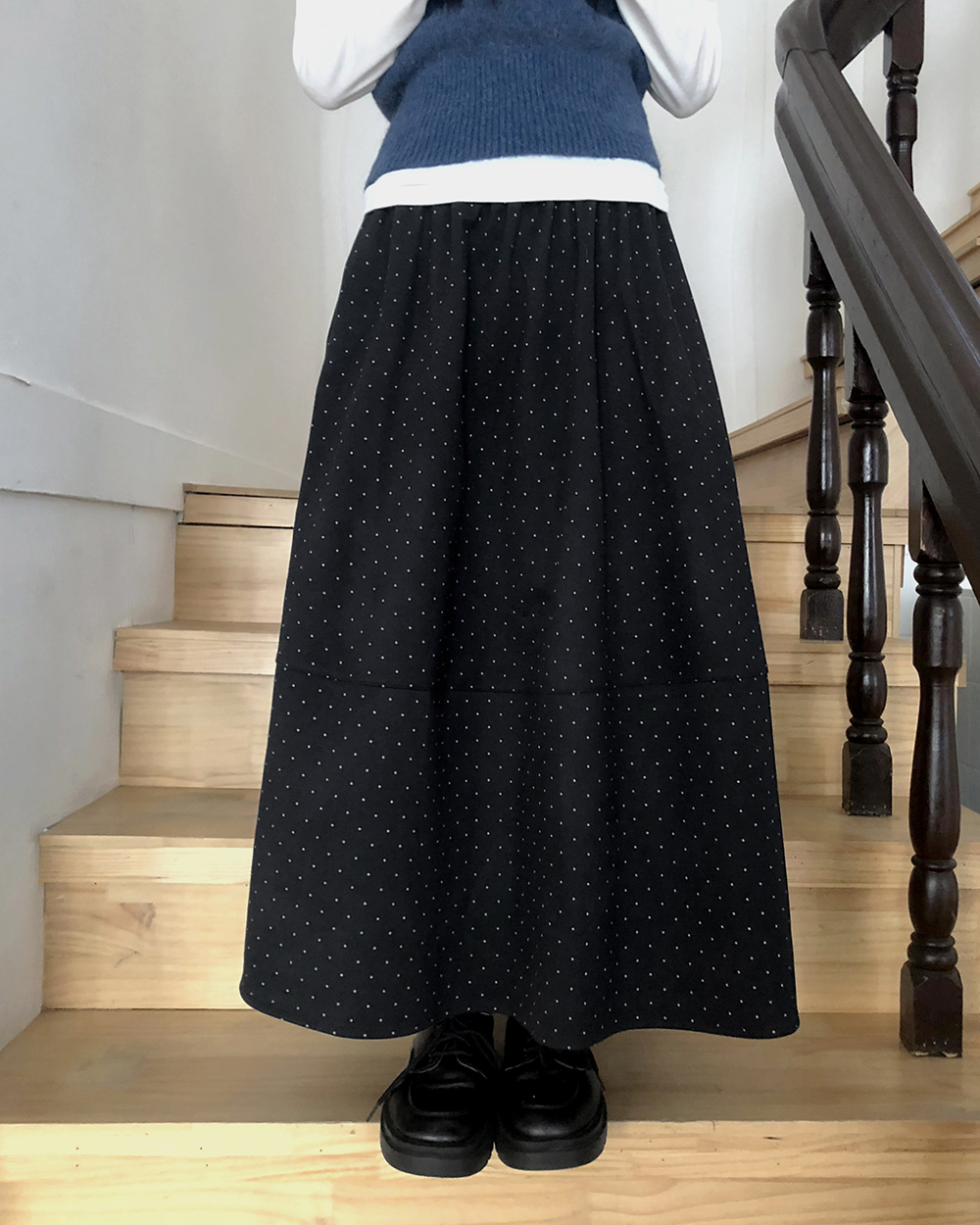 ドット柄フレアウエストゴムロングスカート