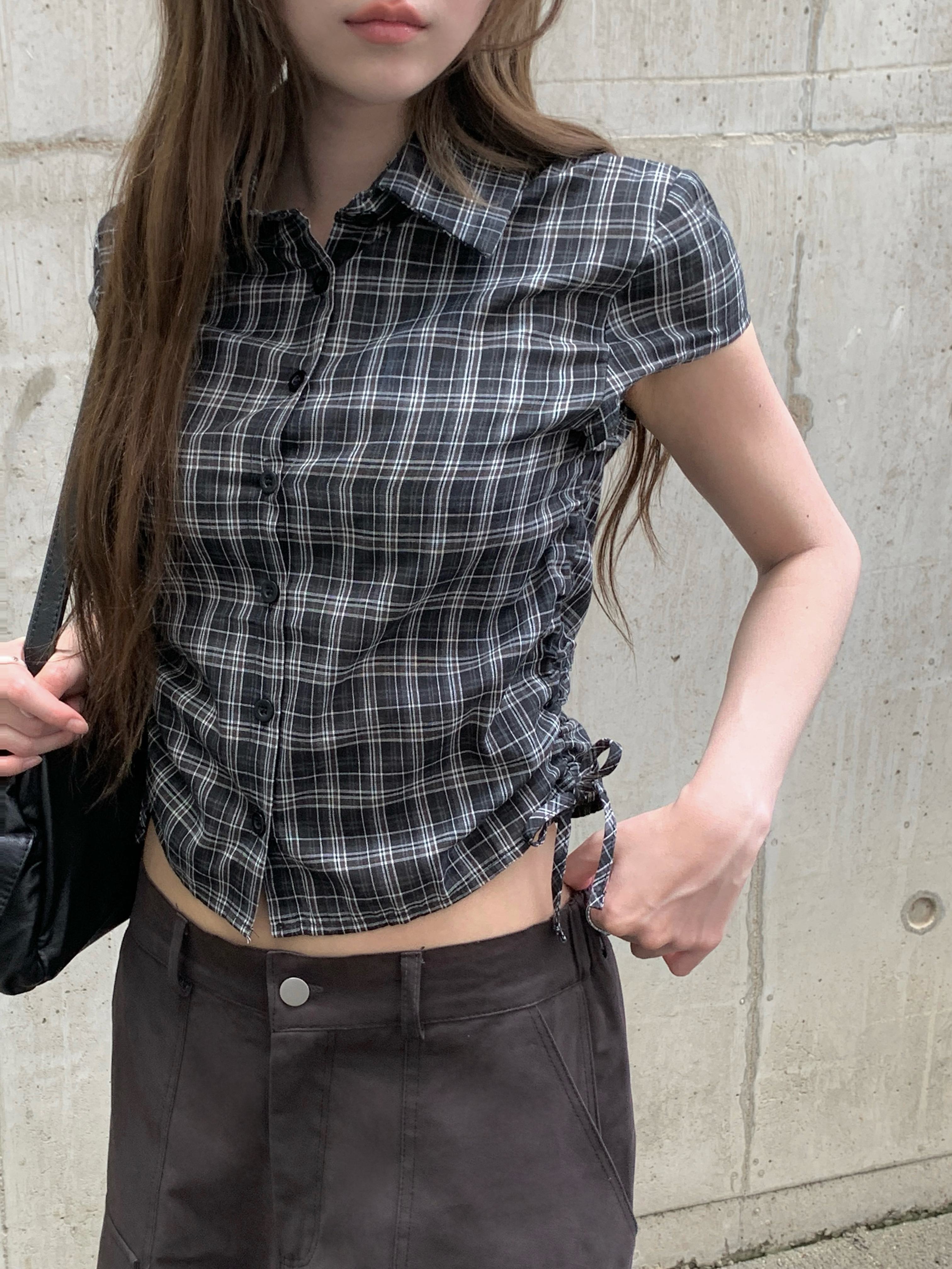 サイドギャザーチェック半袖シャツ