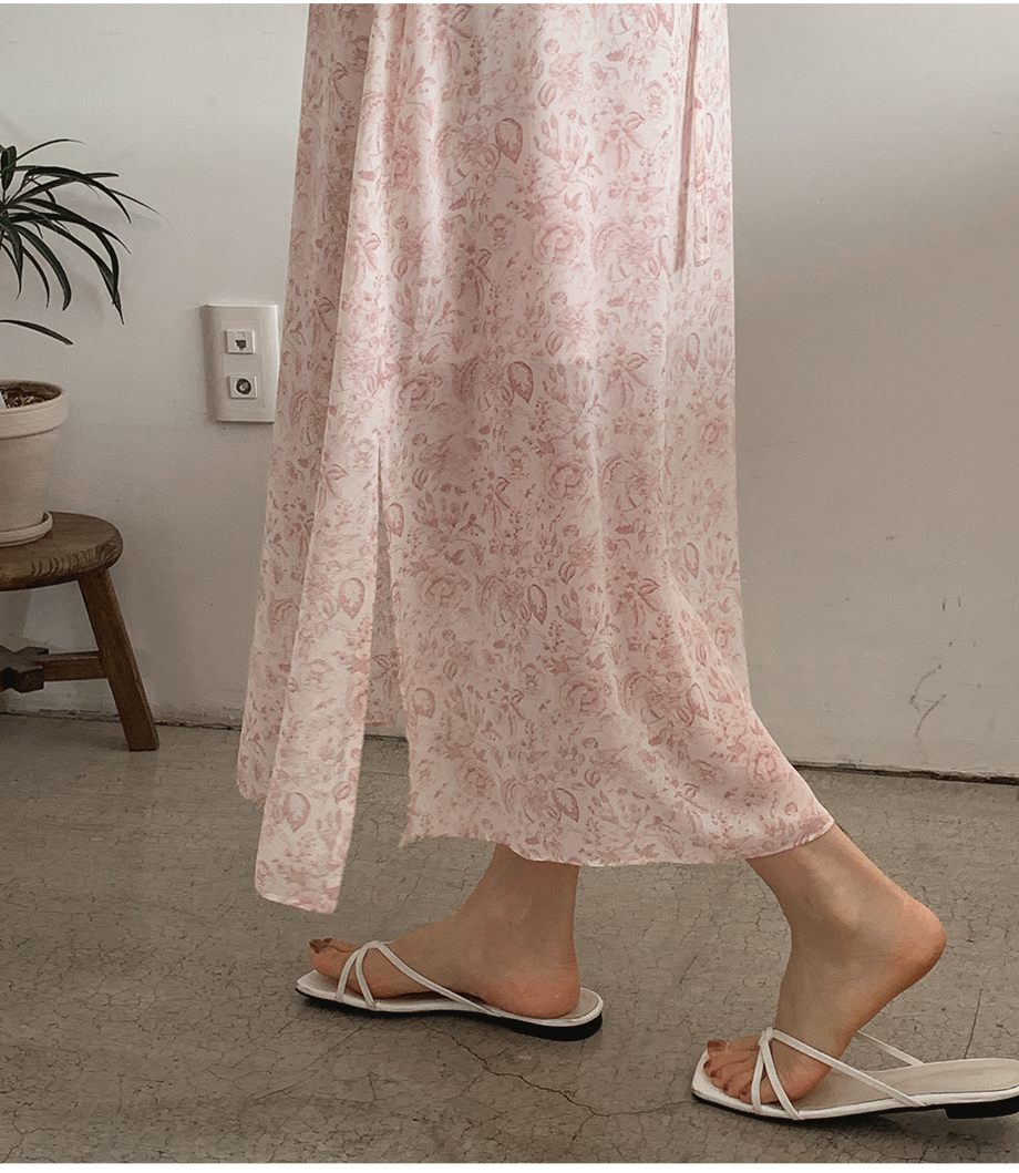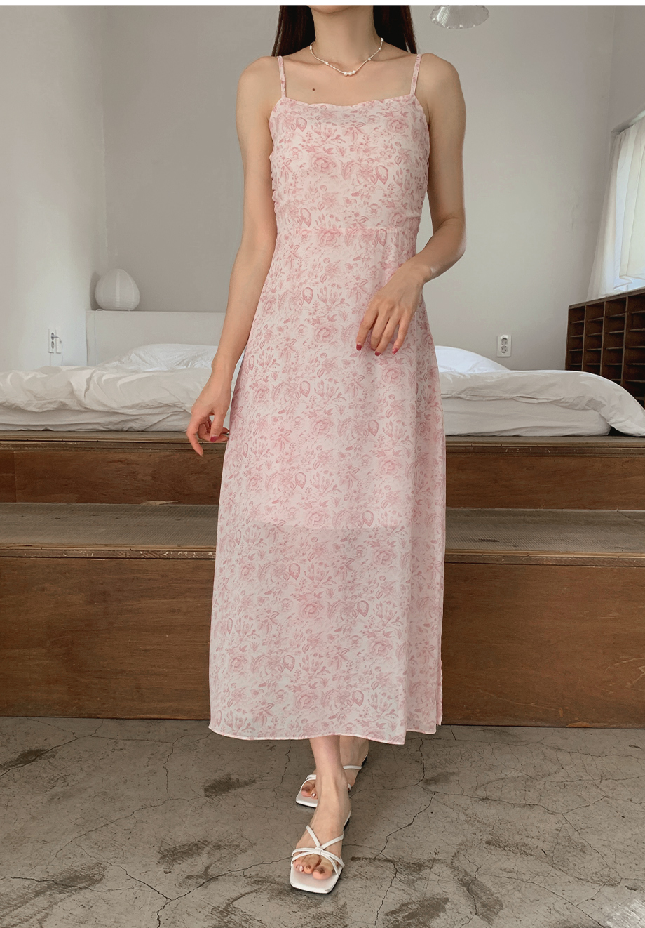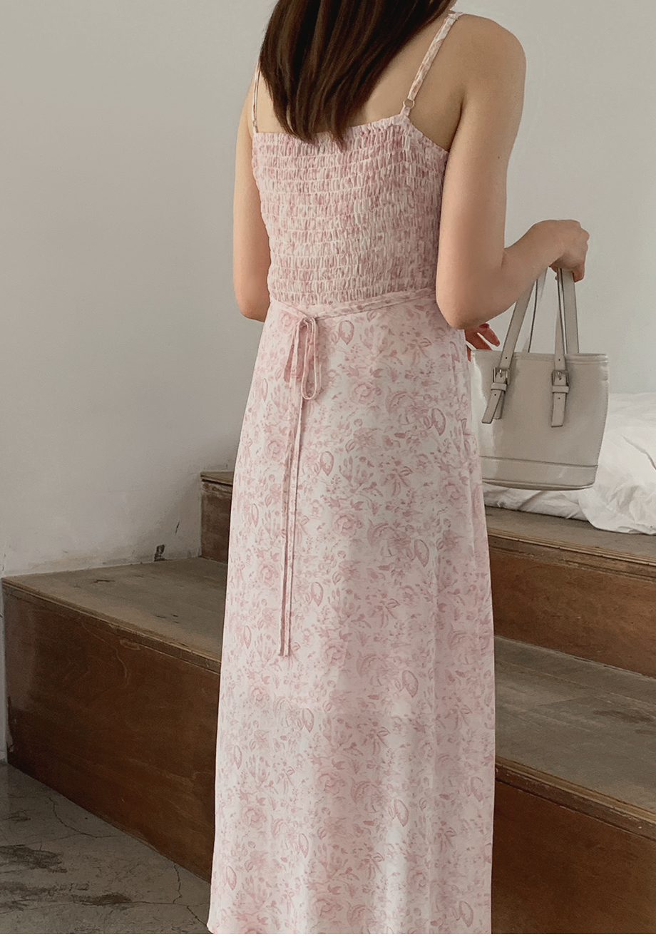 スモッキングバックリボンフラワーロングキャミドレスワンピース