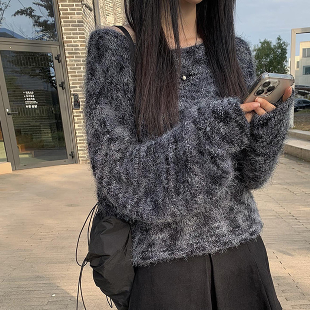 ボートネックアンゴラ風ニットトップス