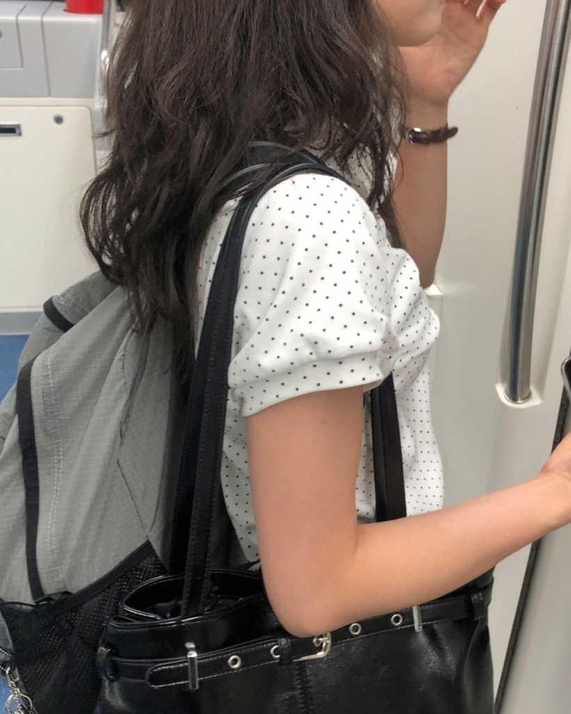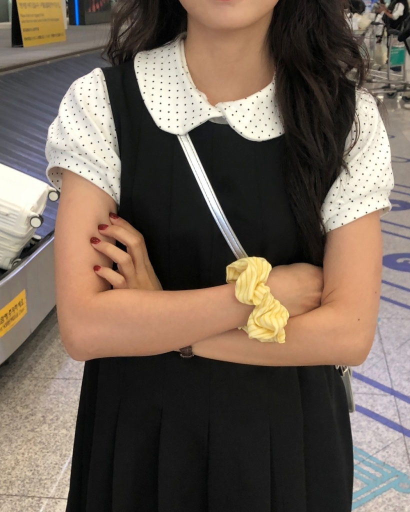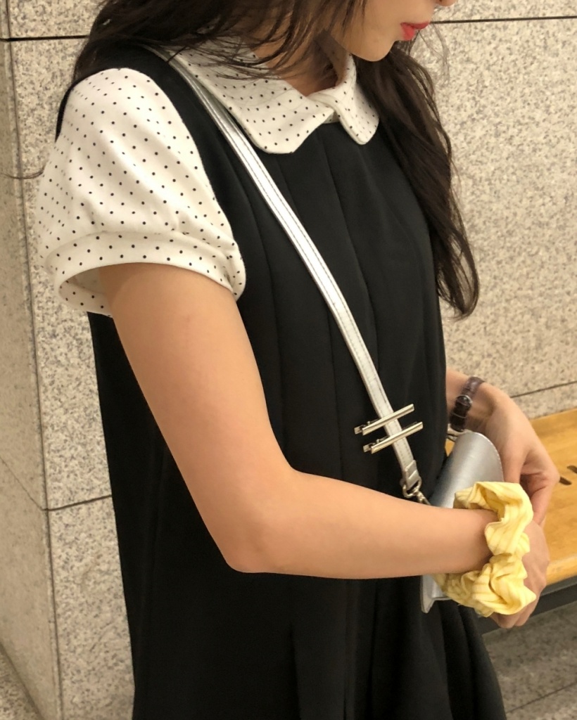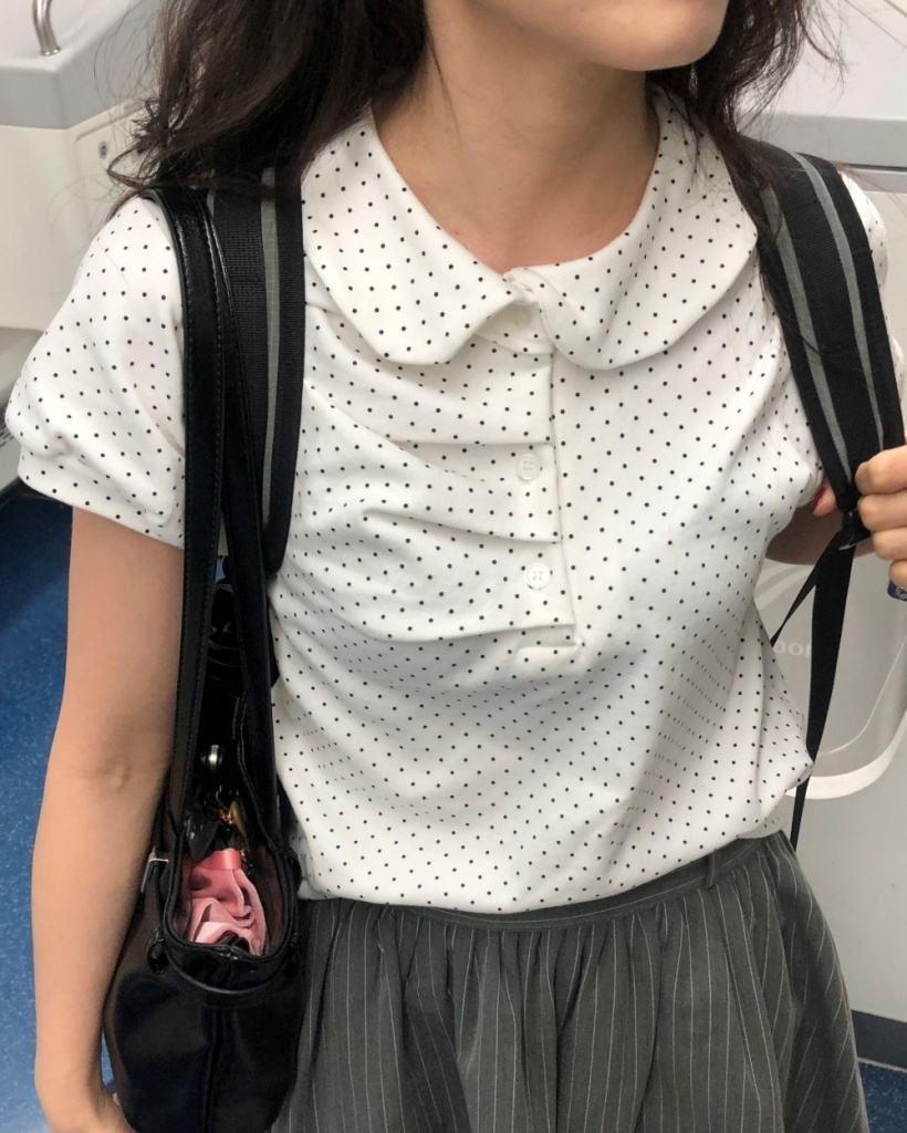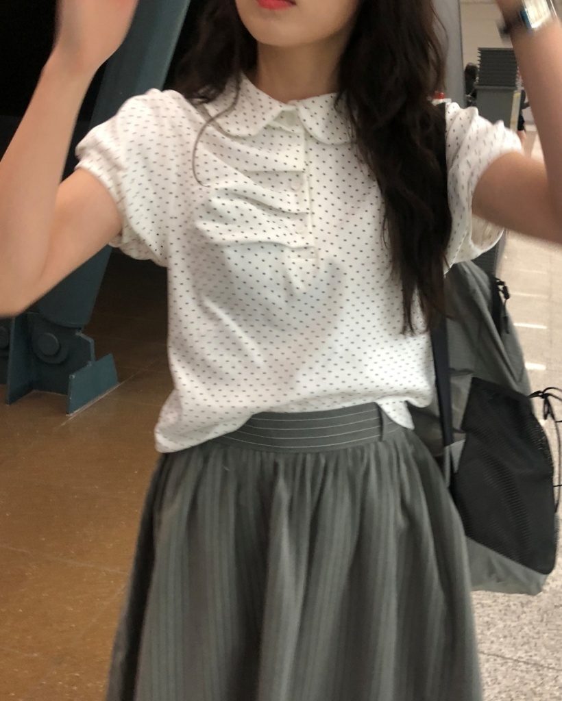 ラウンドネックドット柄シャーリング半袖ポロシャツ