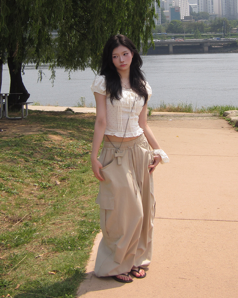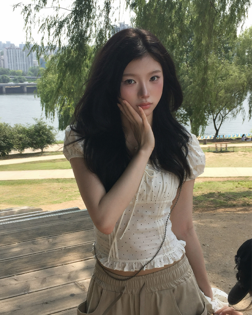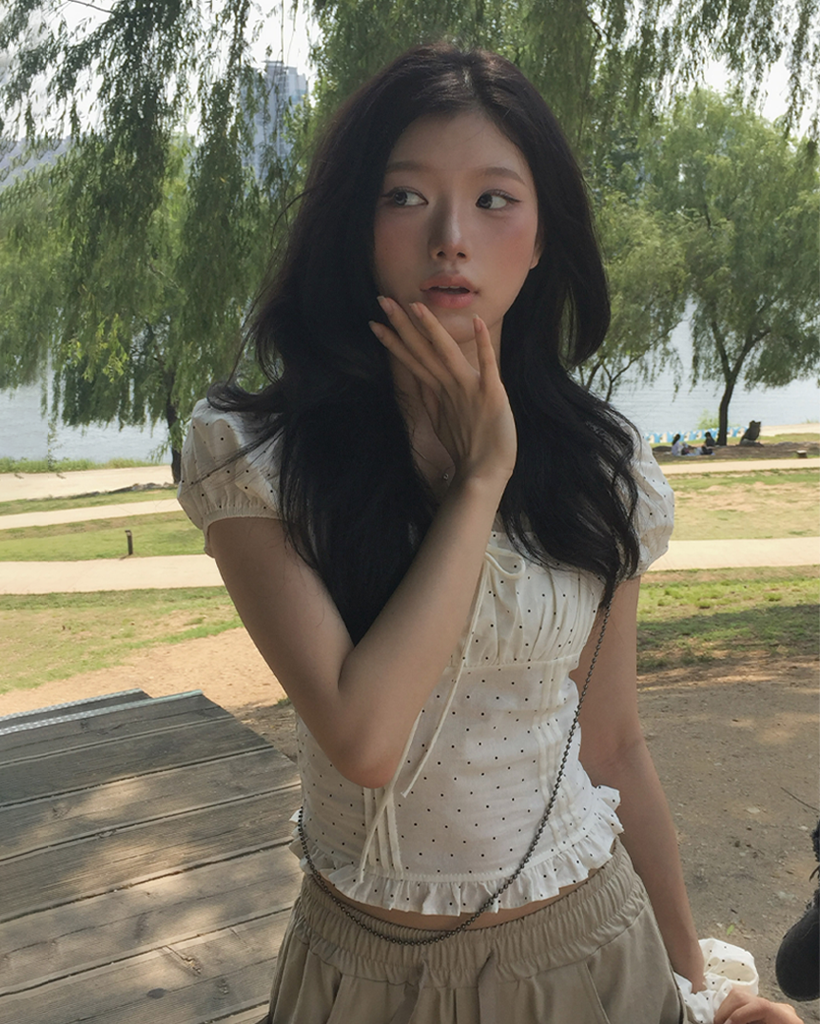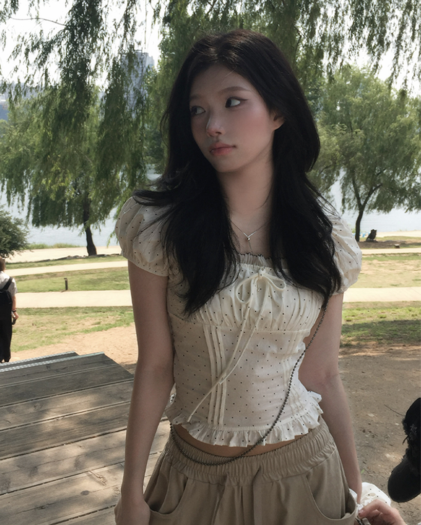 [シュシュセット] ドット 半袖 パフ ブラウス