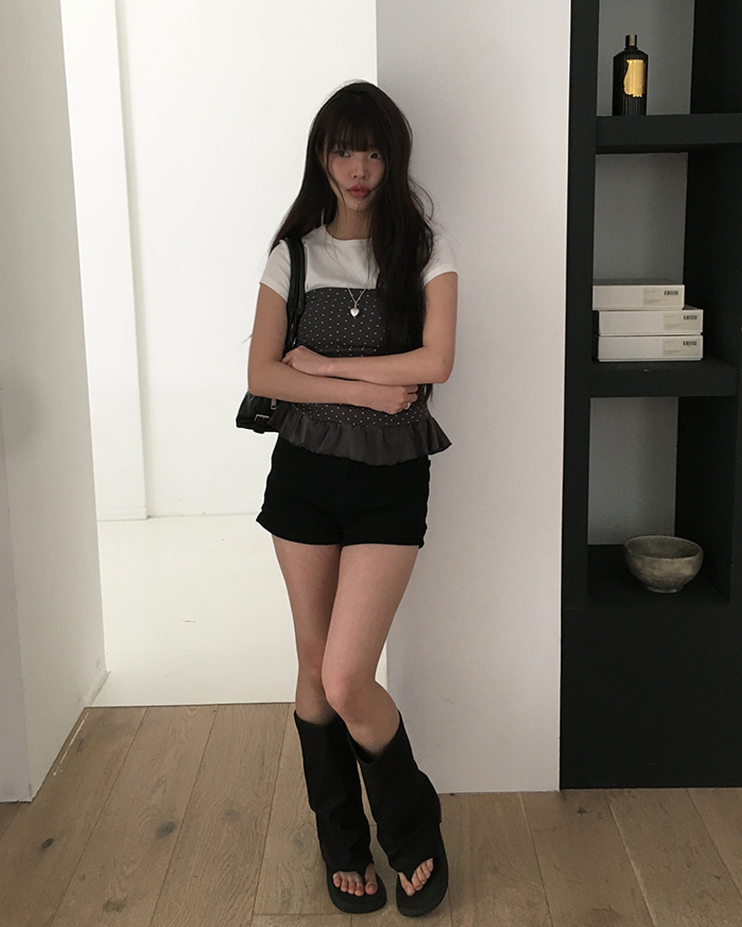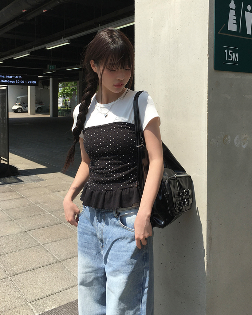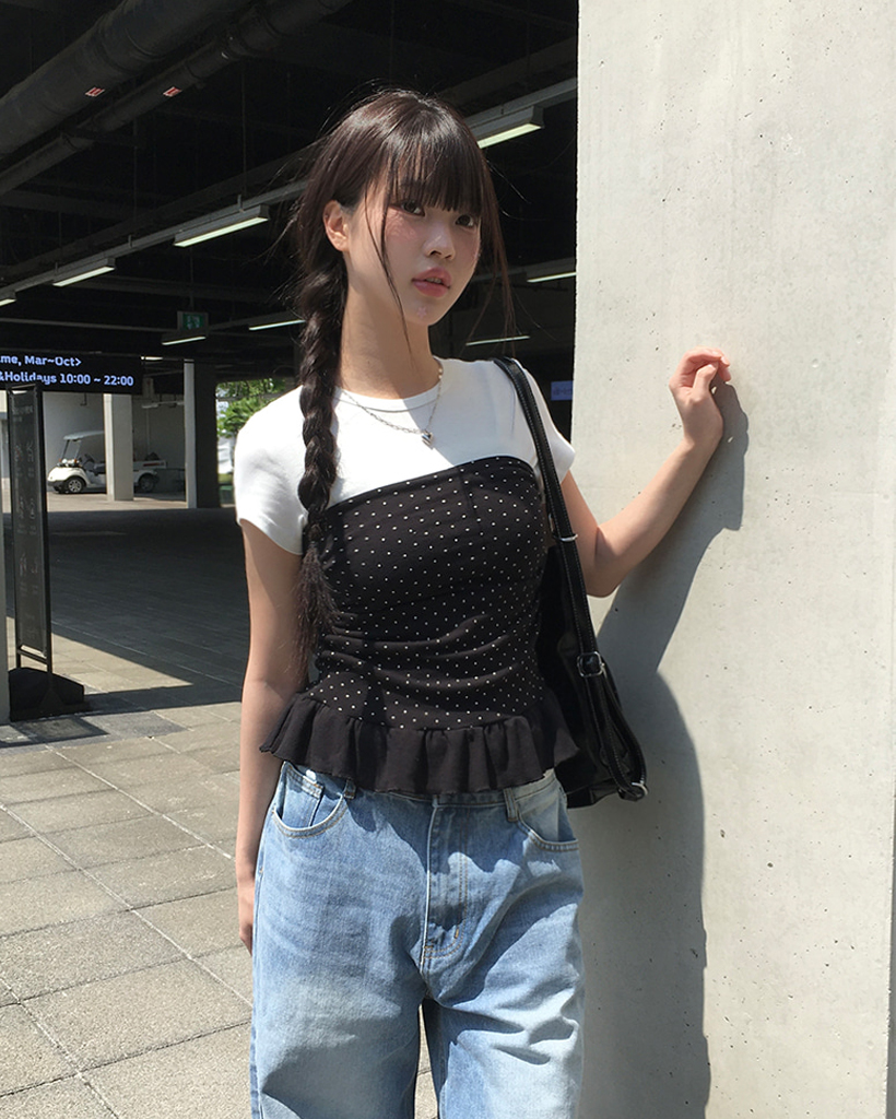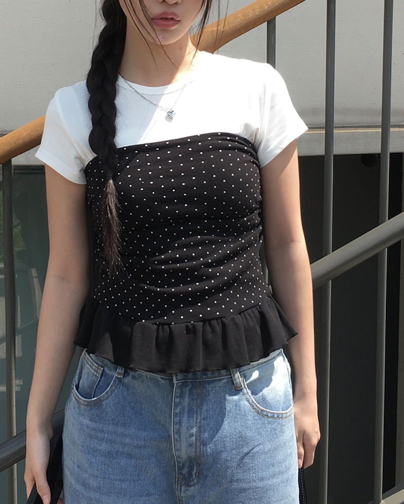 [ユニーク]裾フリルサイドシャーリングドットチューブトップ (3color)