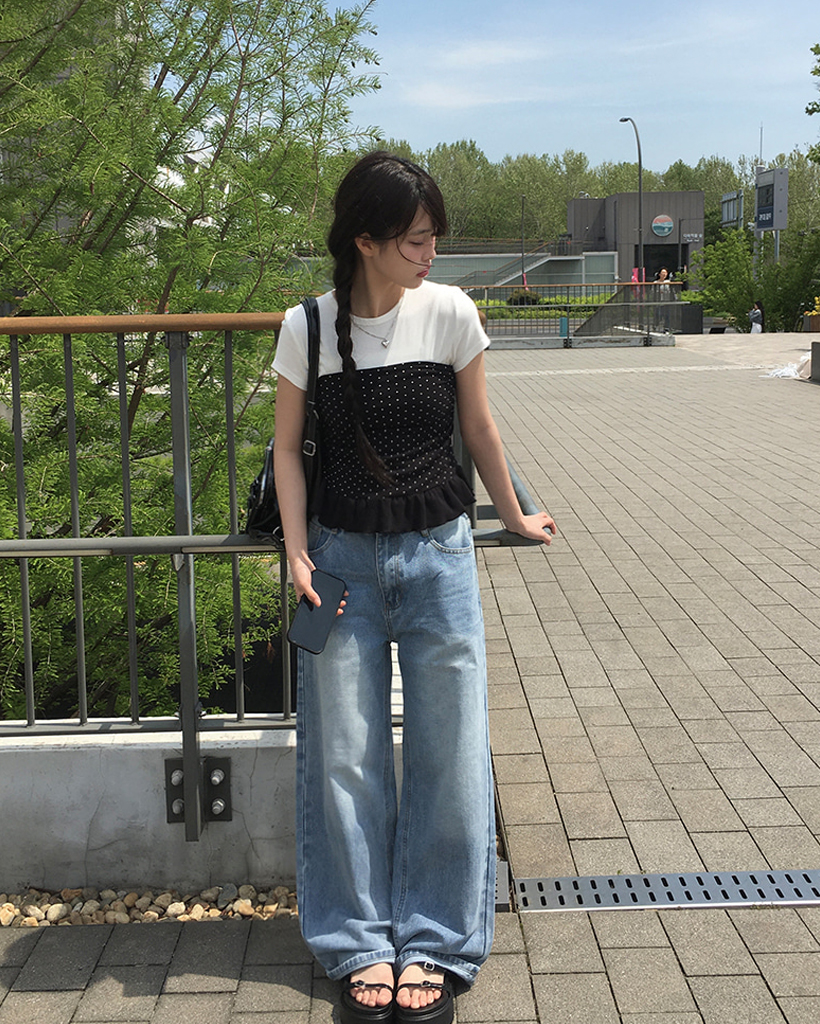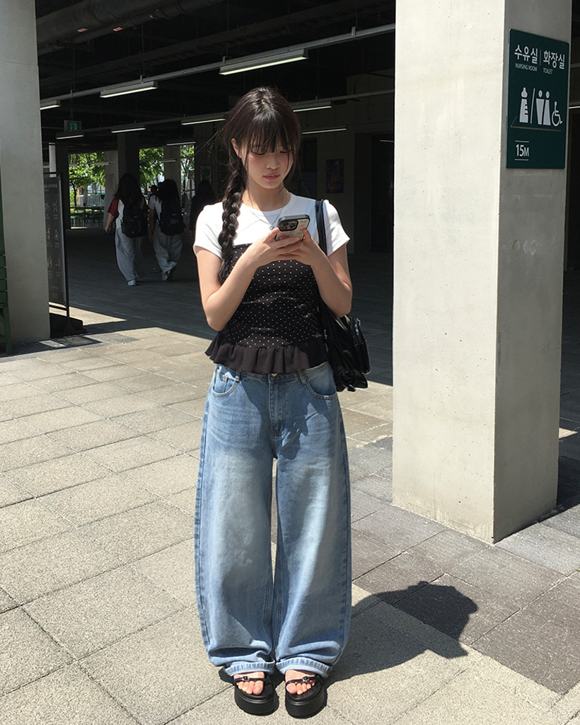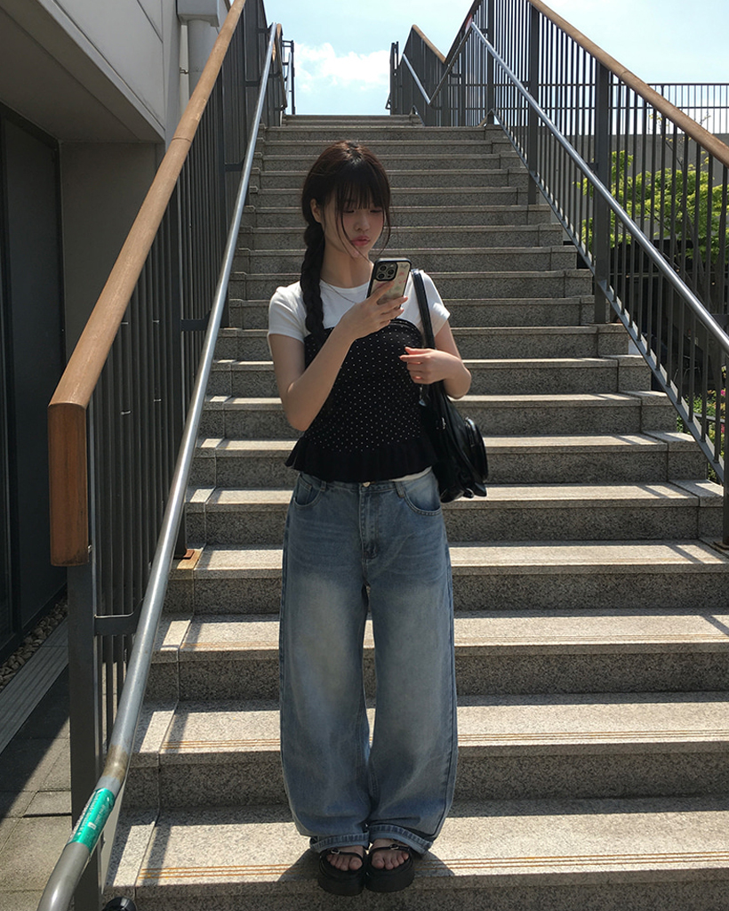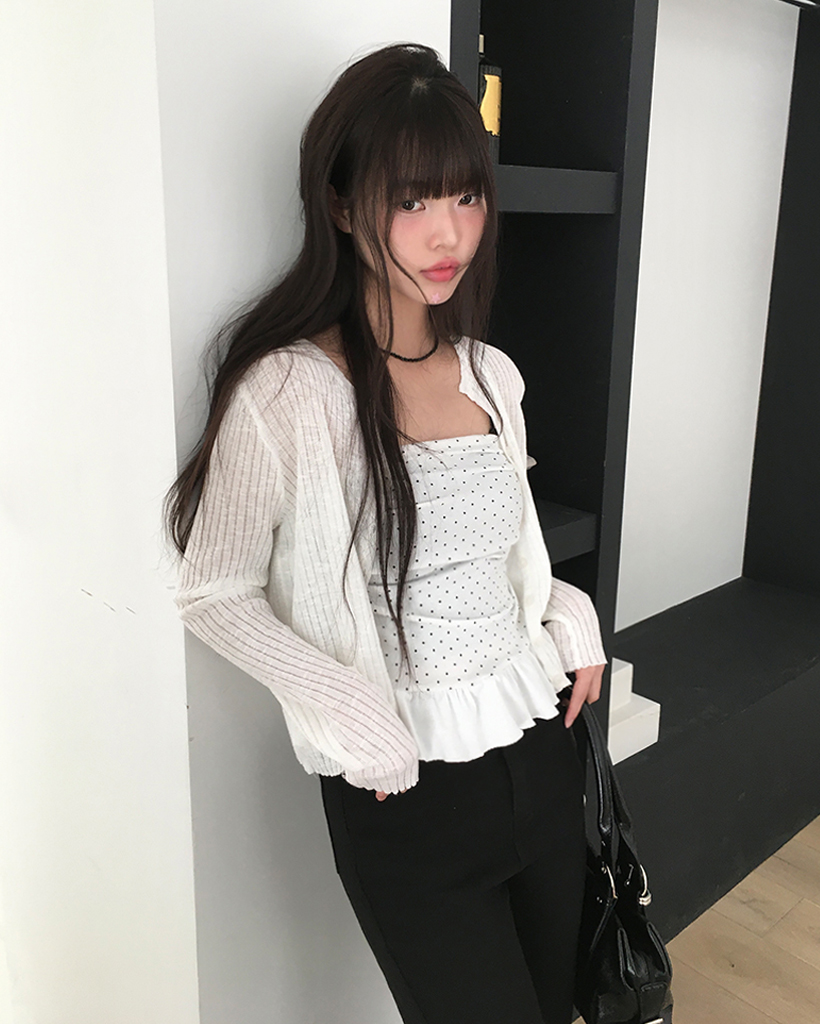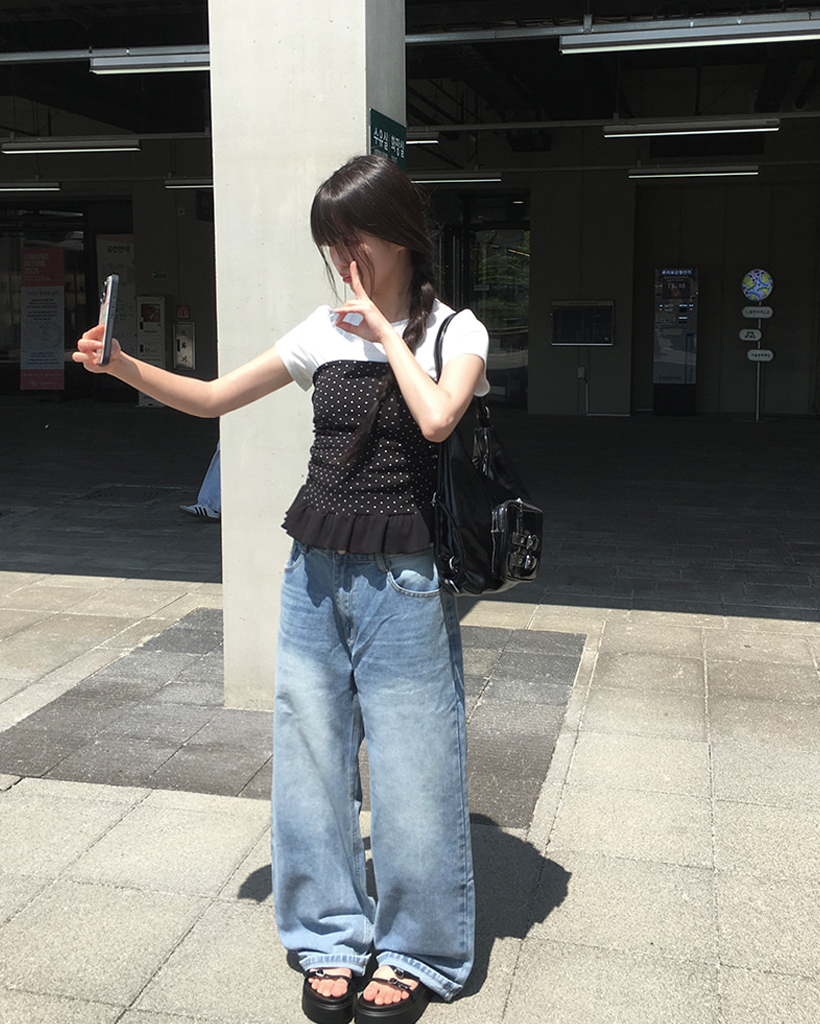 [ユニーク]裾フリルサイドシャーリングドットチューブトップ (3color)