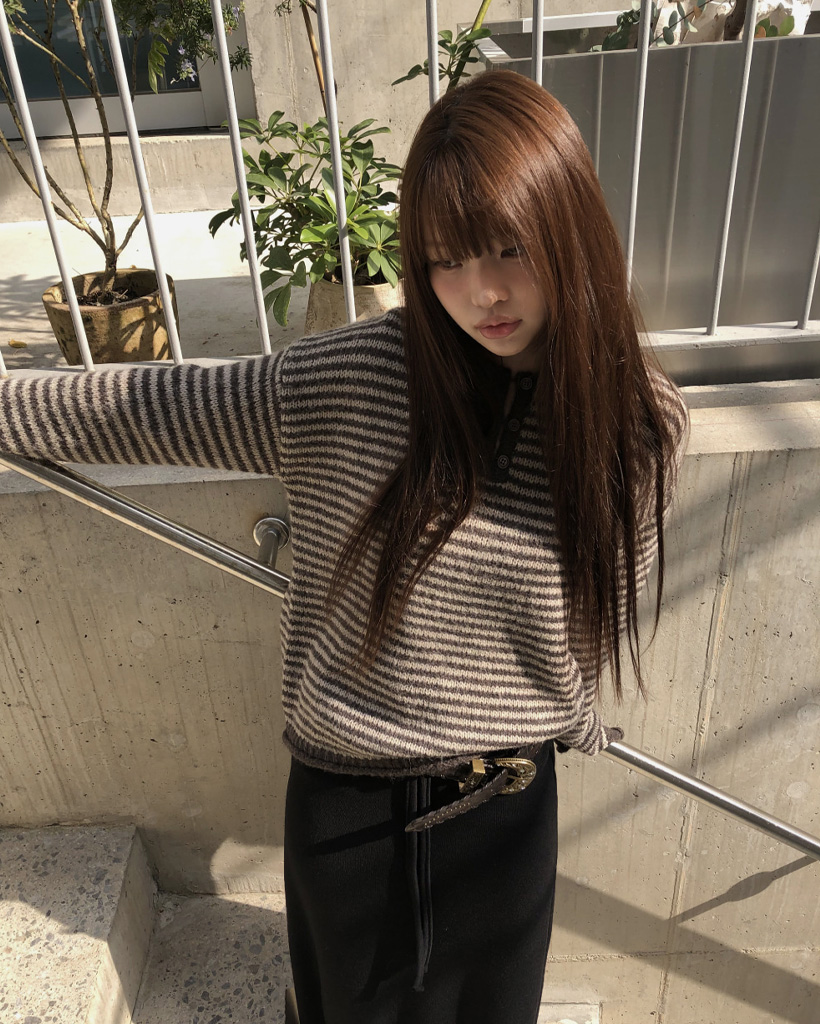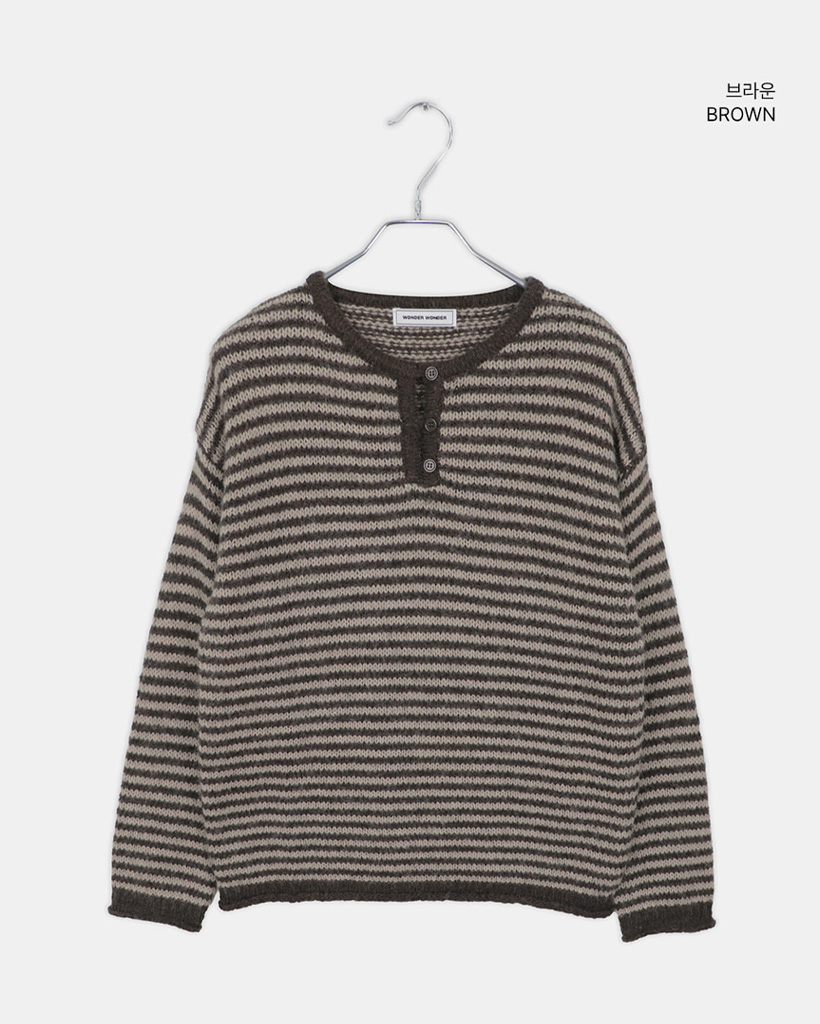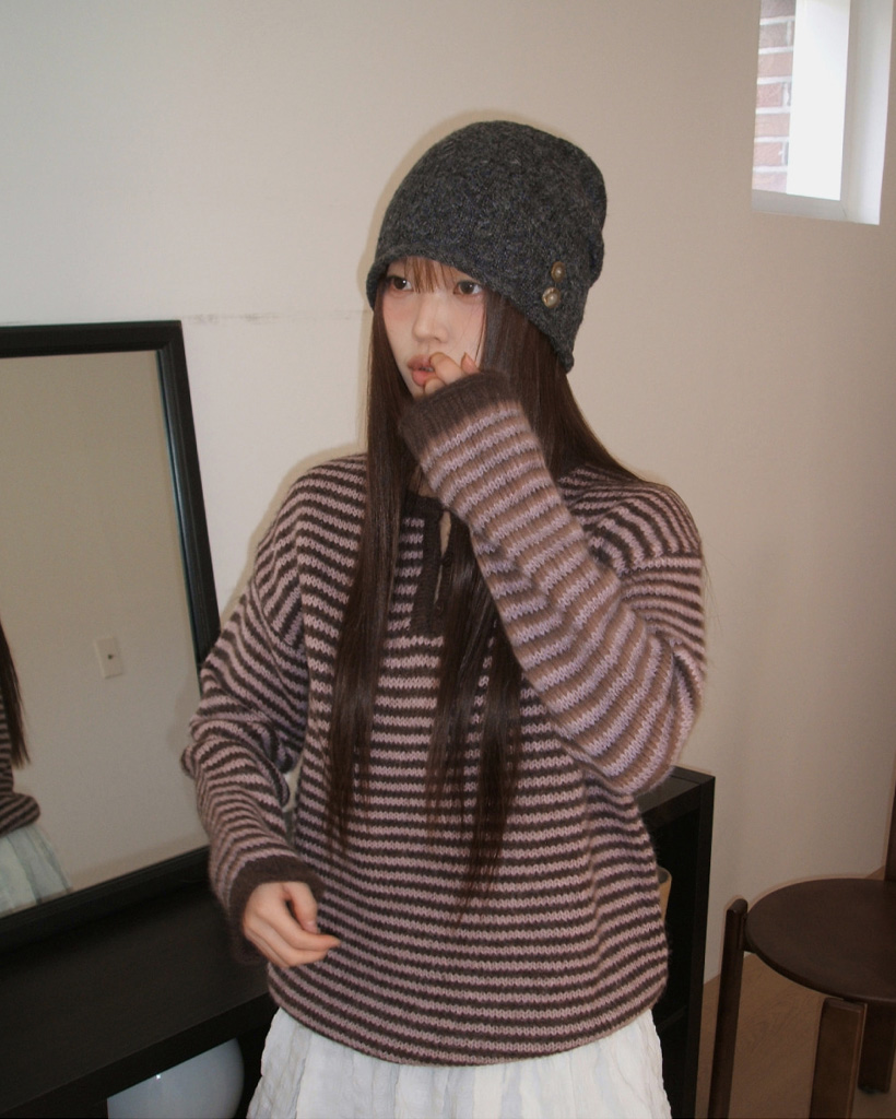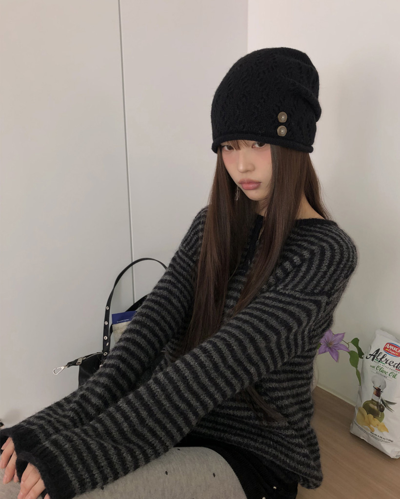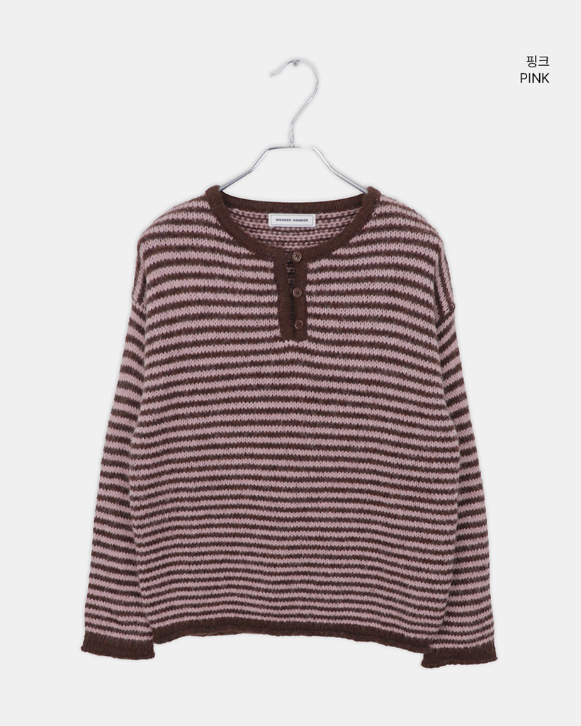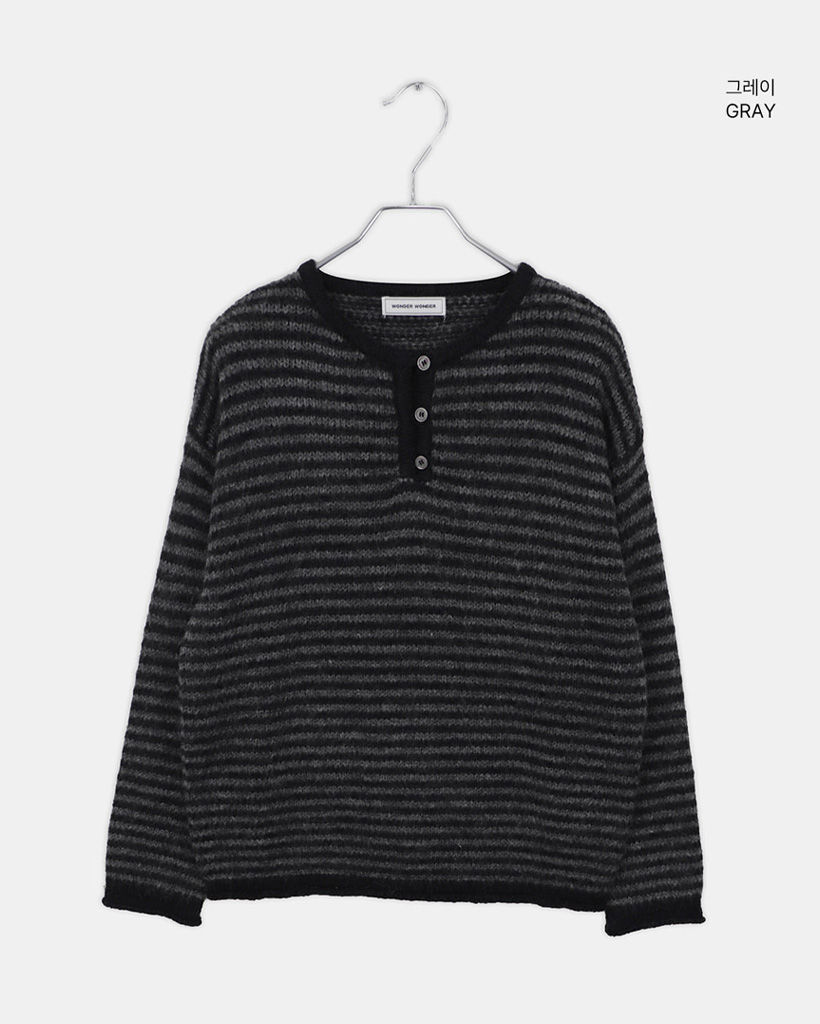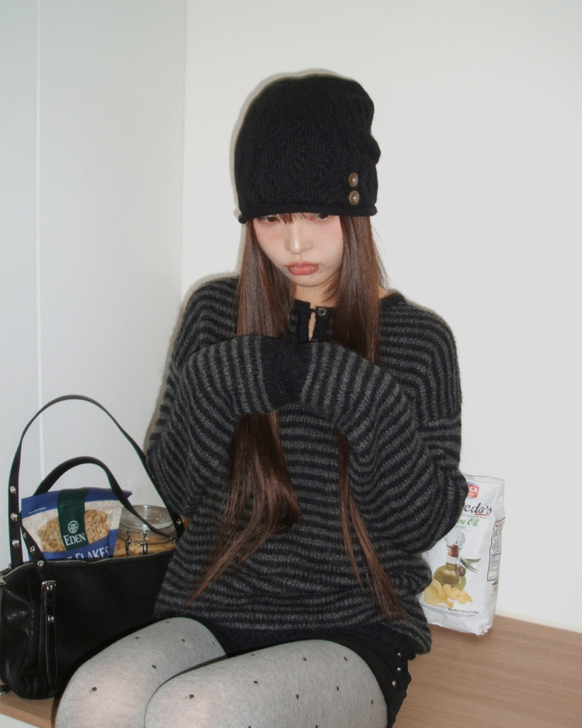 ボーダーハイネックボタンニット