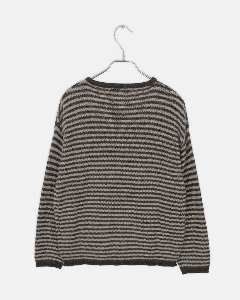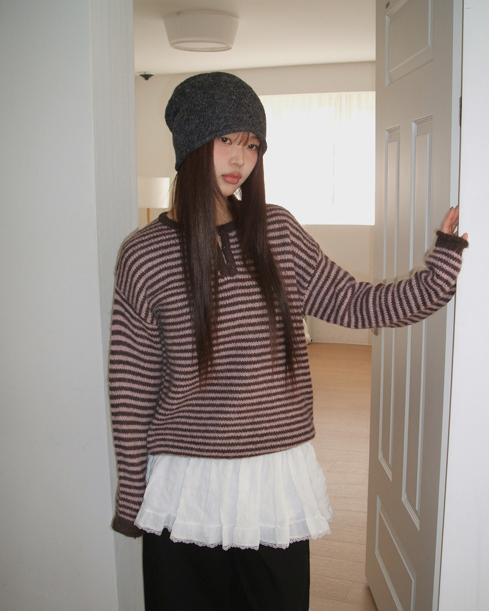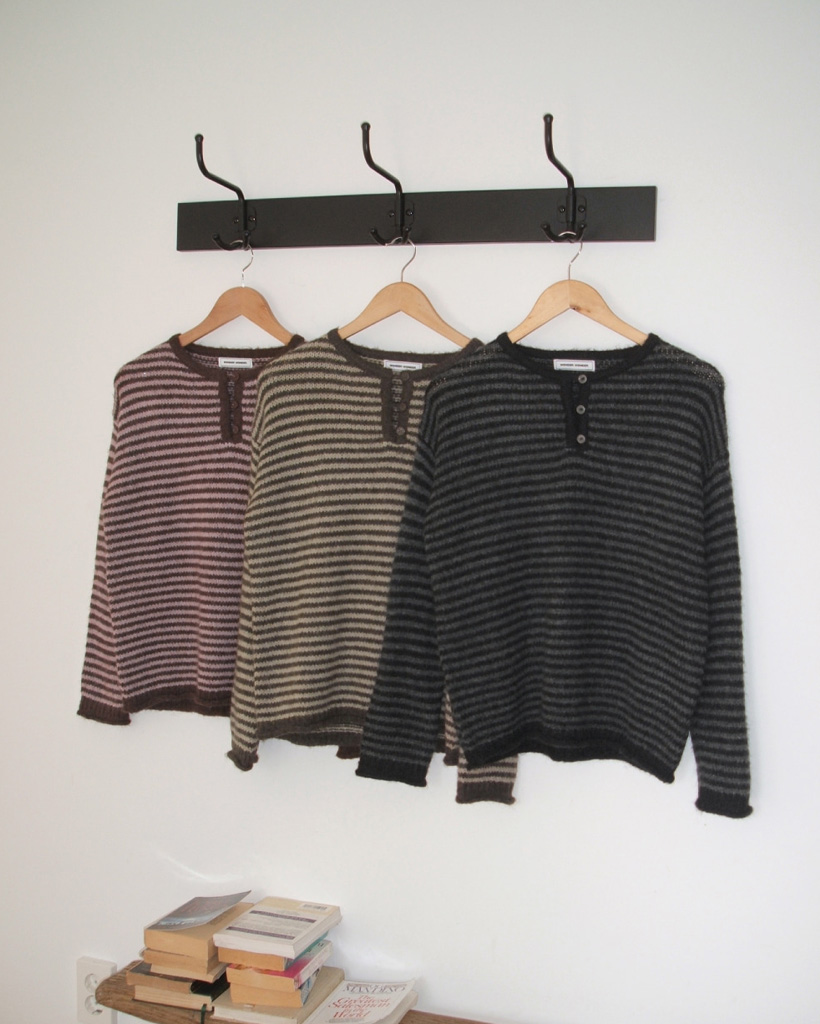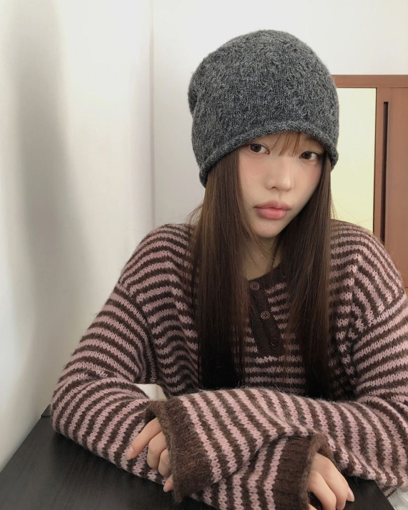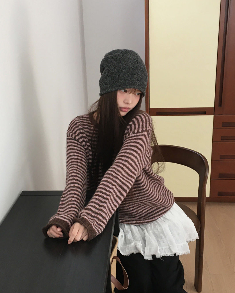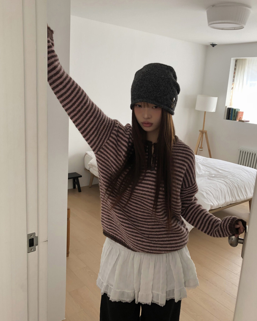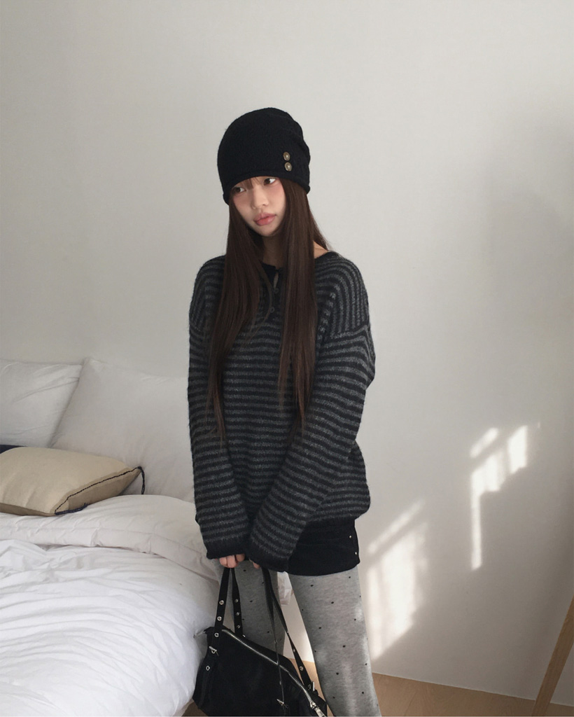 ボーダーハイネックボタンニット