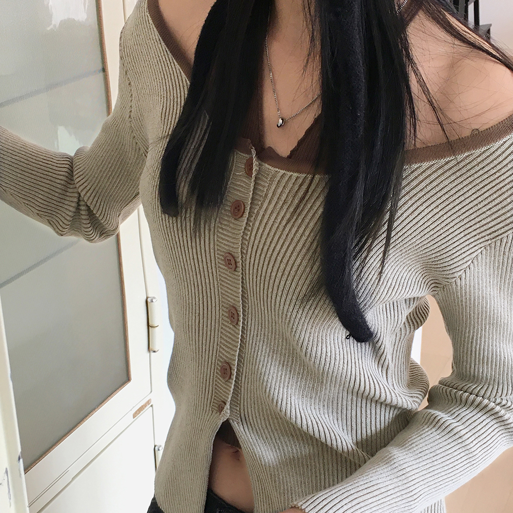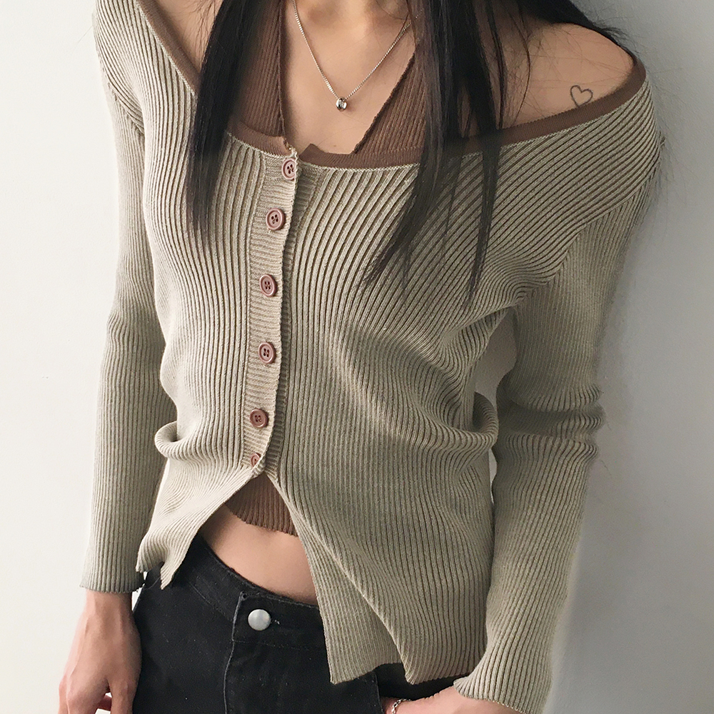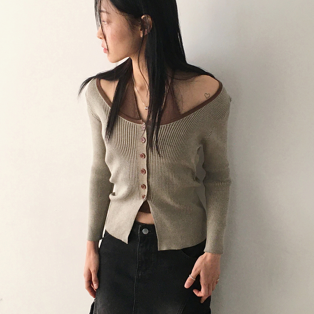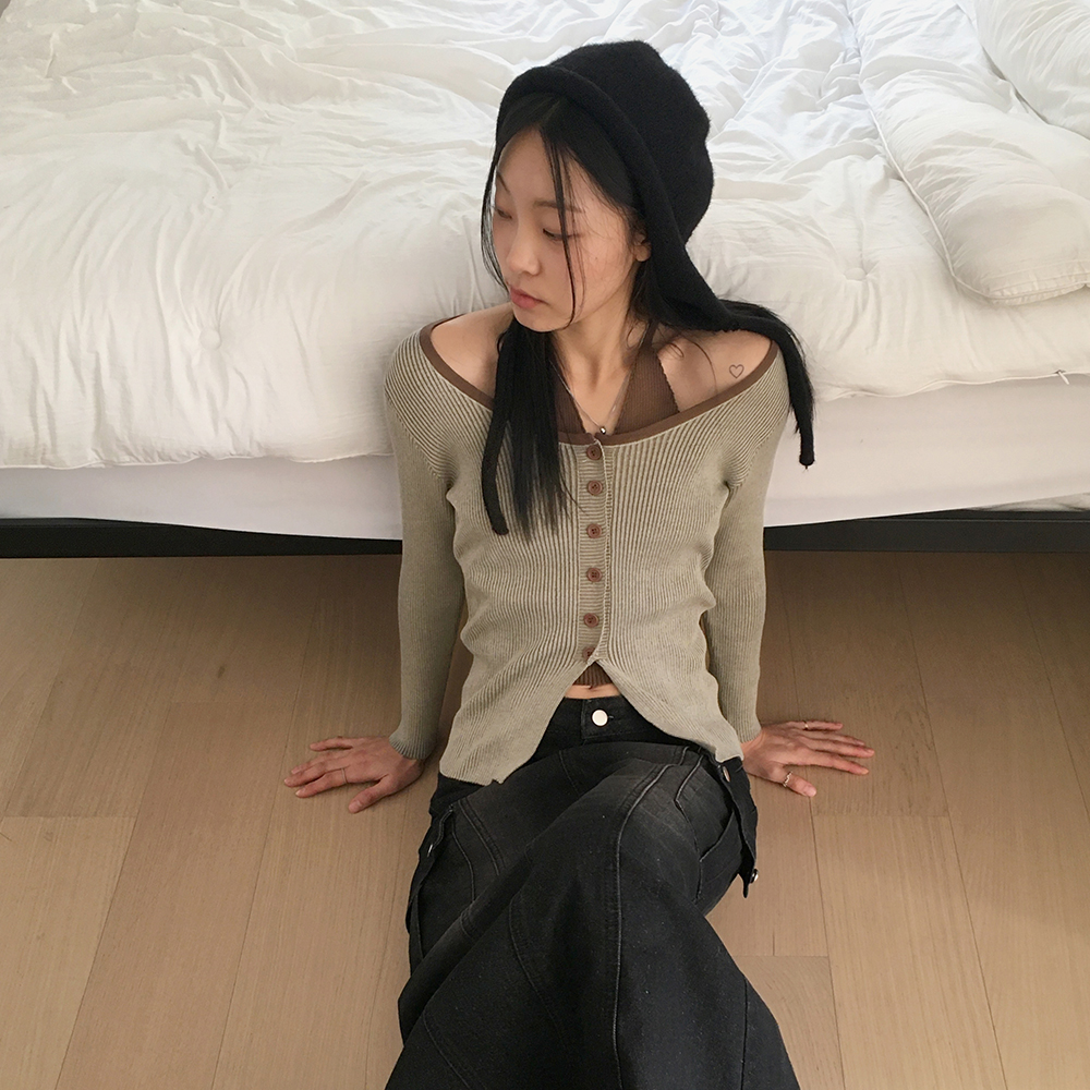 [一体型] ホルターネックノースリーブ+リブバイカラーボタン長袖シャツ