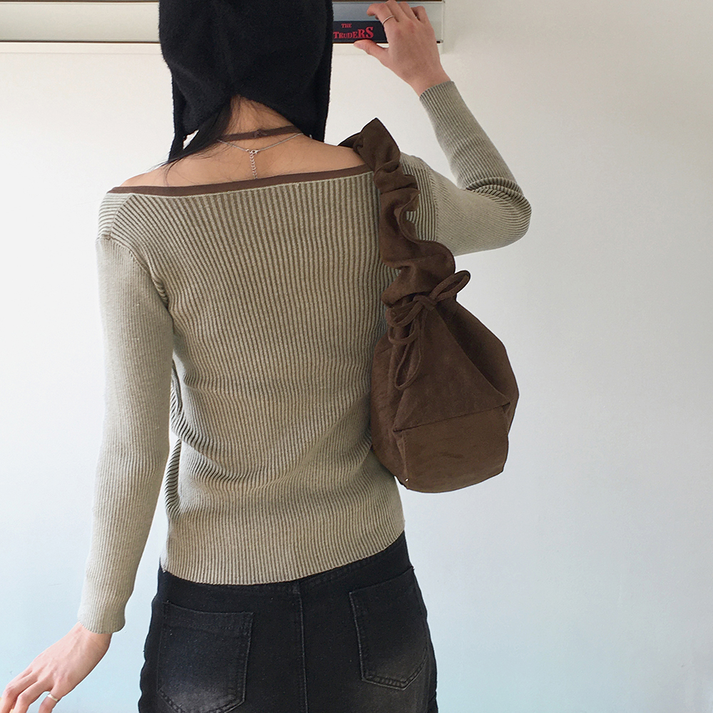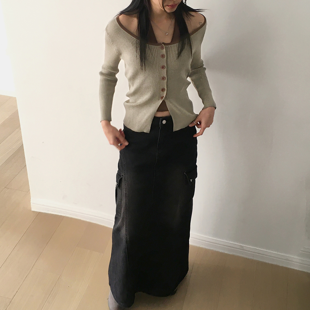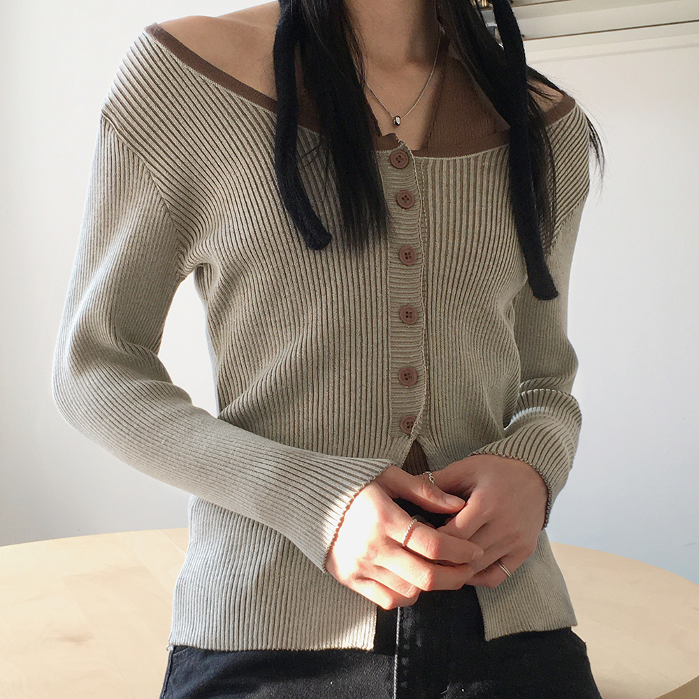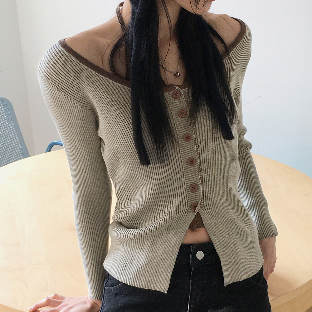 [一体型] ホルターネックノースリーブ+リブバイカラーボタン長袖シャツ