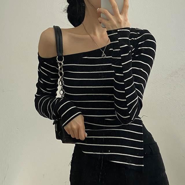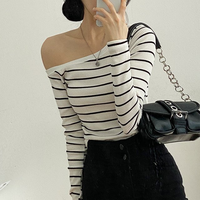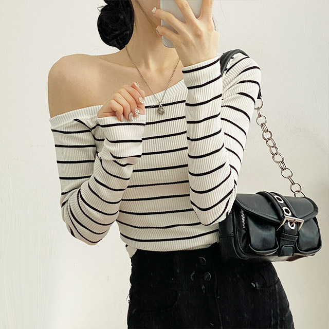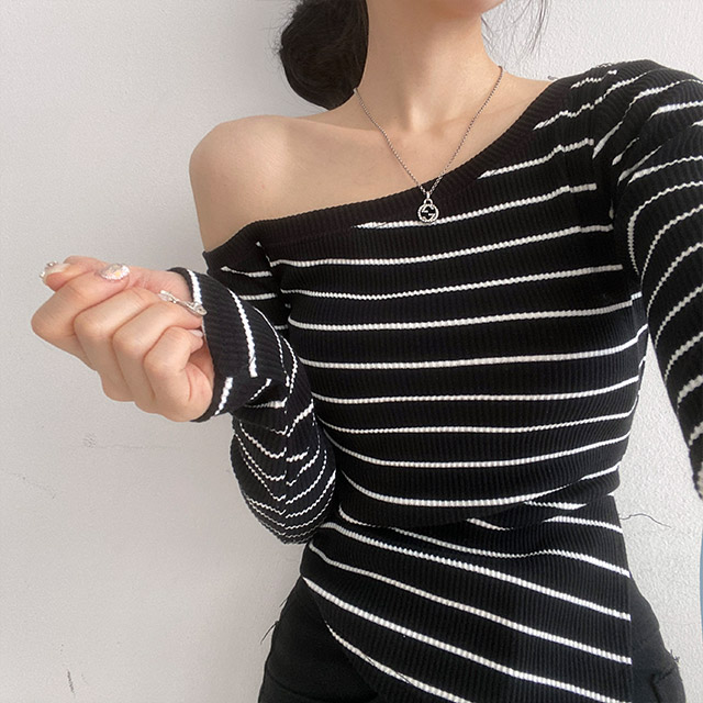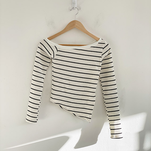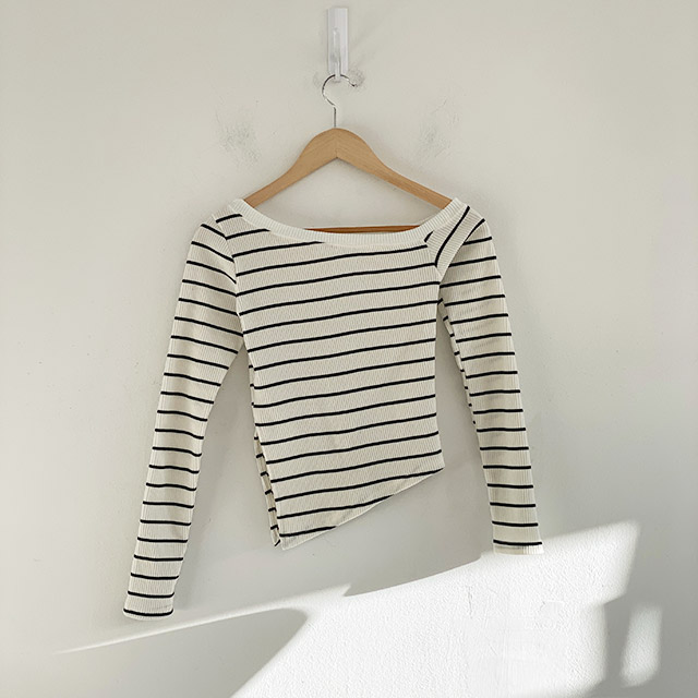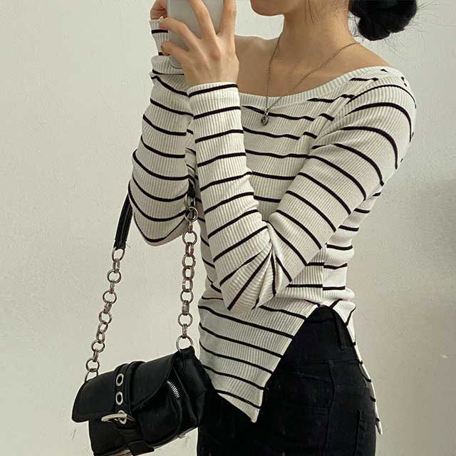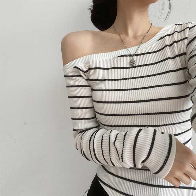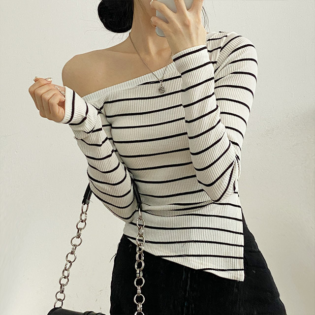 アシンメトリーオフショルスリットボーダーリブTシャツ