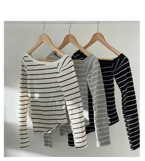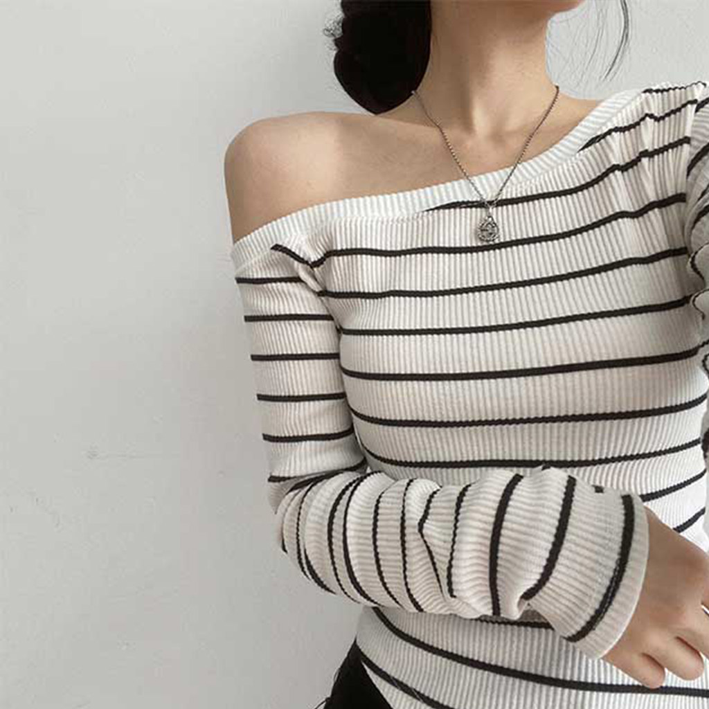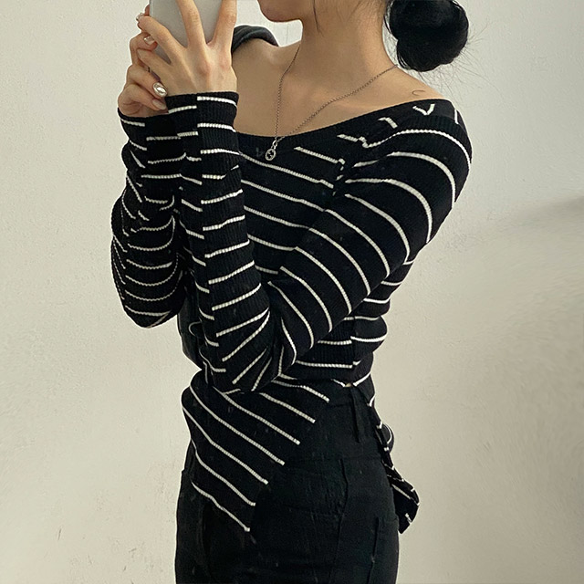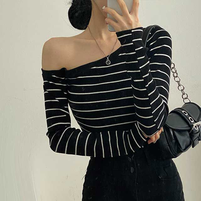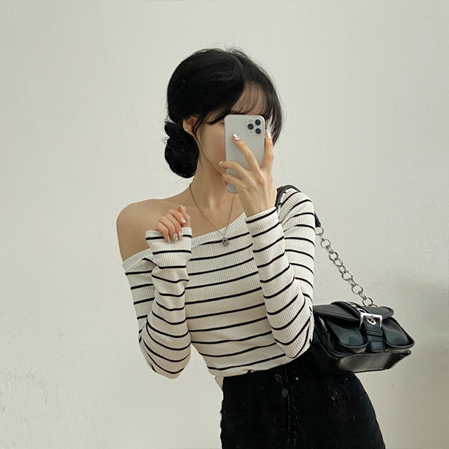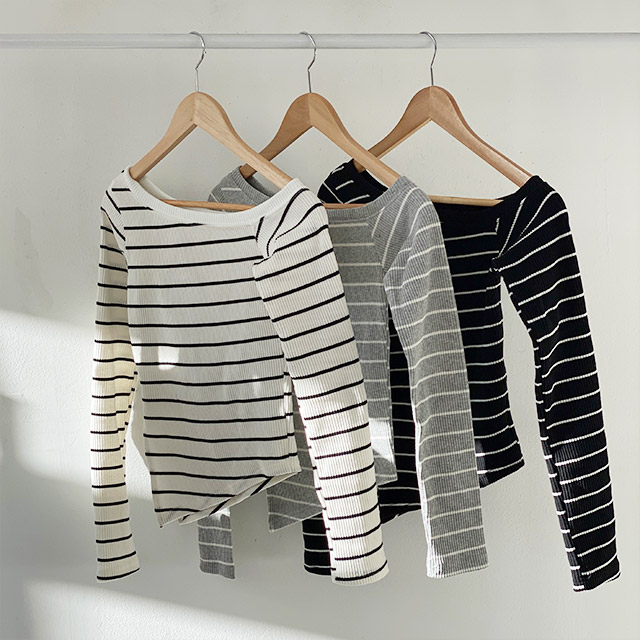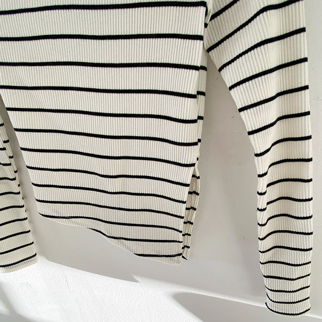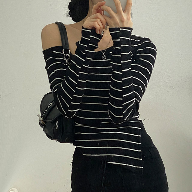 アシンメトリーオフショルスリットボーダーリブTシャツ