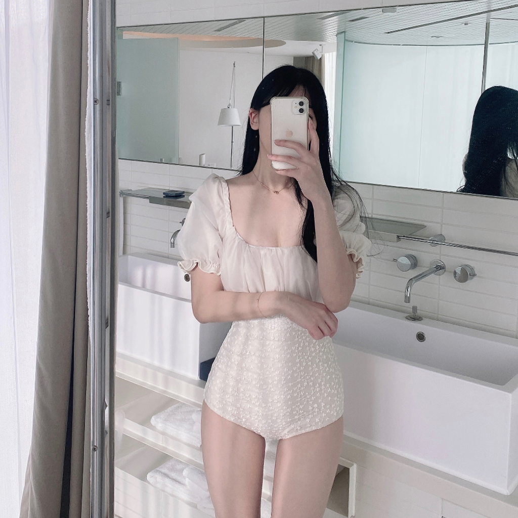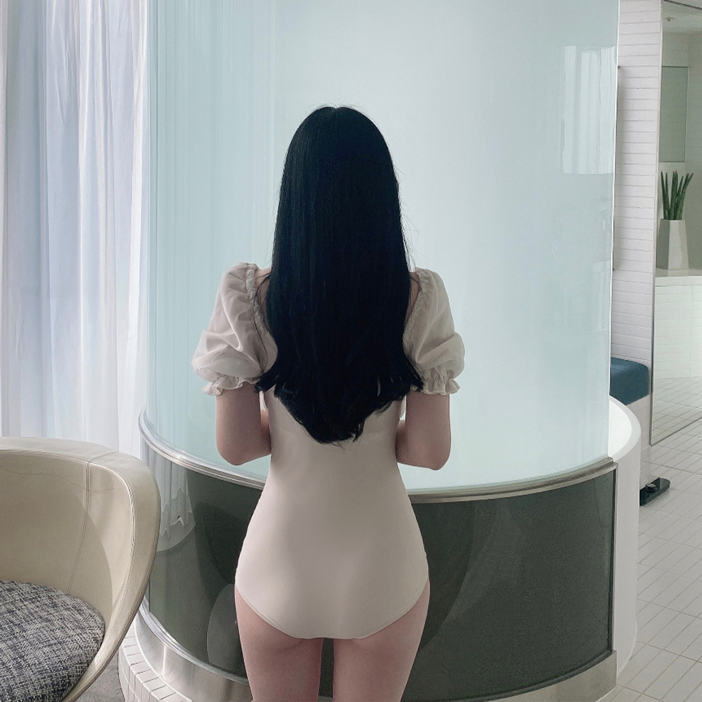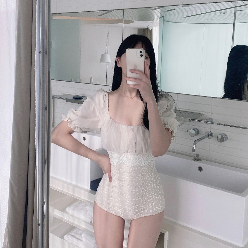 [パッド付き] レース半袖シャーリング水着モノキニ
