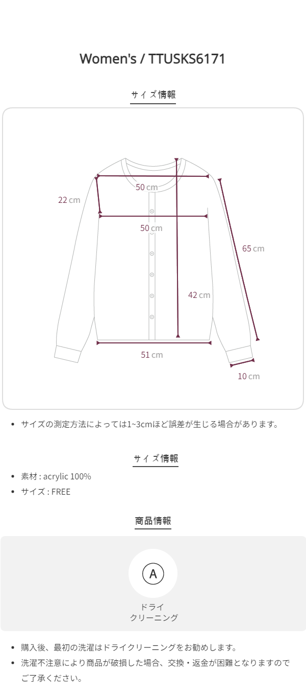 - ニットまたは伸縮性に優れている商品は最大±10cm程度のサイズ誤差がある可能性があります。