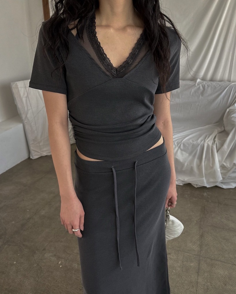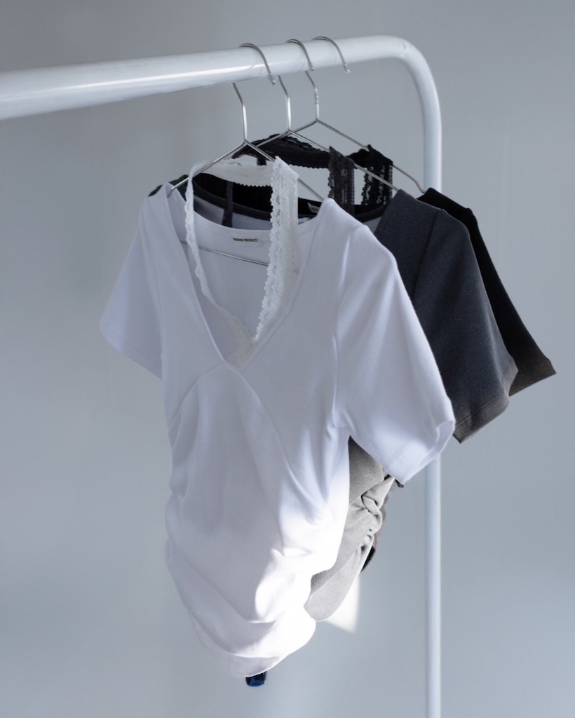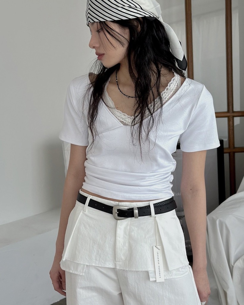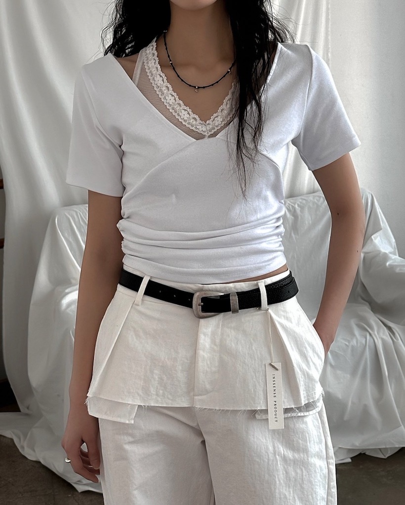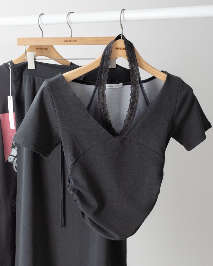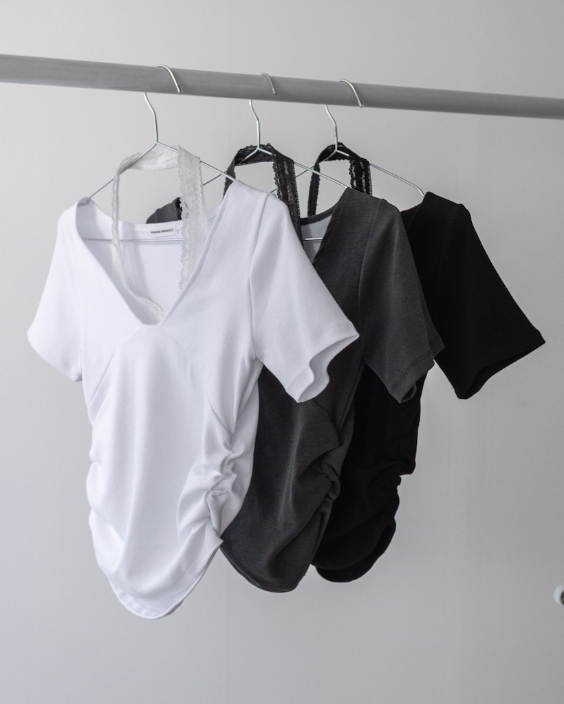 "インナー選びの悩みはこれ一枚で解決。レースのチラ見せとシャーリングで完成させる主役級Tシャツです。"