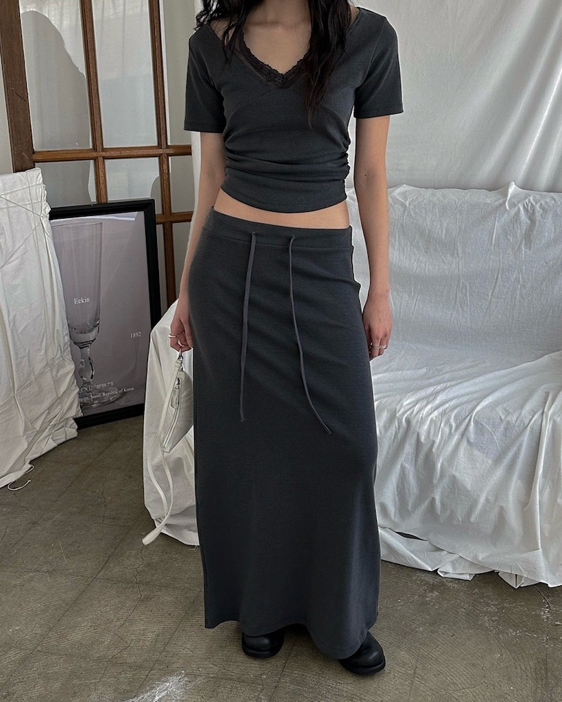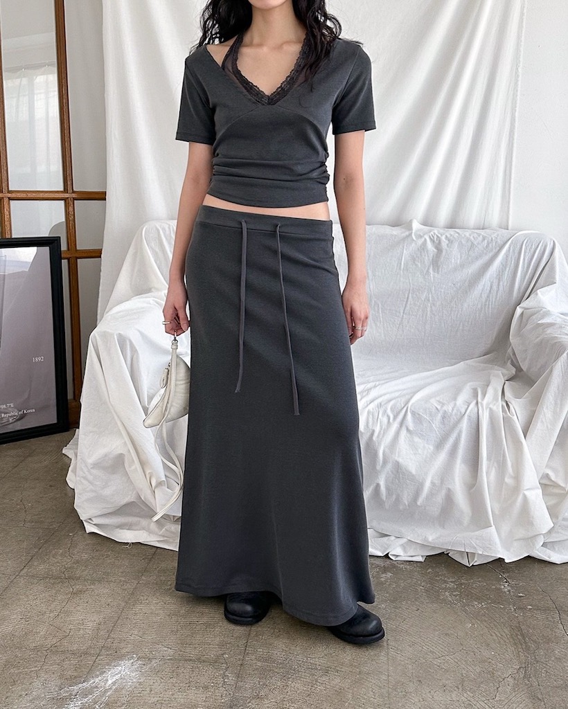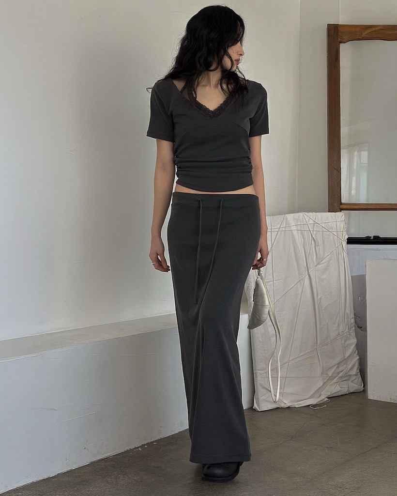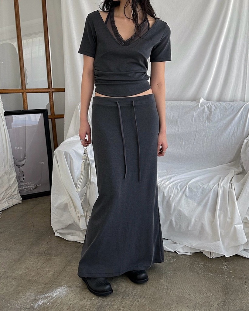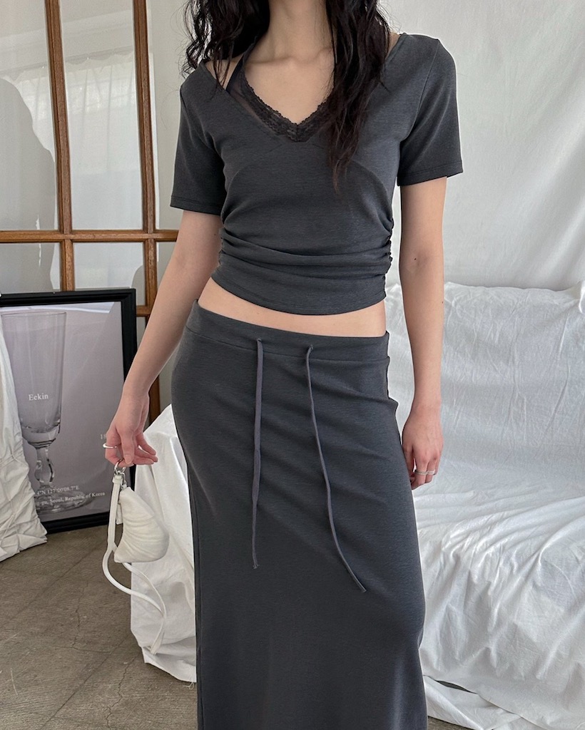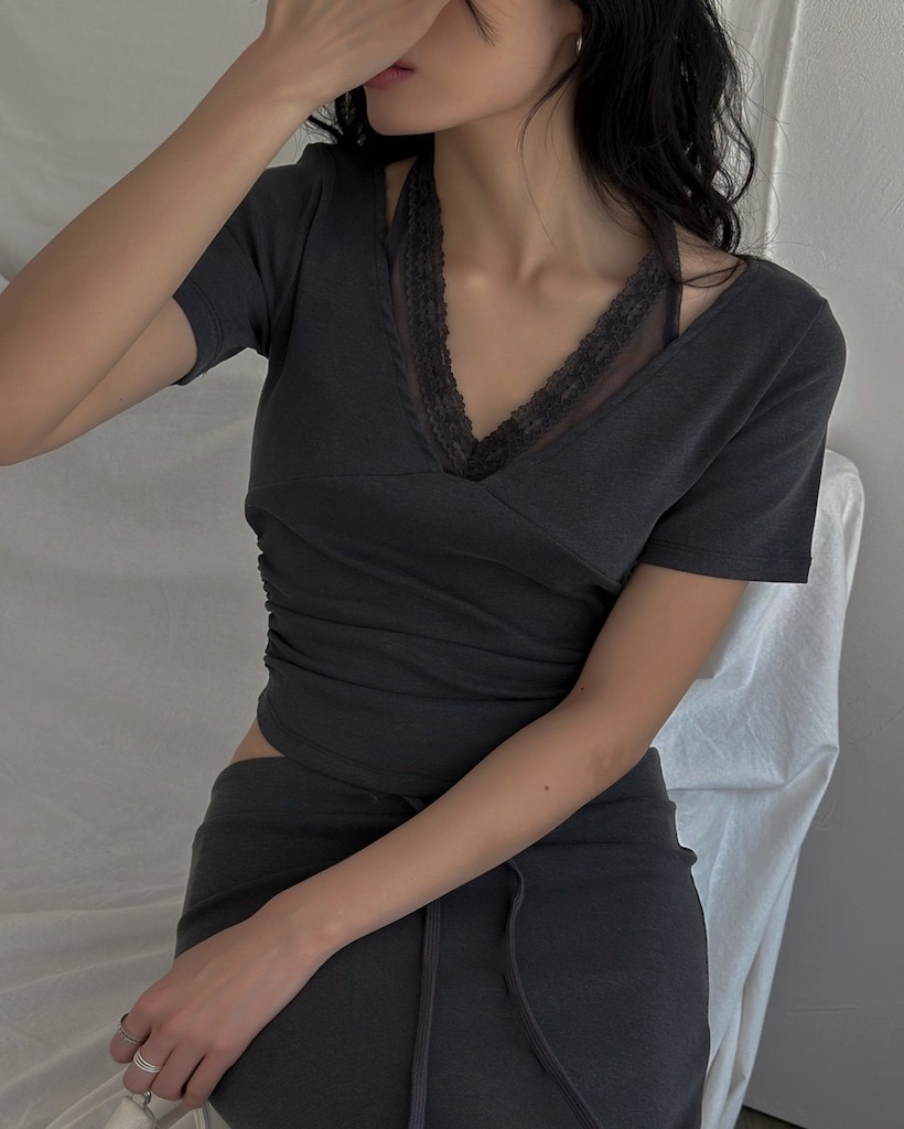 "インナー選びの悩みはこれ一枚で解決。レースのチラ見せとシャーリングで完成させる主役級Tシャツです。"