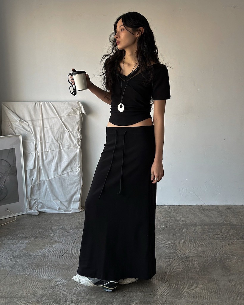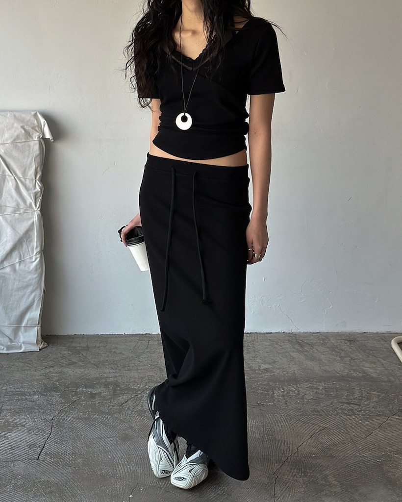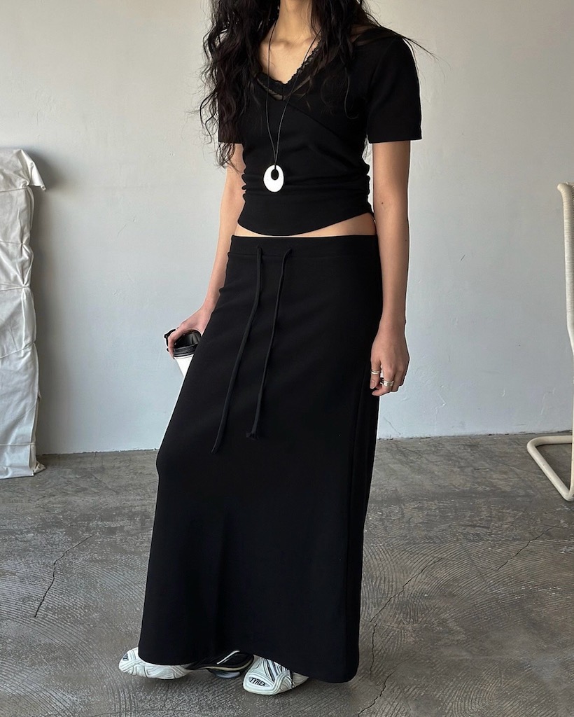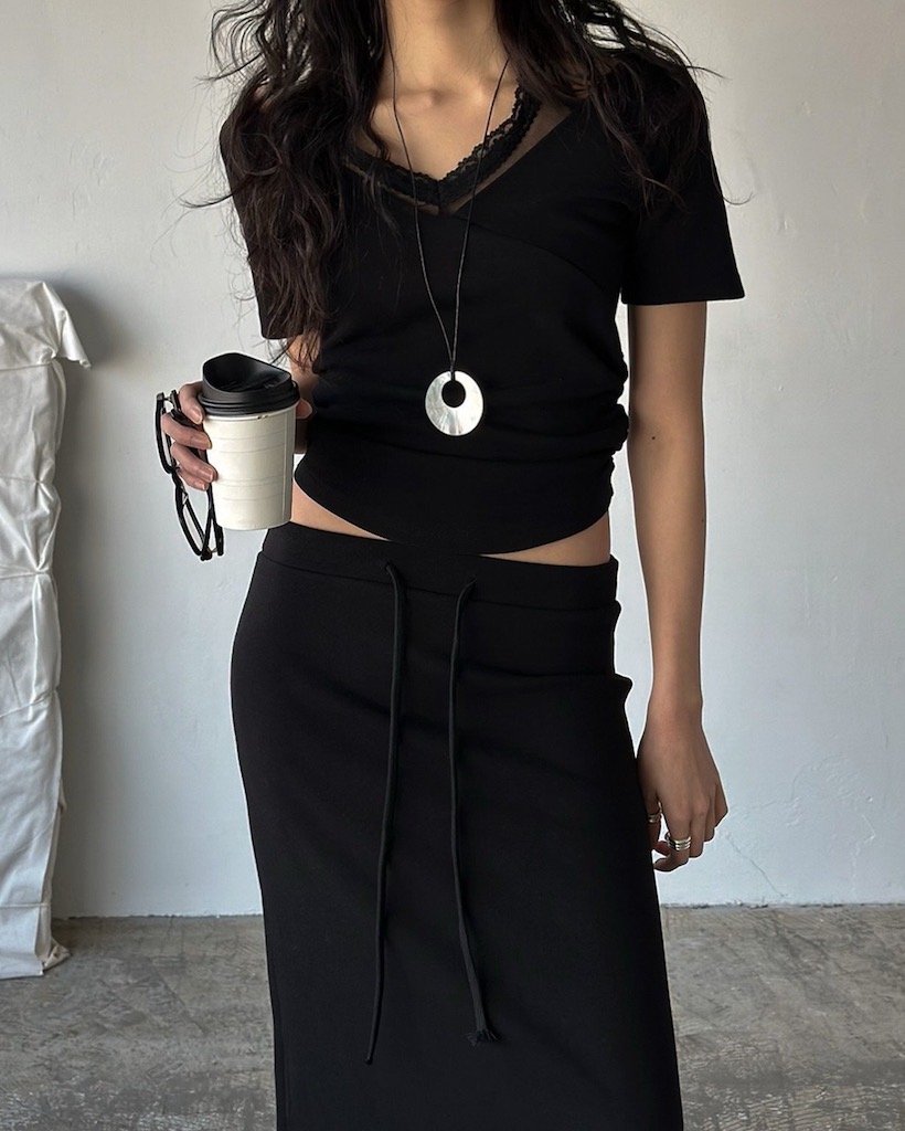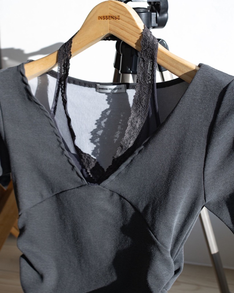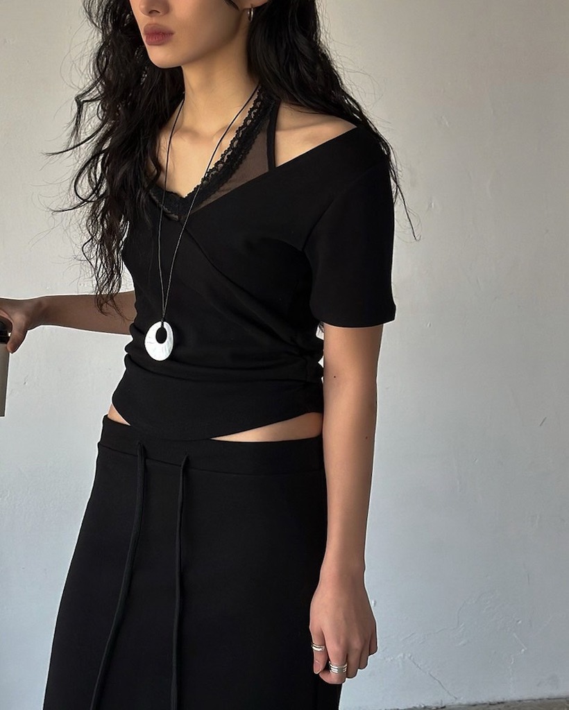 このTシャツ、本当に優秀です!一番のポイントは、首元から覗く繊細なレースのホルターネックデザイン。