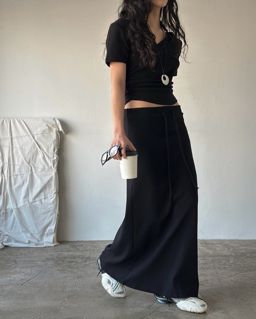 この計算されたギャザーが自然な立体感を生み出し、気になるお腹周りをさりげなくカバー。