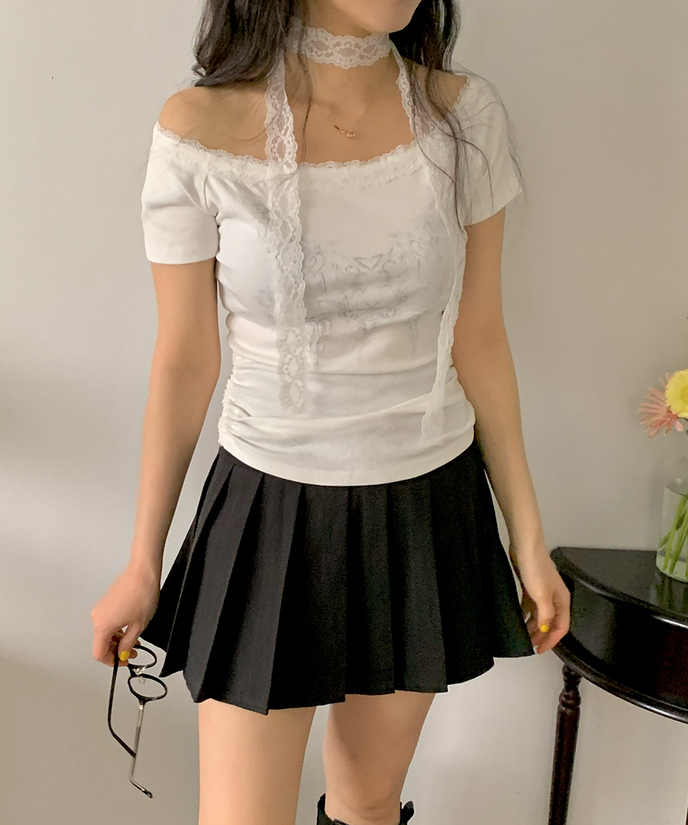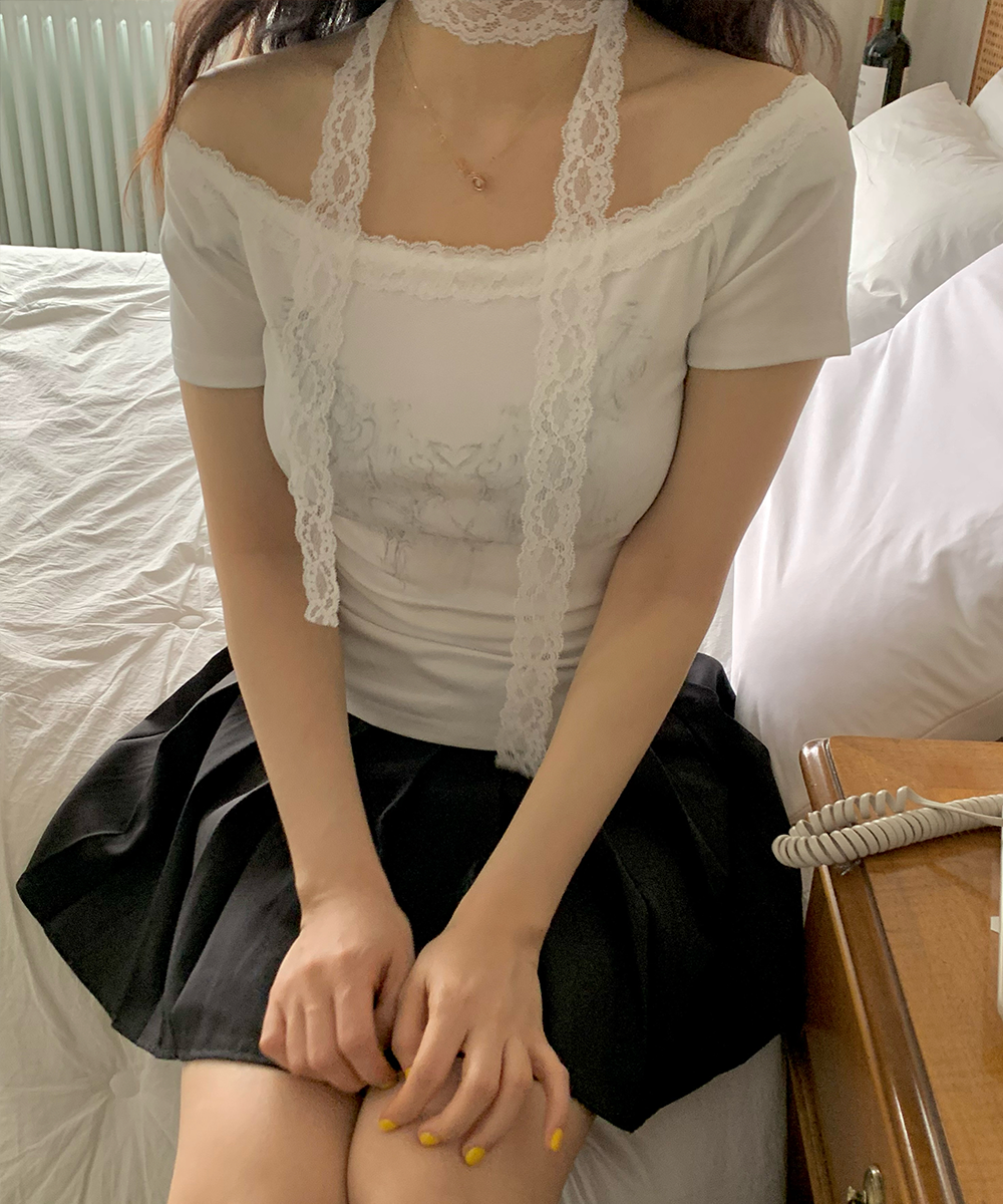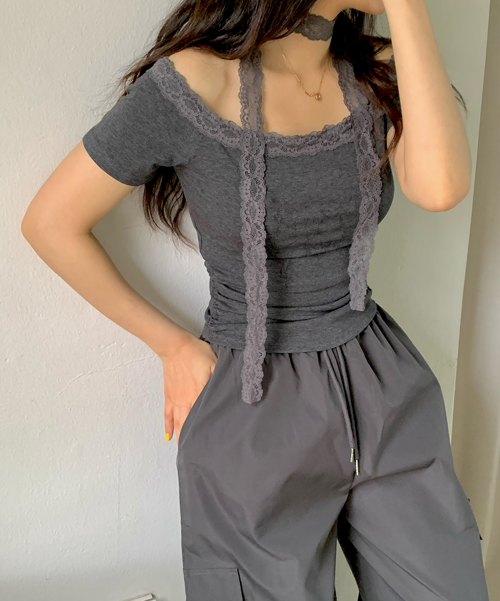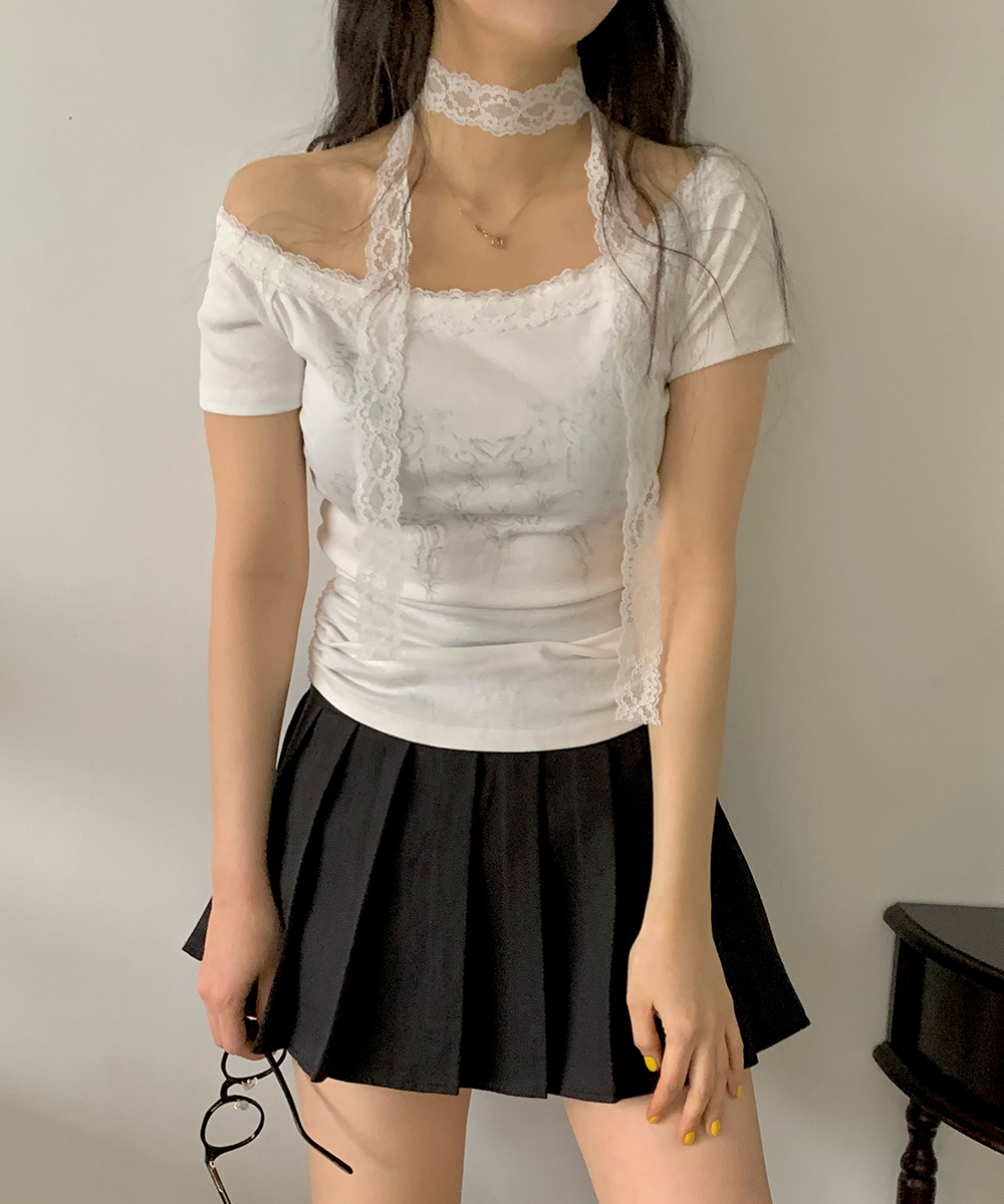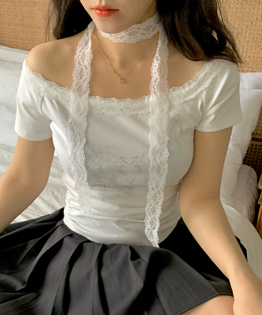 [レーススカーフSET]サイドシャーリングオフショルTシャツ-3color