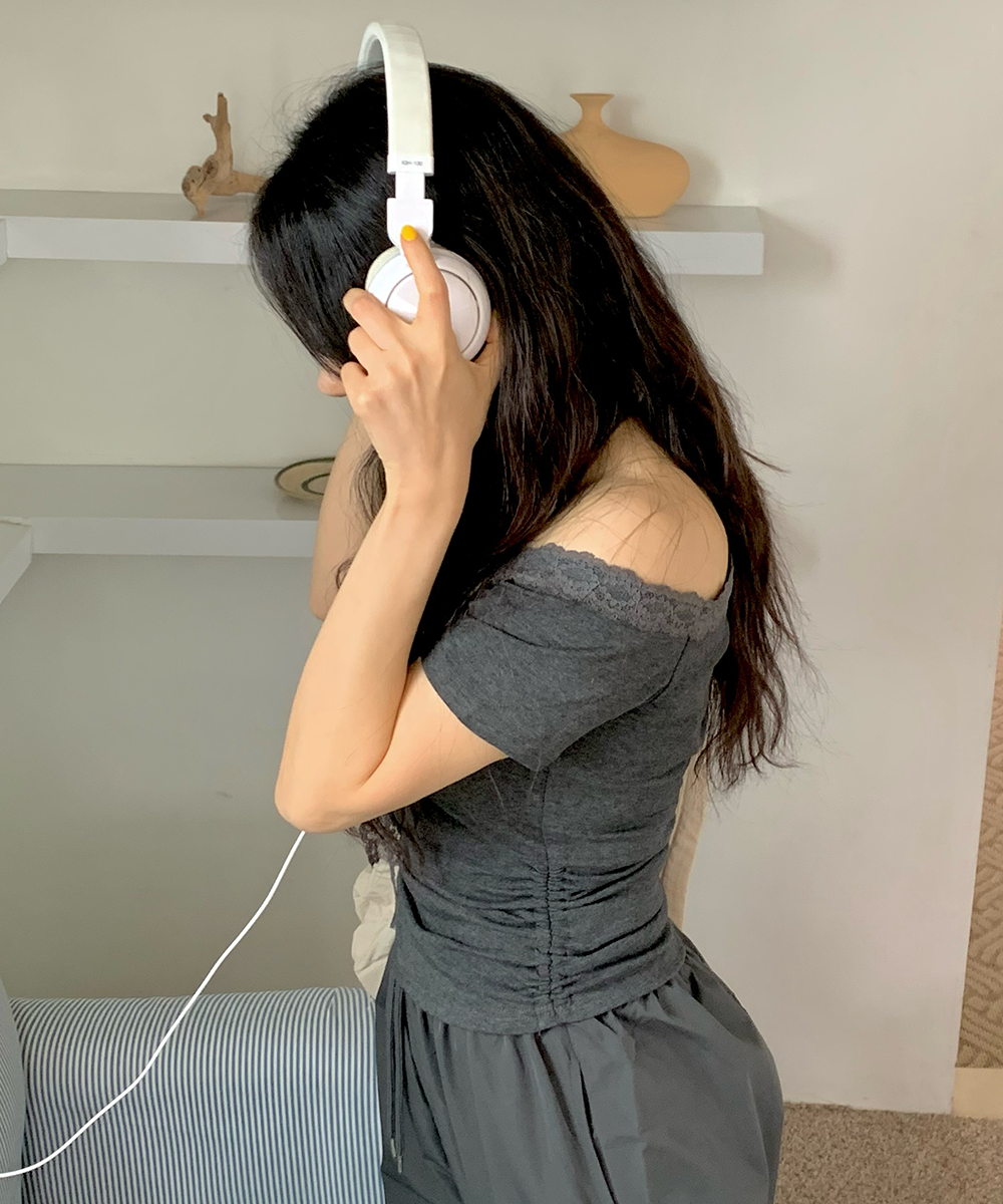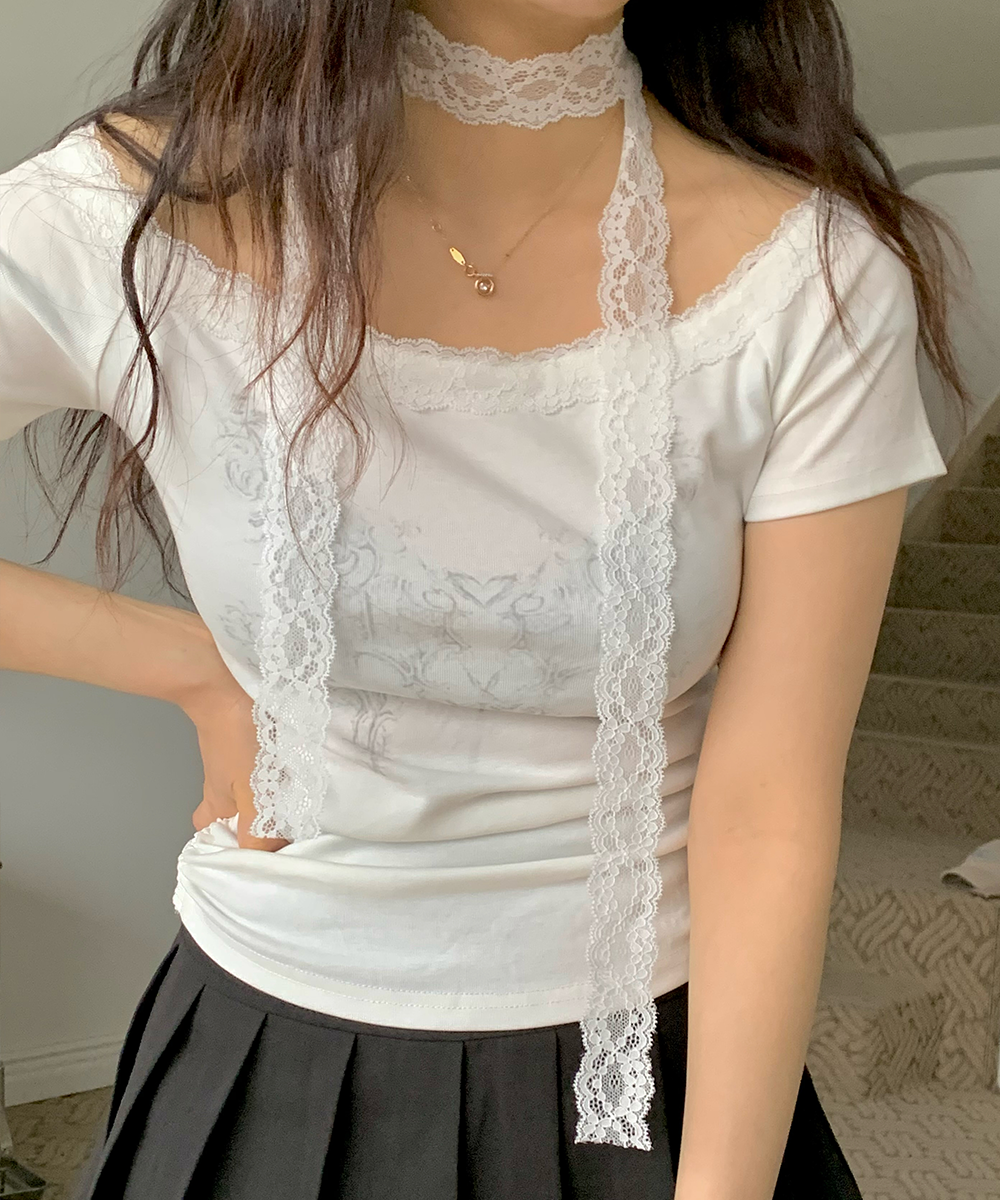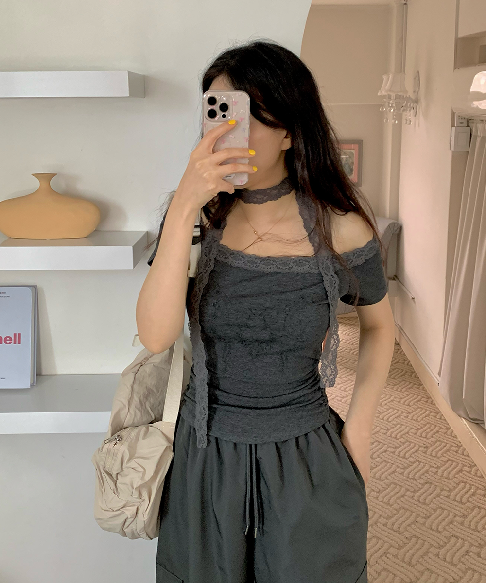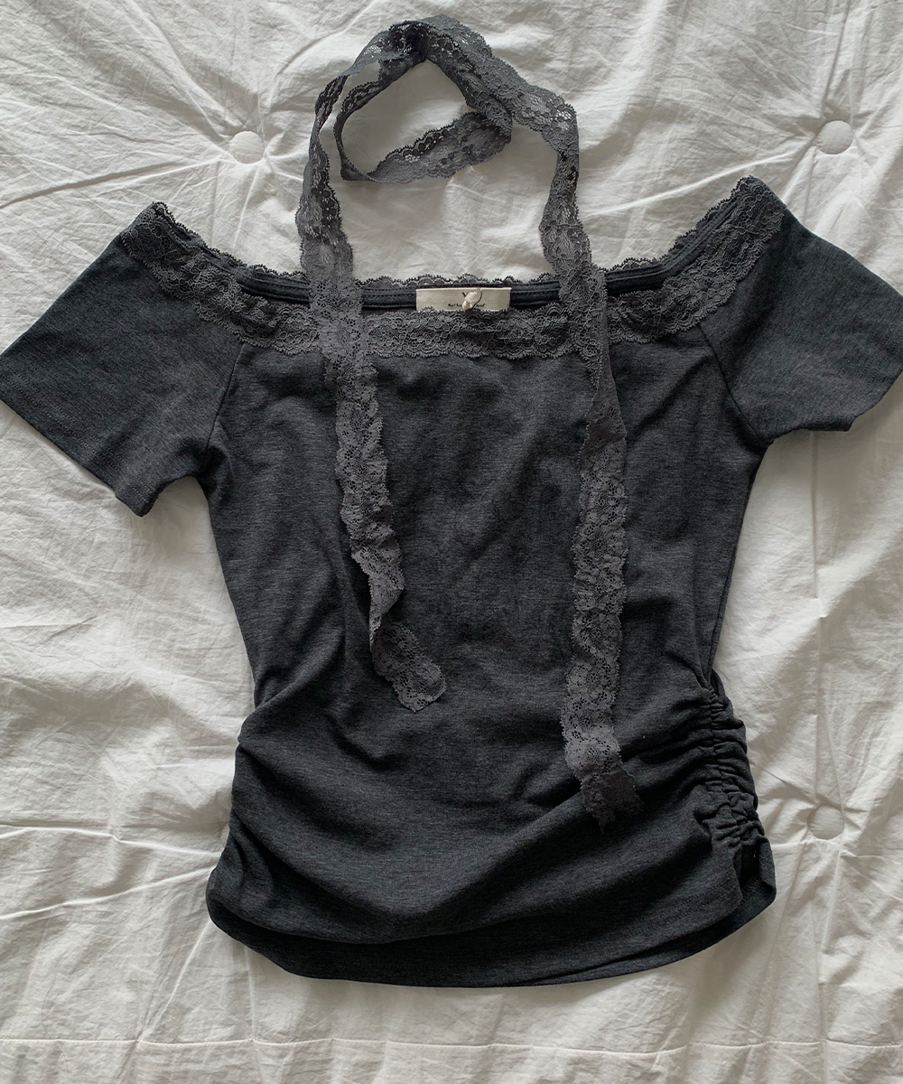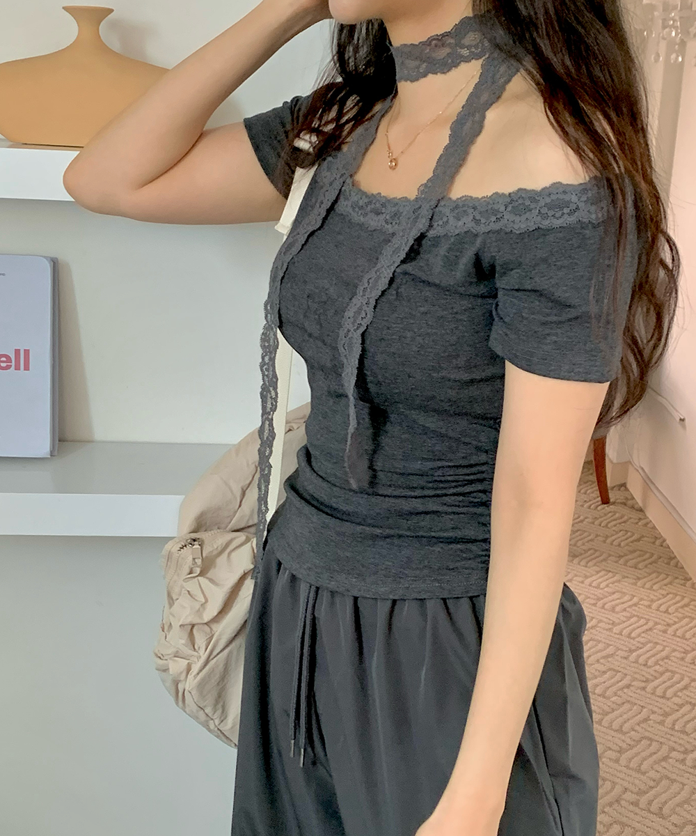 [レーススカーフSET]サイドシャーリングオフショルTシャツ-3color