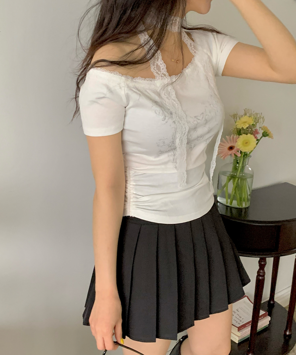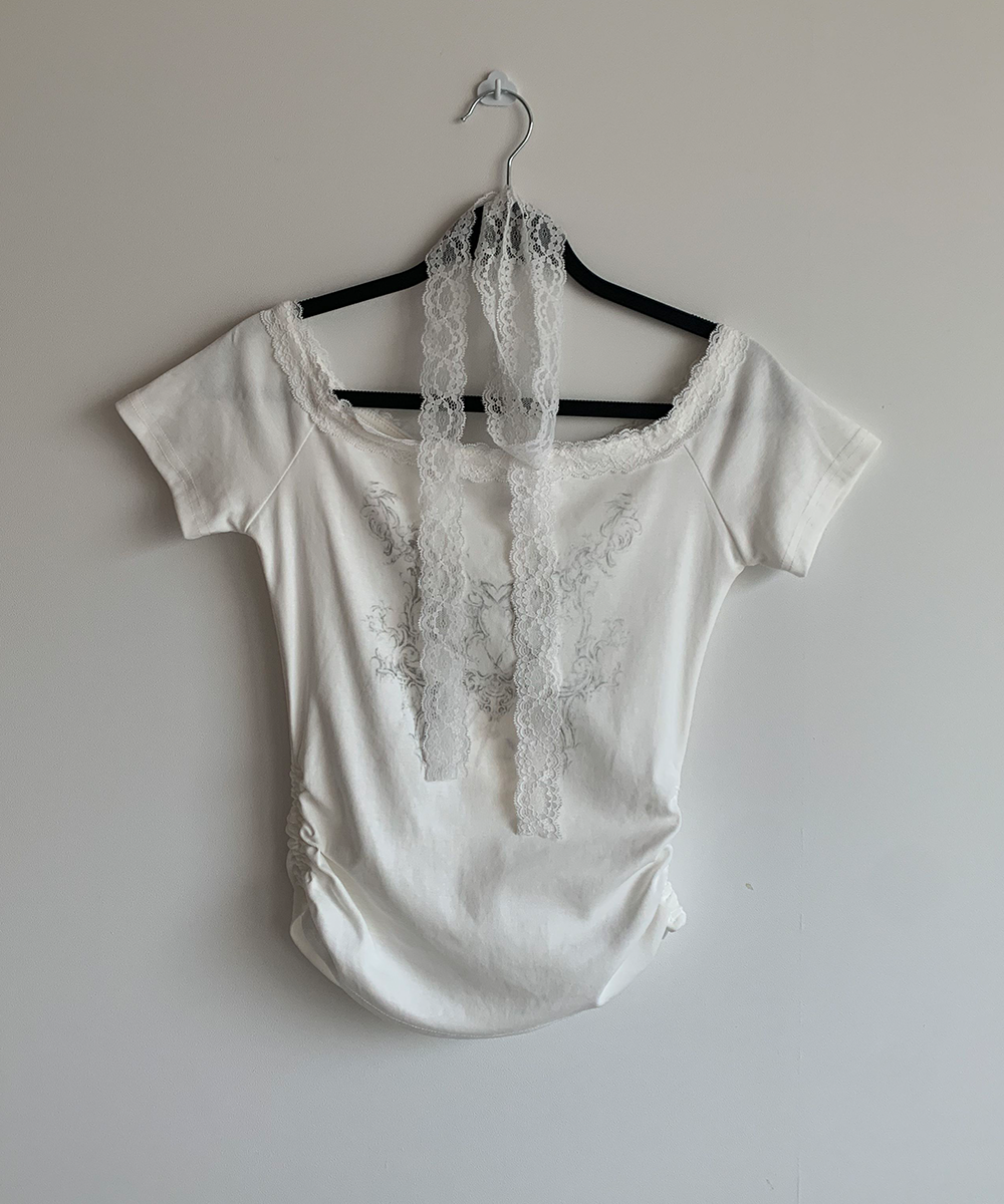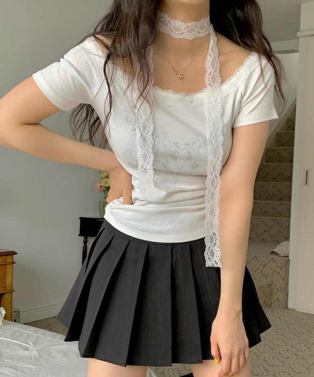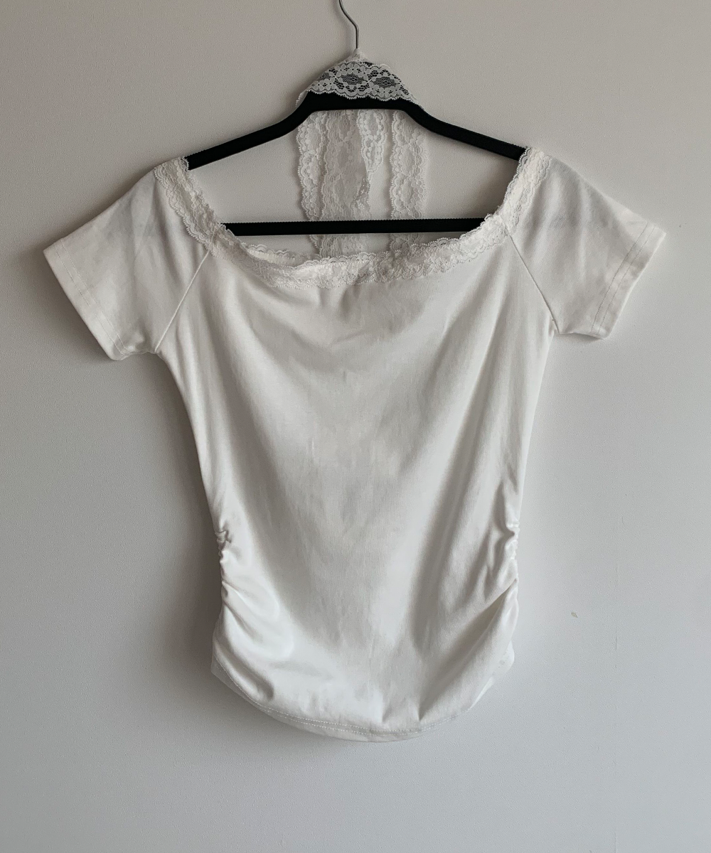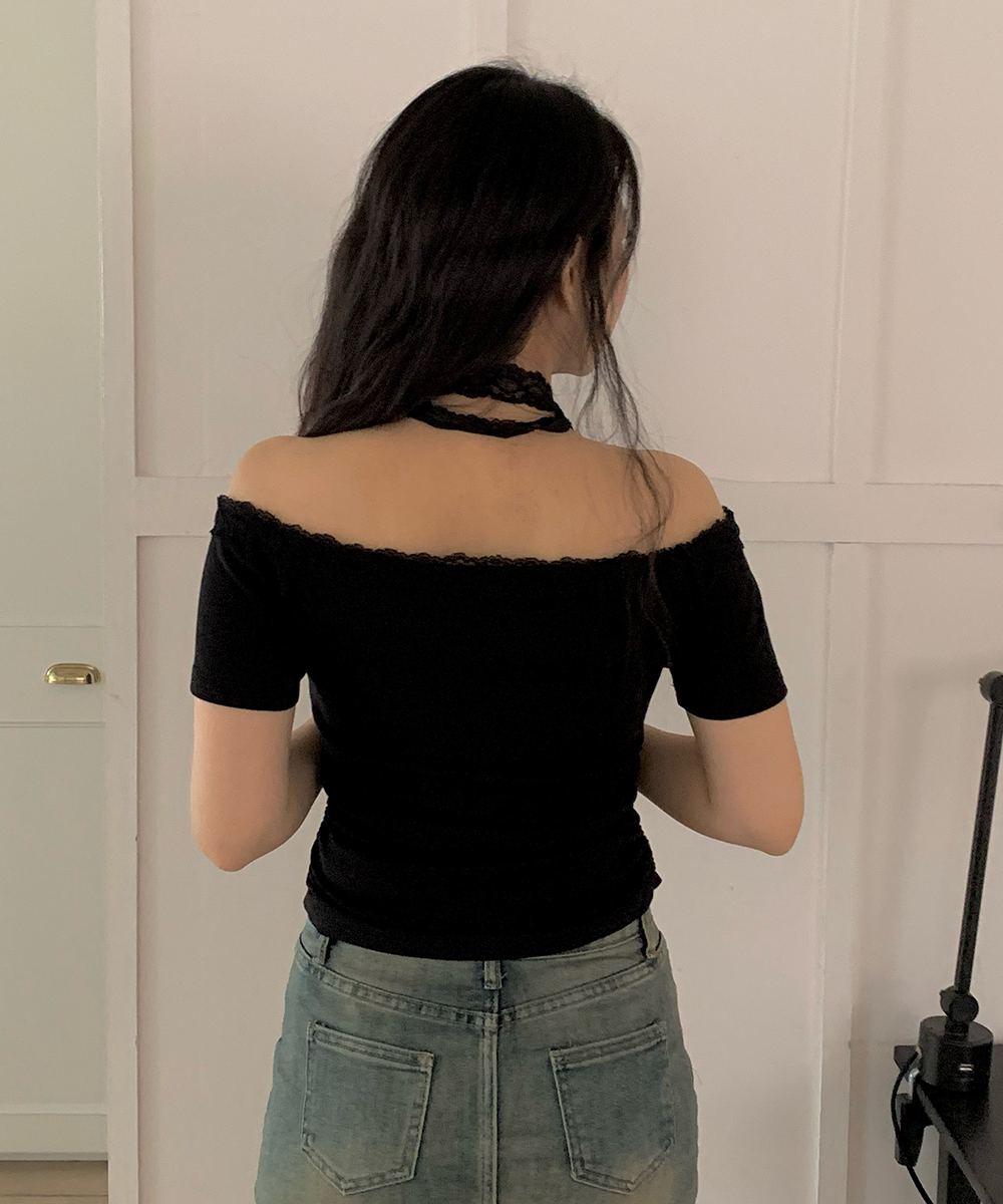 [レーススカーフSET]サイドシャーリングオフショルTシャツ-3color