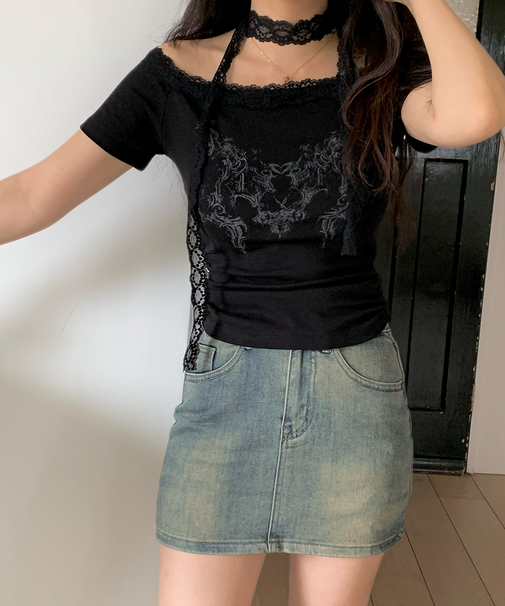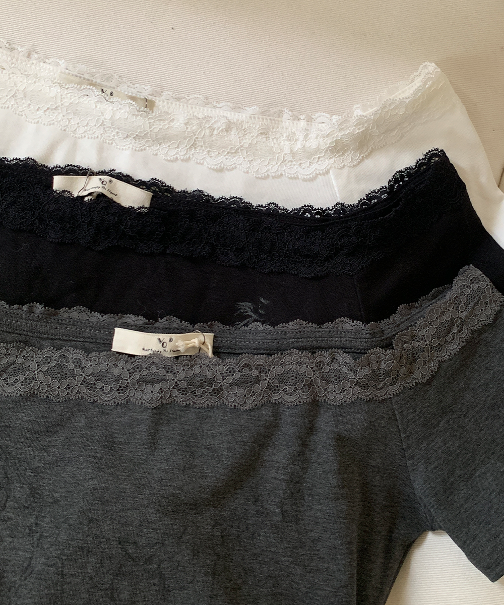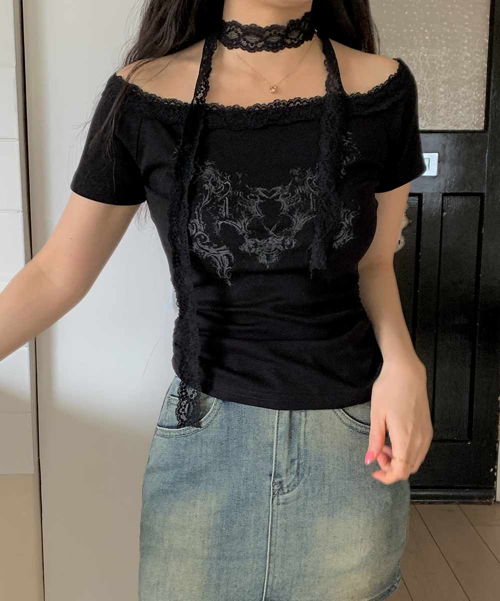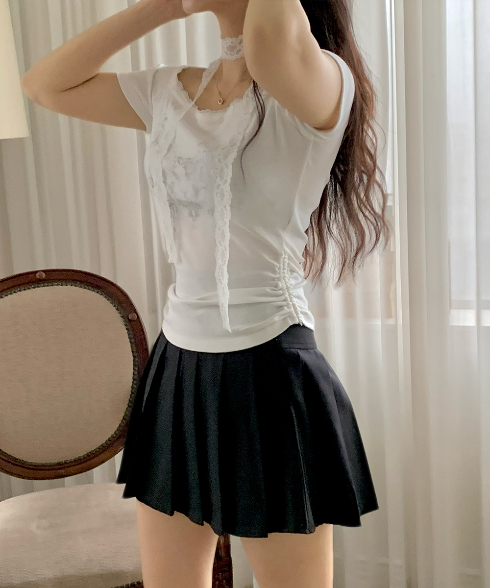 [レーススカーフSET]サイドシャーリングオフショルTシャツ-3color