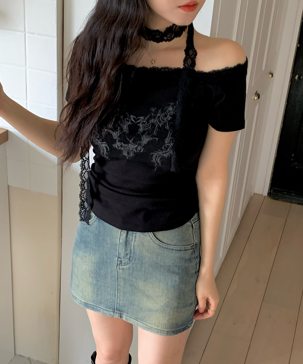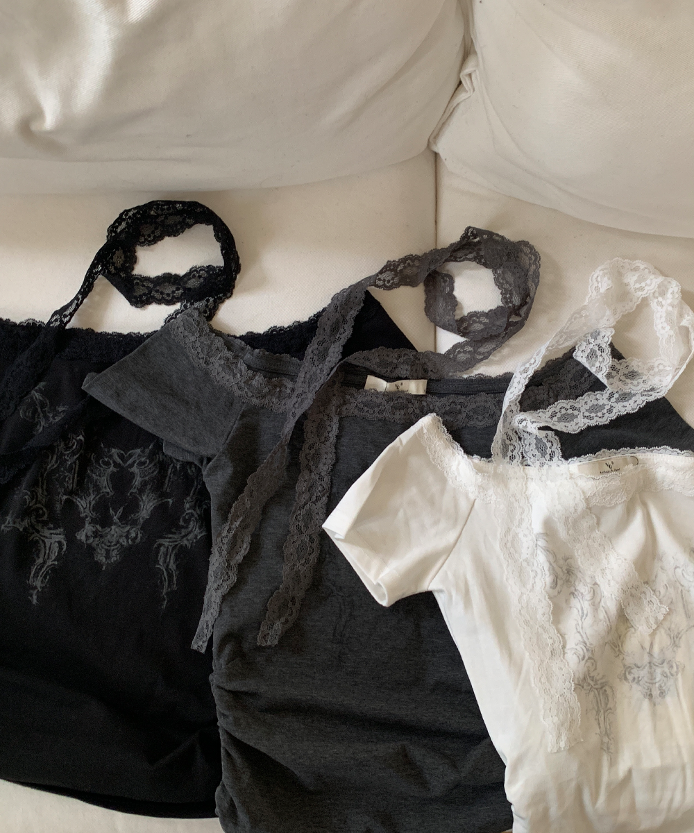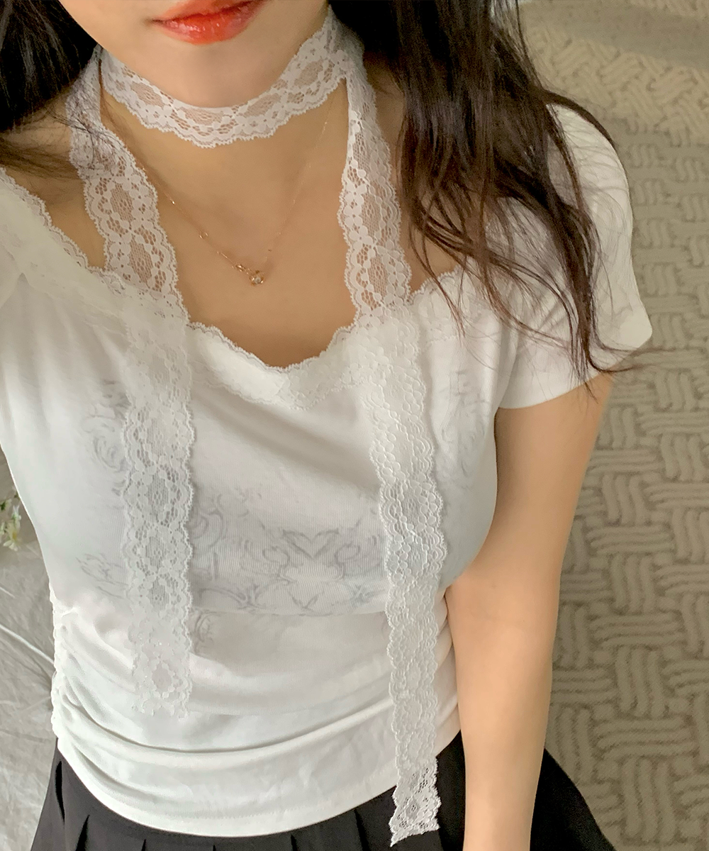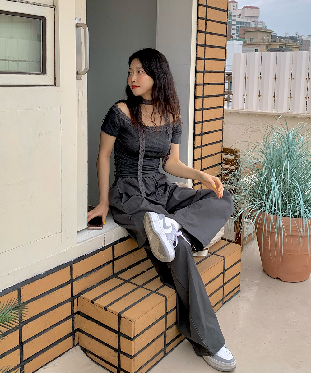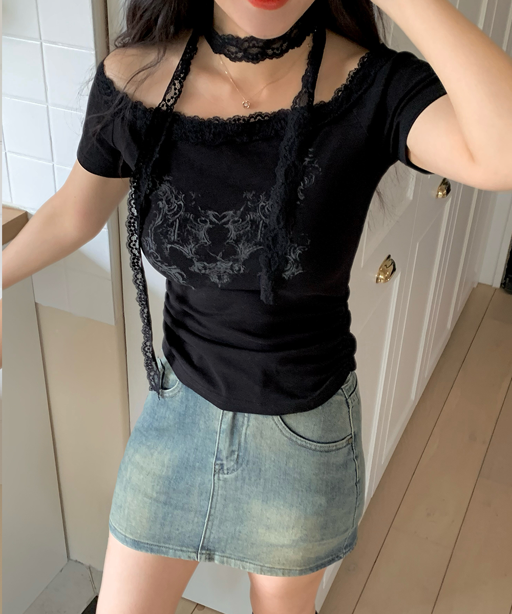[レーススカーフSET]サイドシャーリングオフショルTシャツ-3color