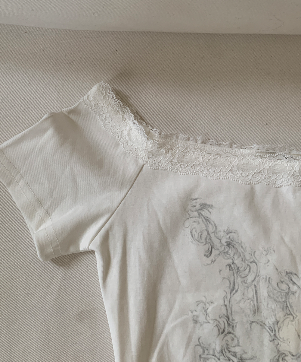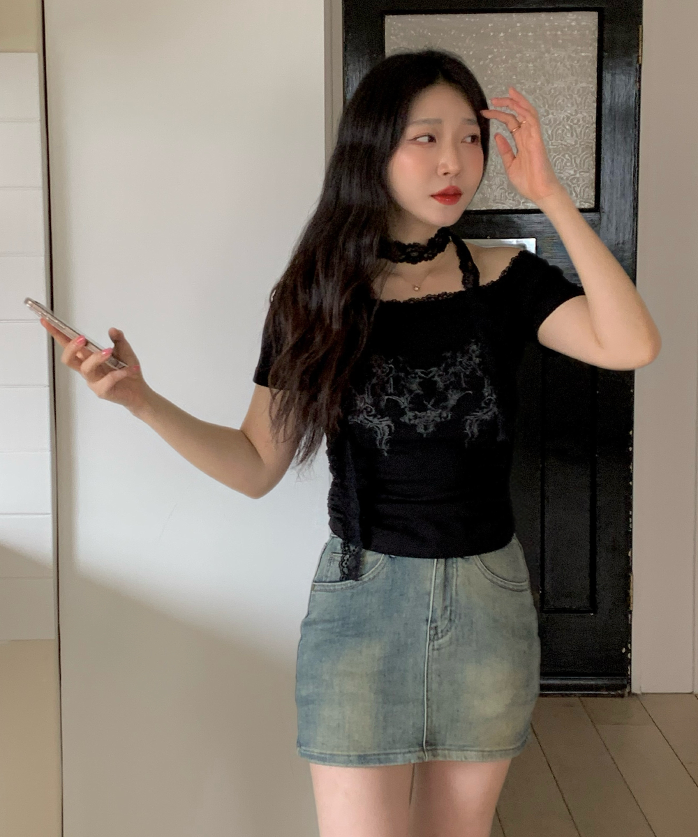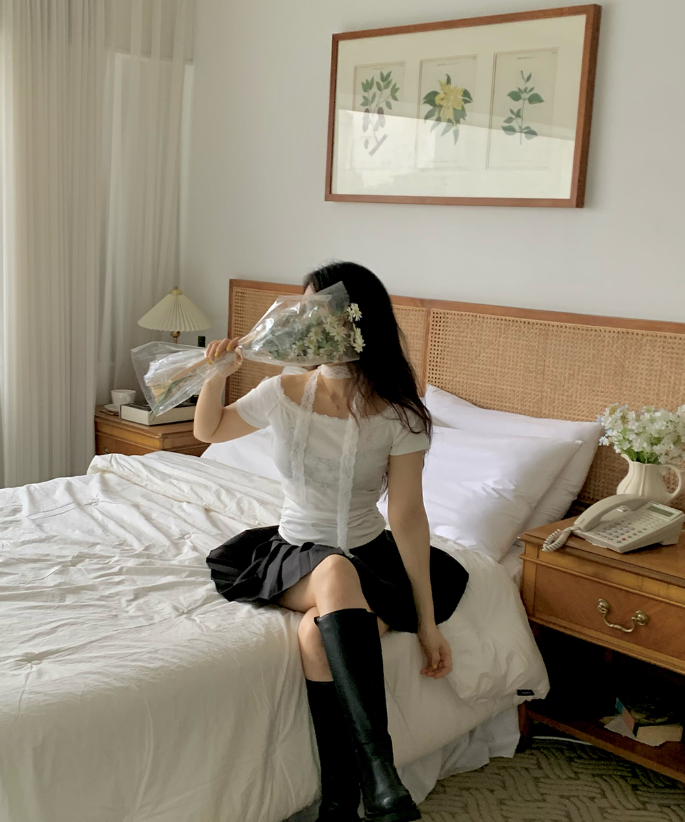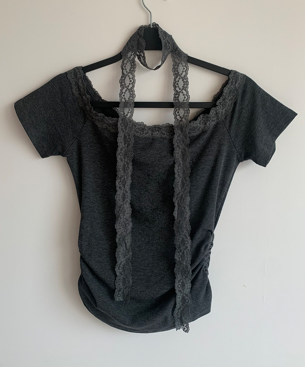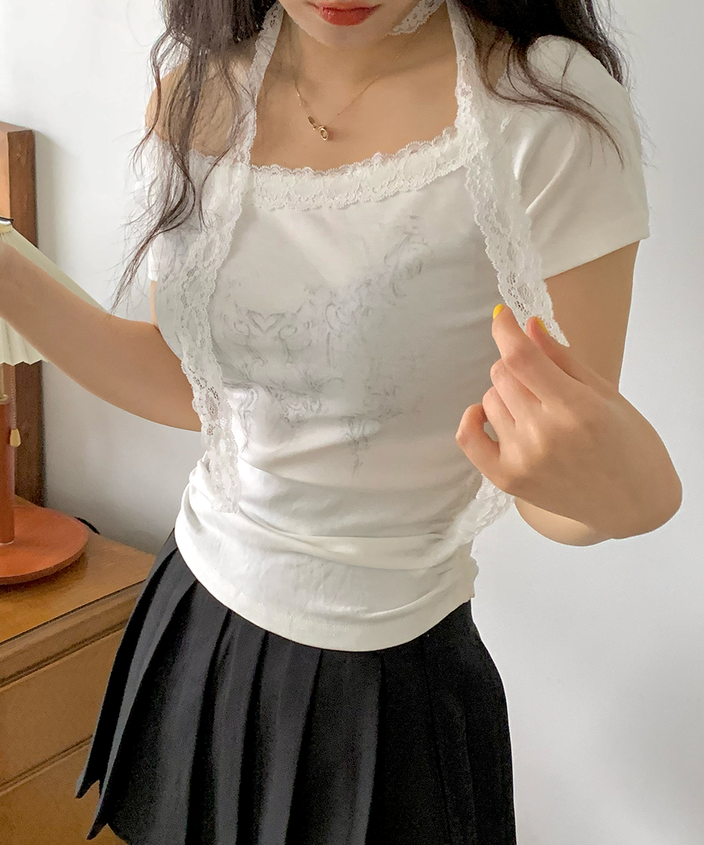 [レーススカーフSET]サイドシャーリングオフショルTシャツ-3color