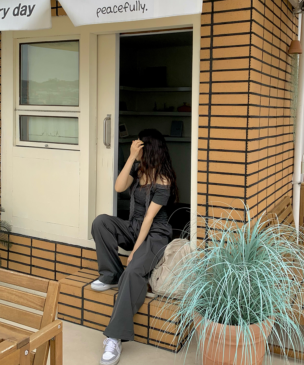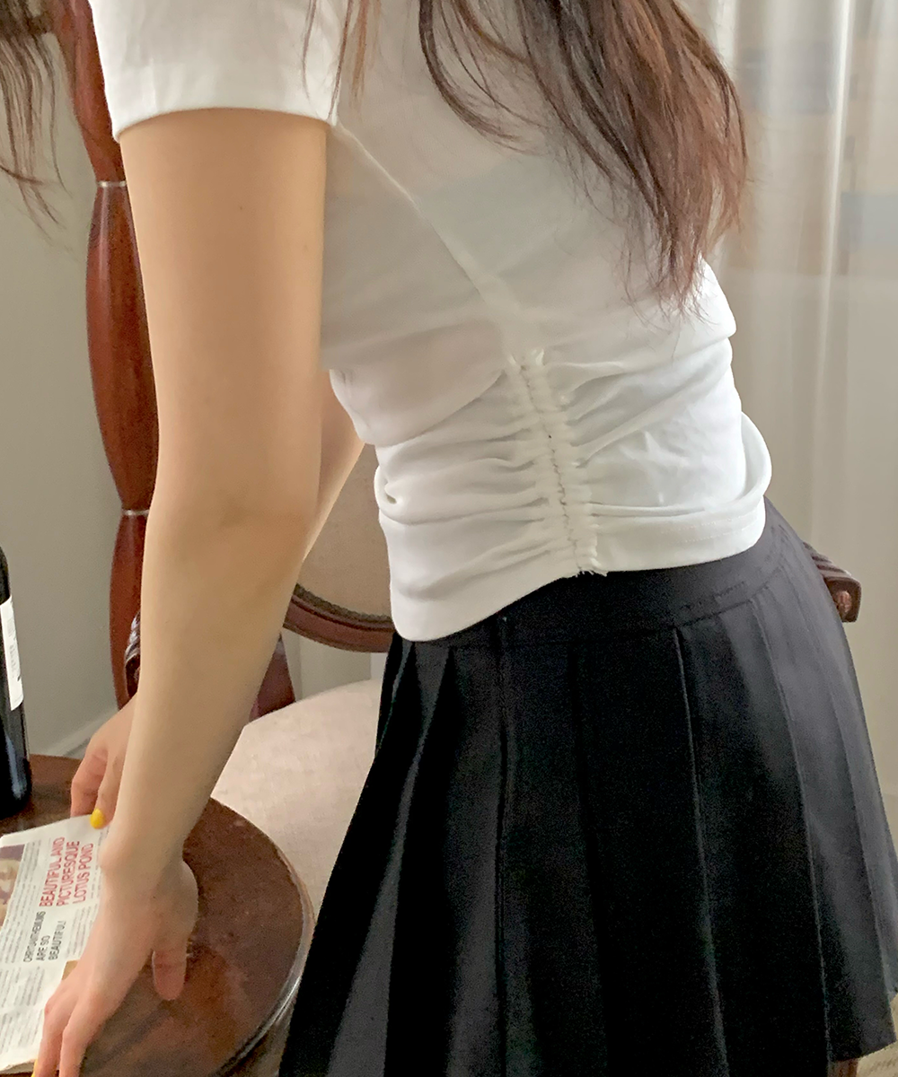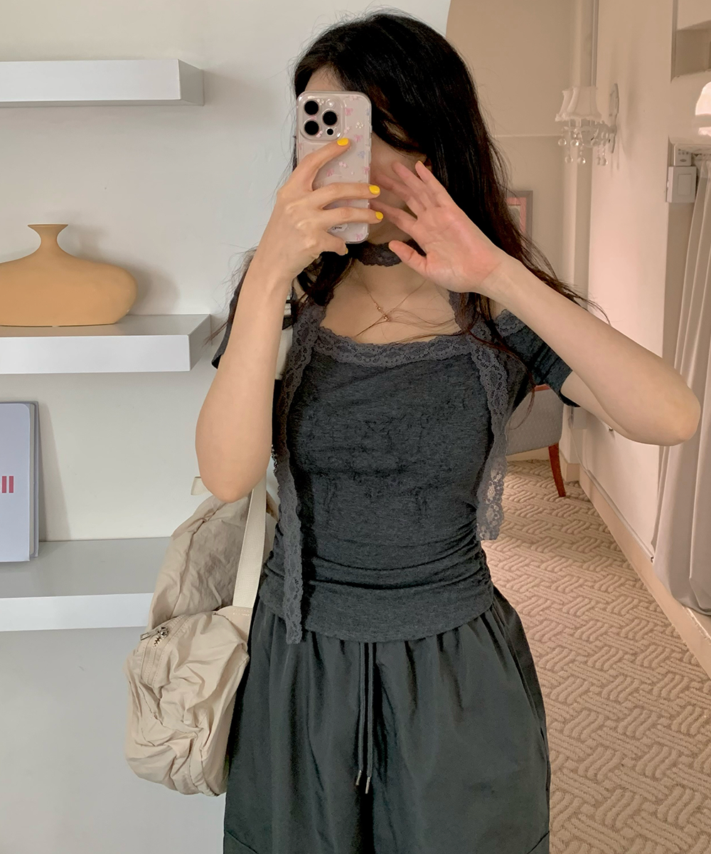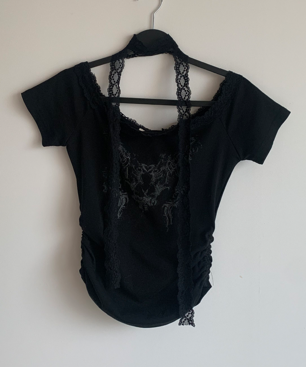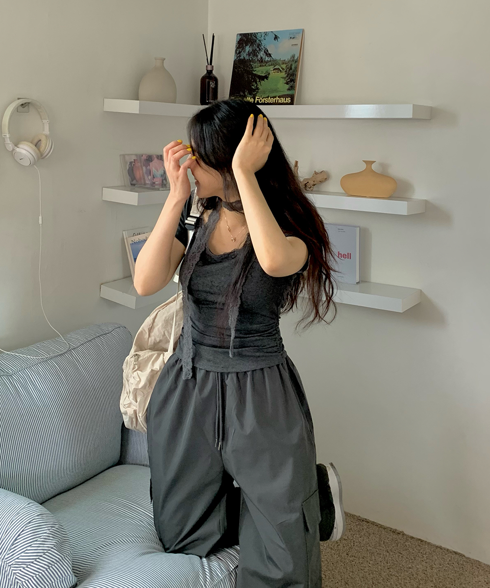 [レーススカーフSET]サイドシャーリングオフショルTシャツ-3color