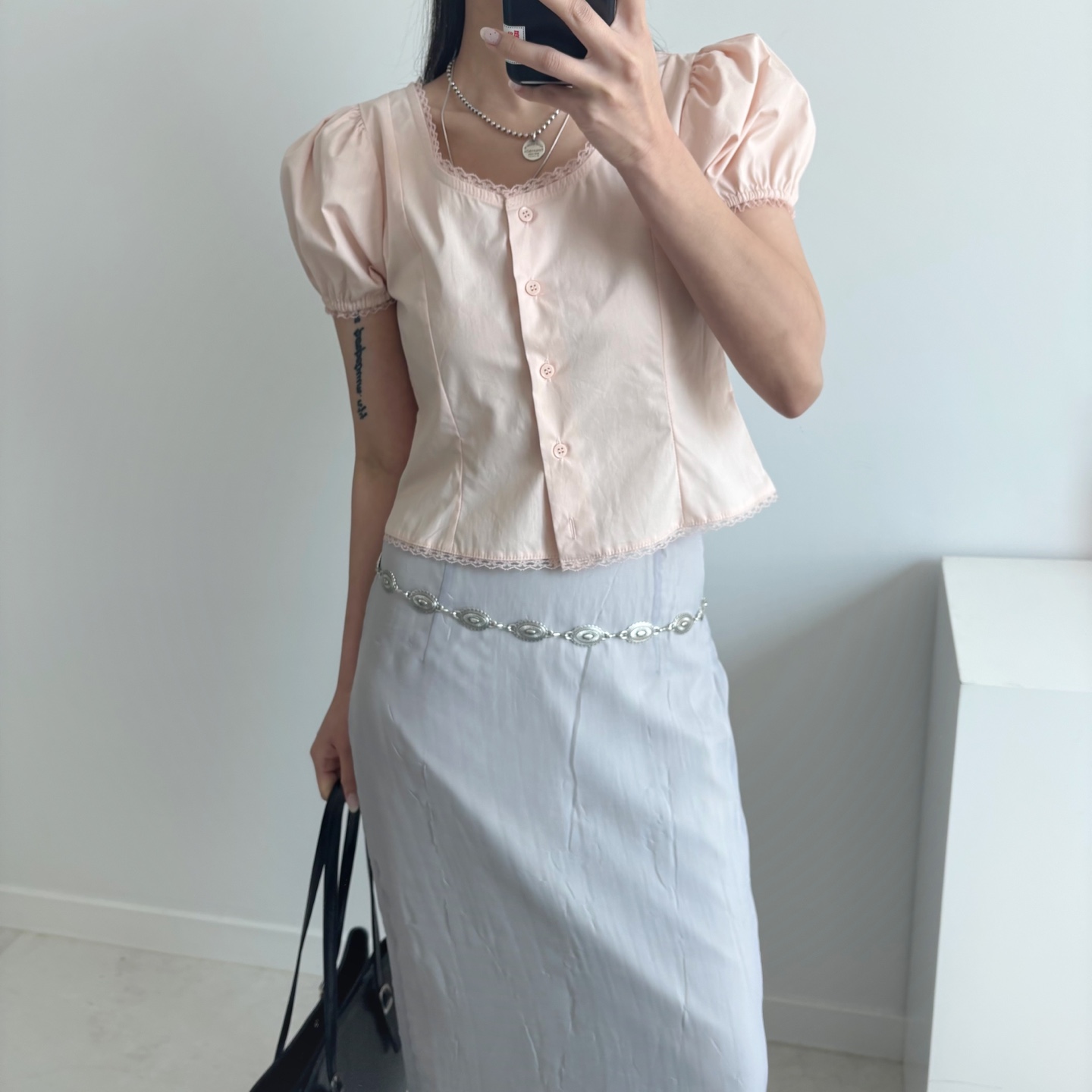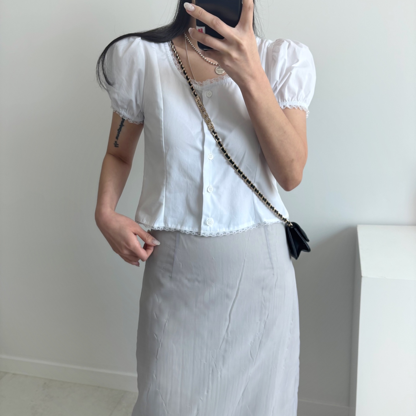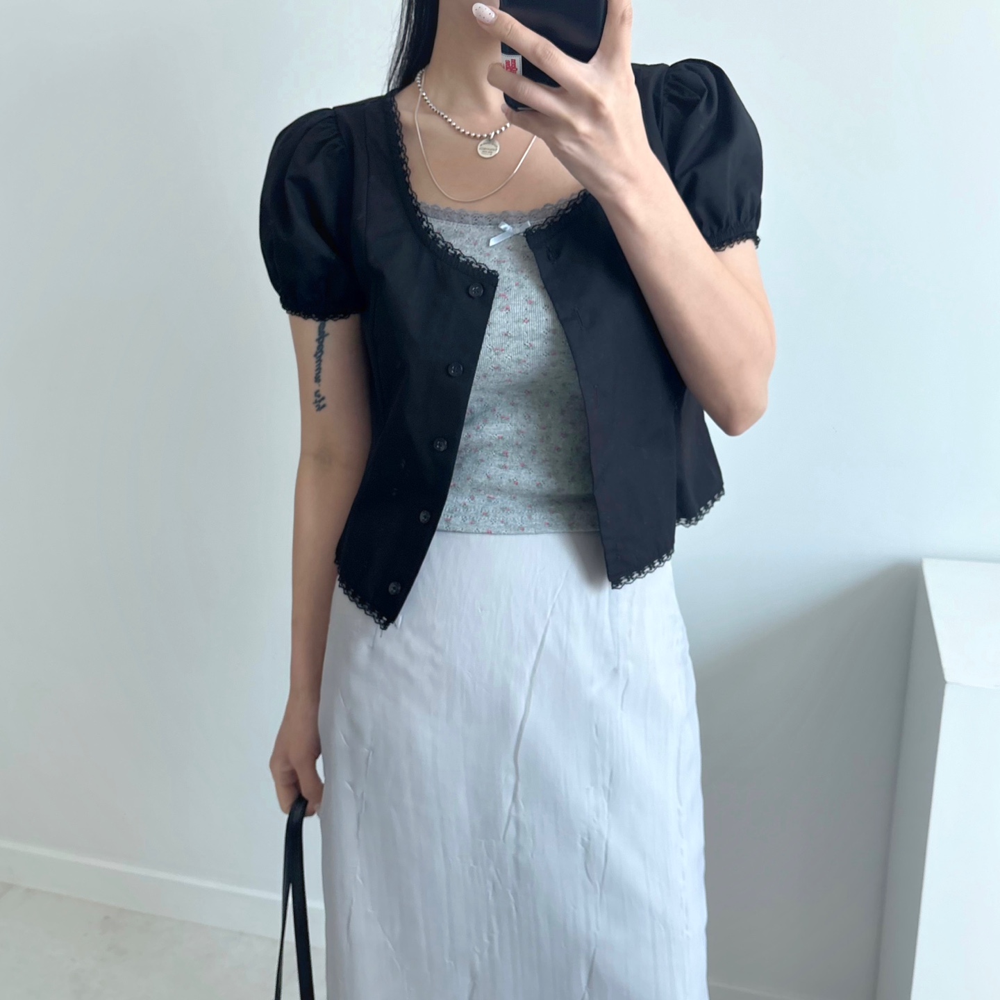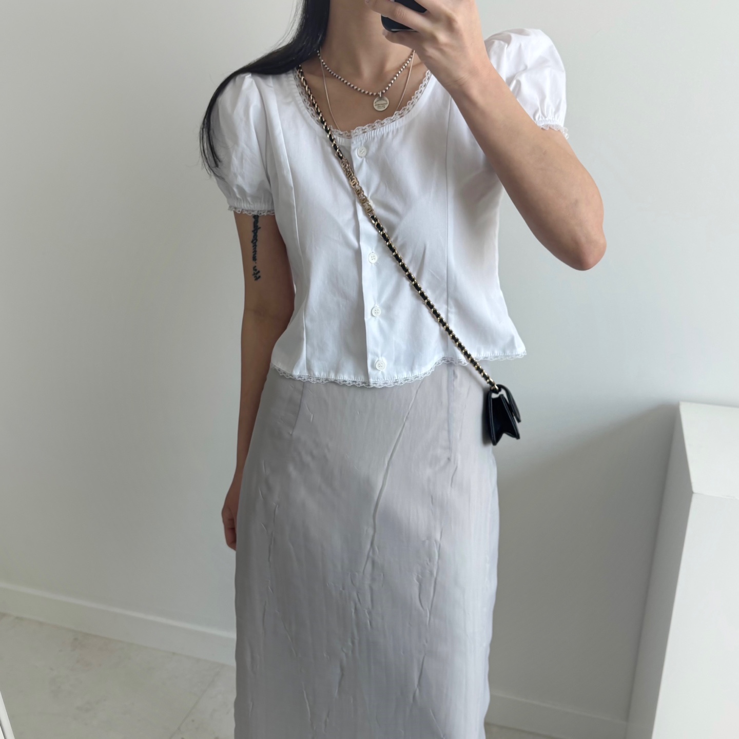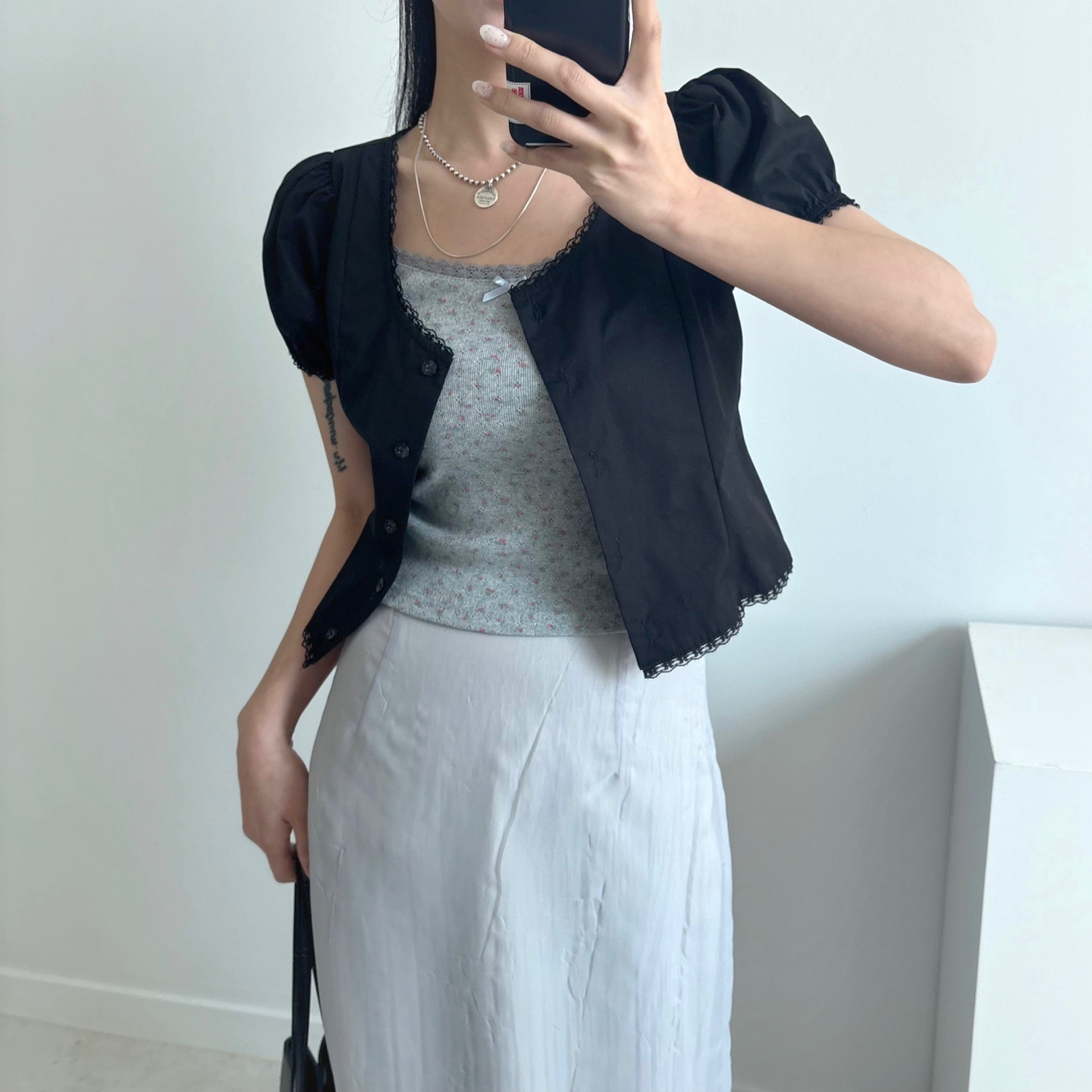 レースパンチングパフクロップドブラウス
