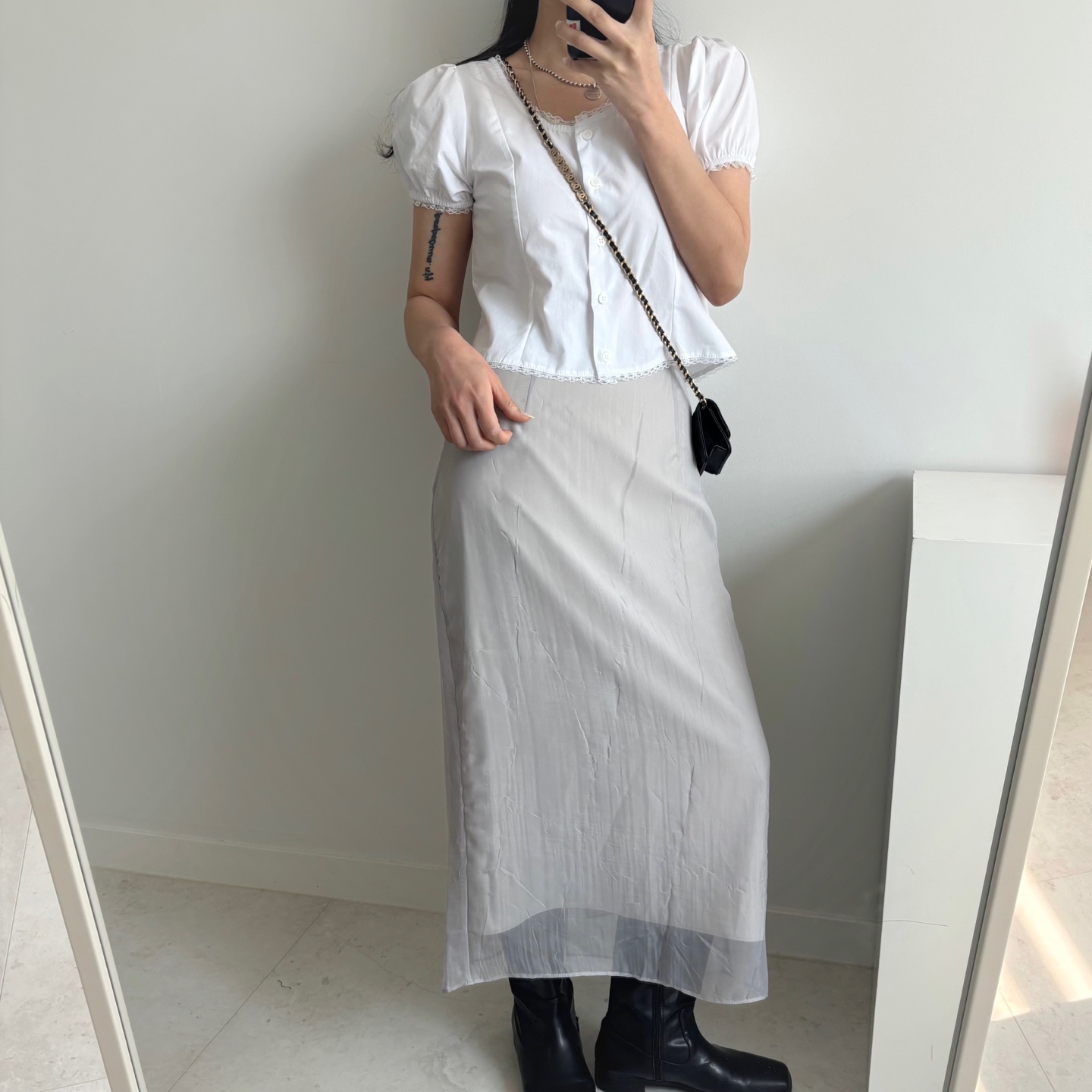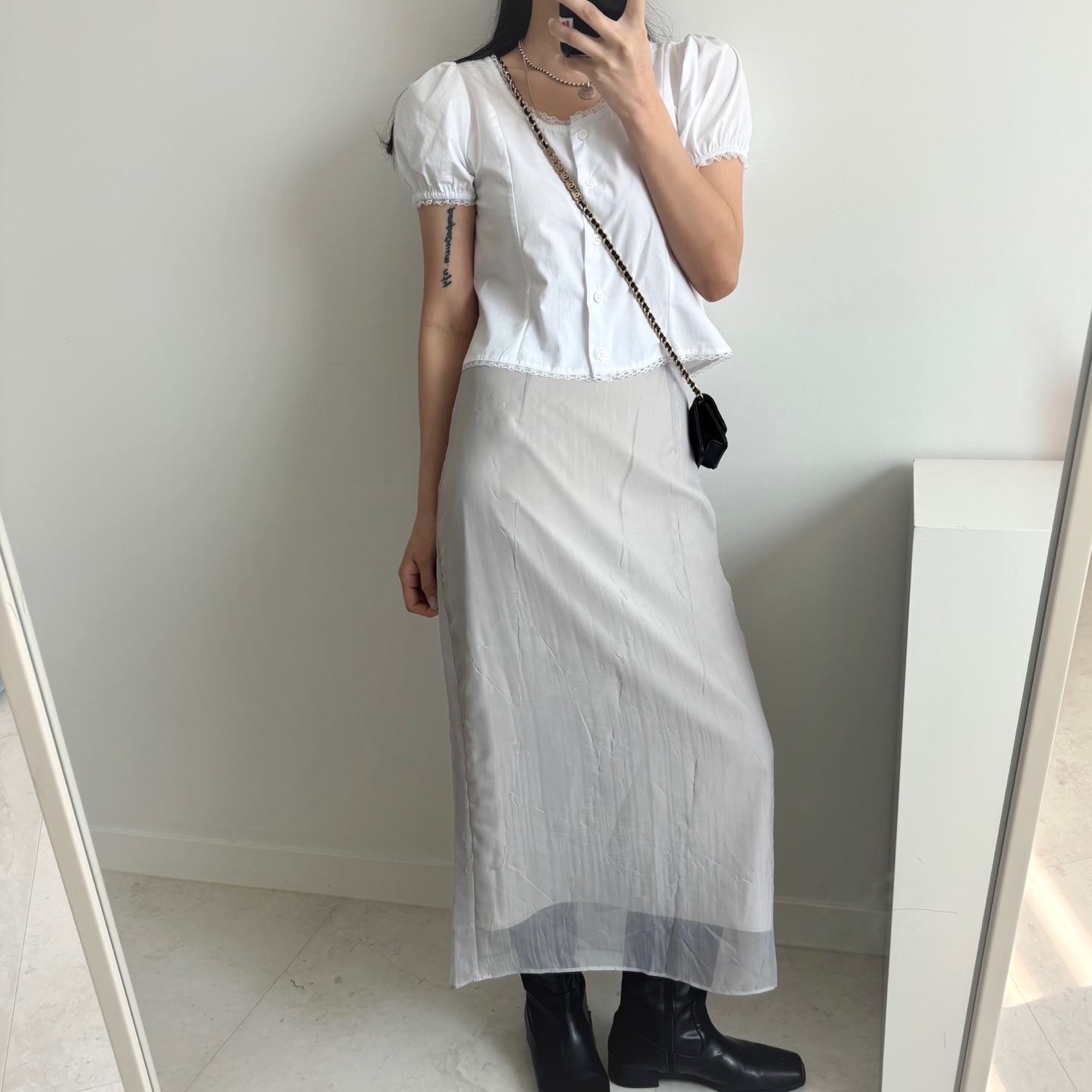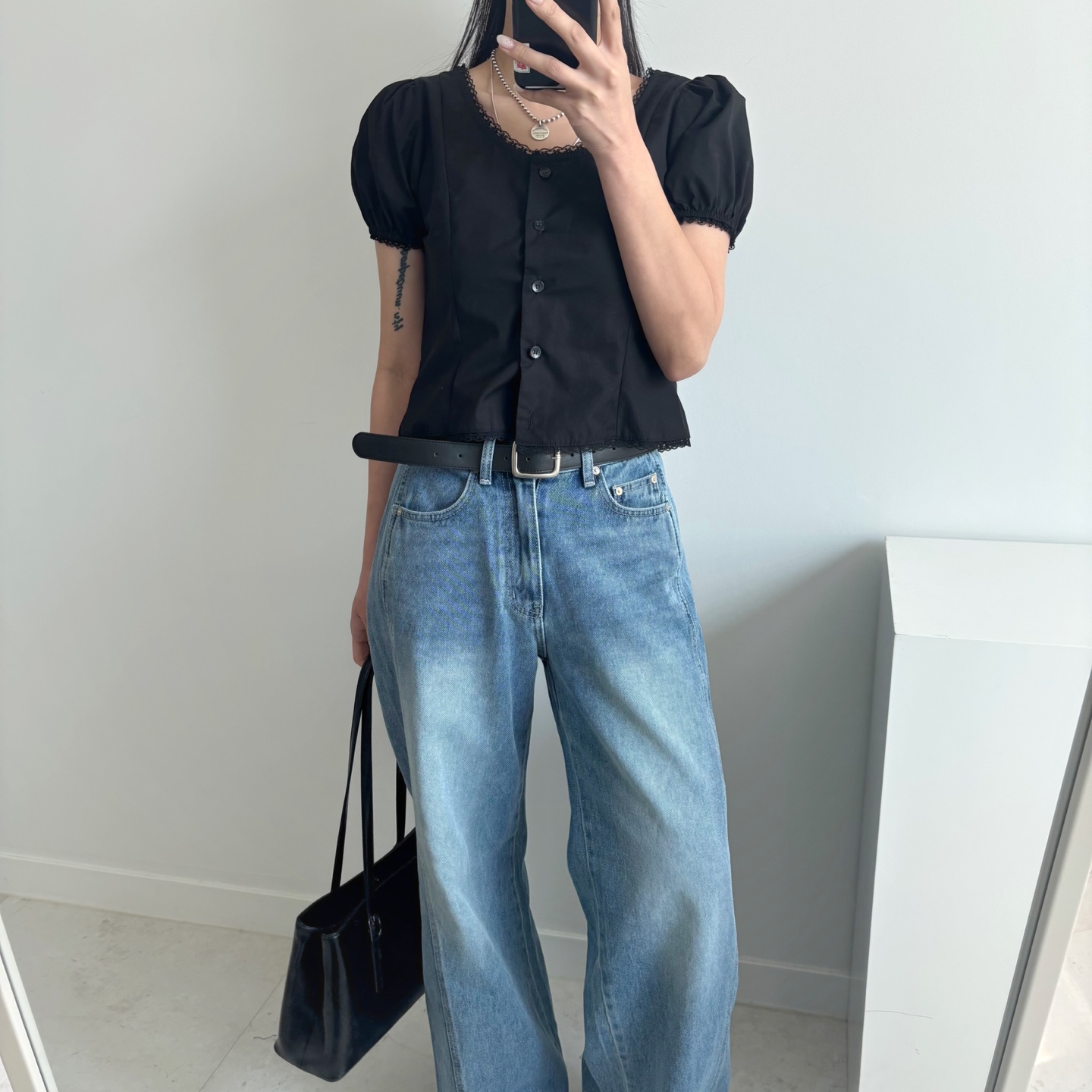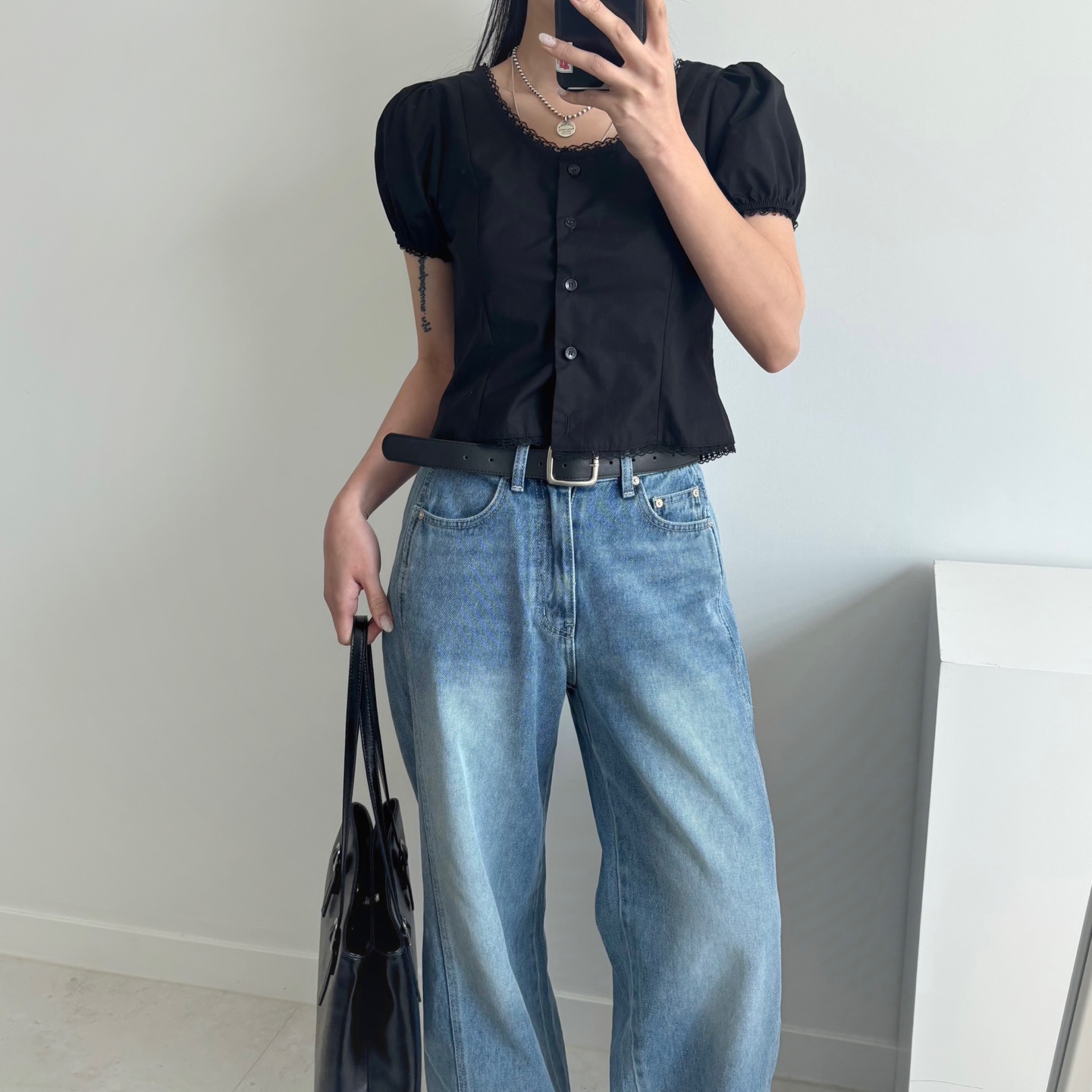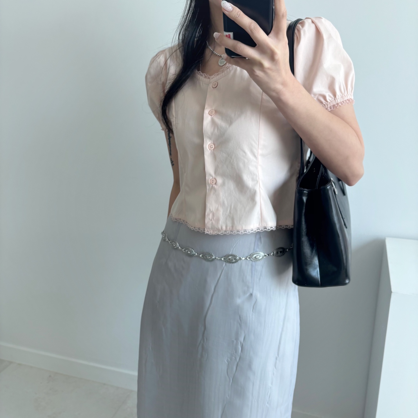 レースパンチングパフクロップドブラウス