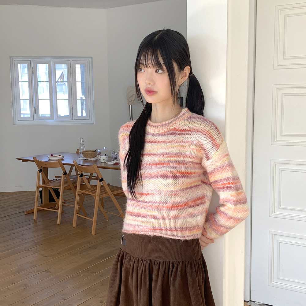 ウールミックスストライプ配色クロップド長袖ニット