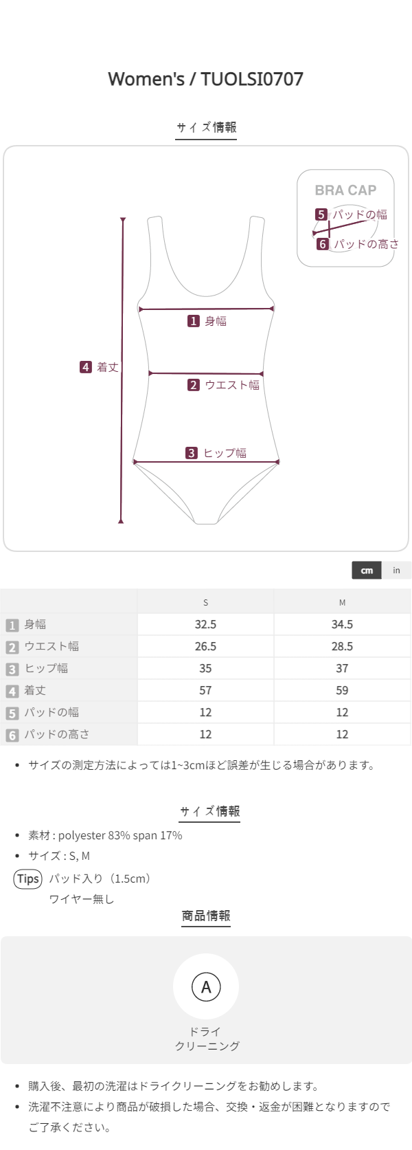 S (44半-55, ブラジャー75, 下着90)