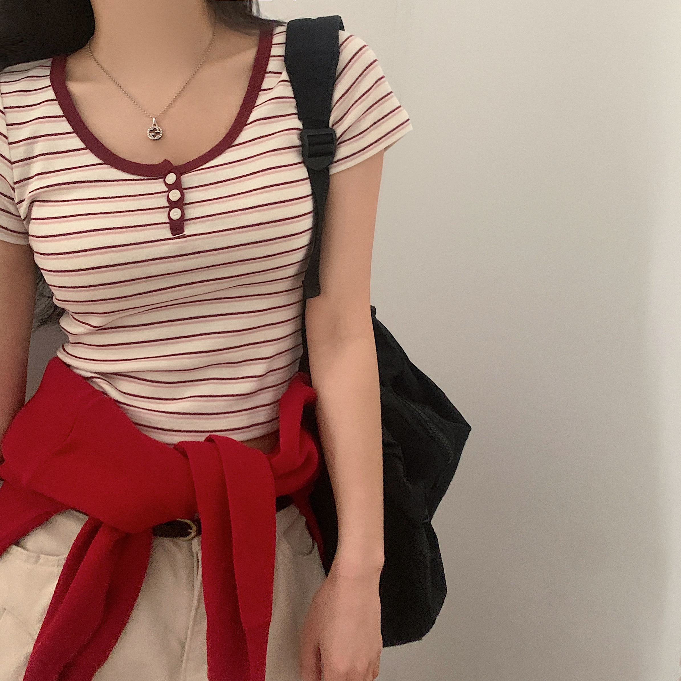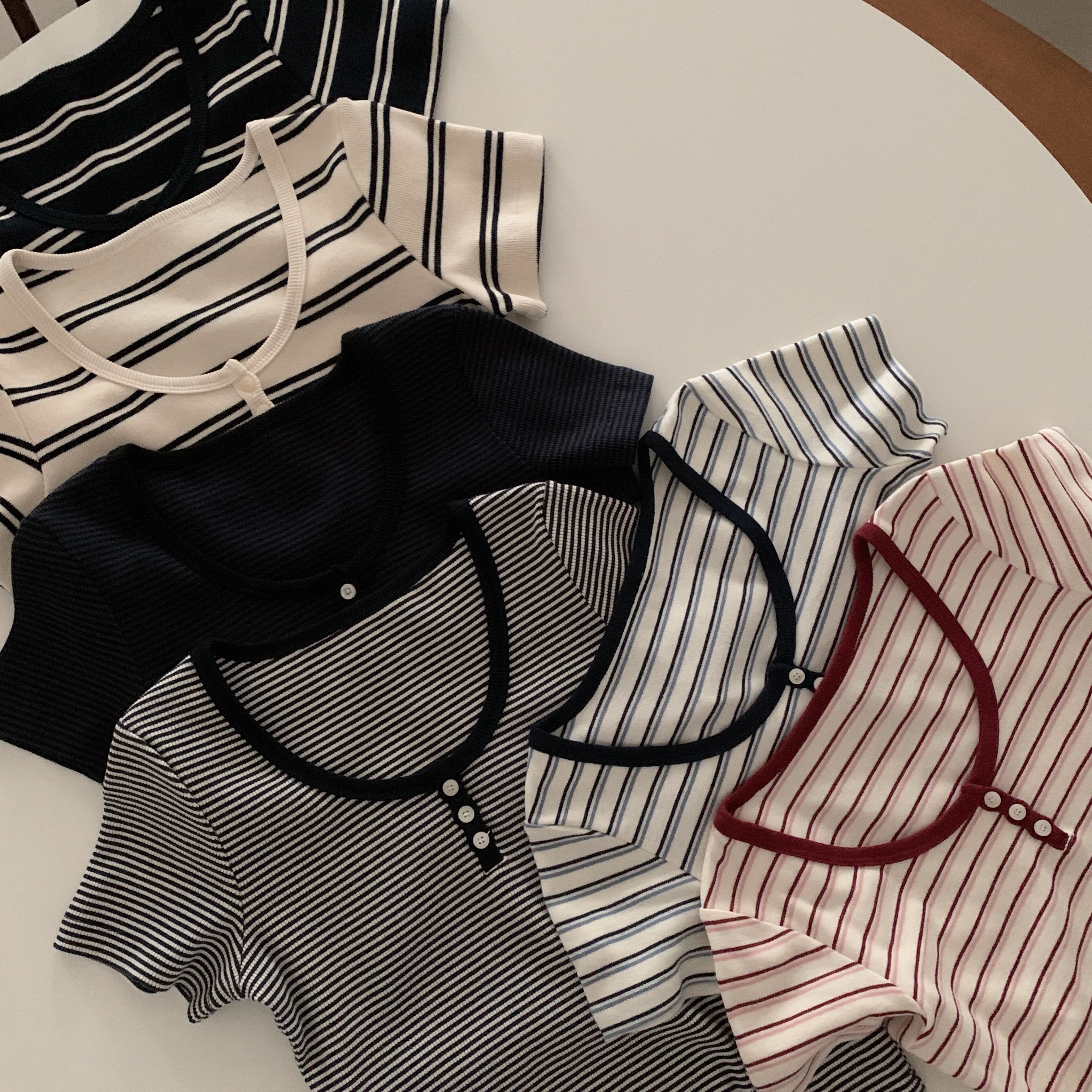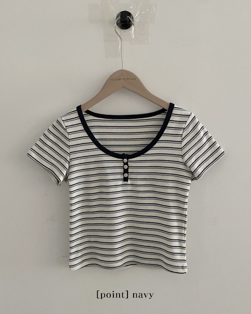 [original]ボーダーボタンラウンドクロップド半袖Tシャツ