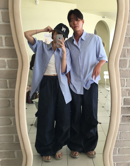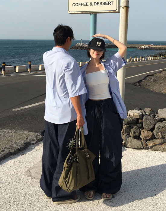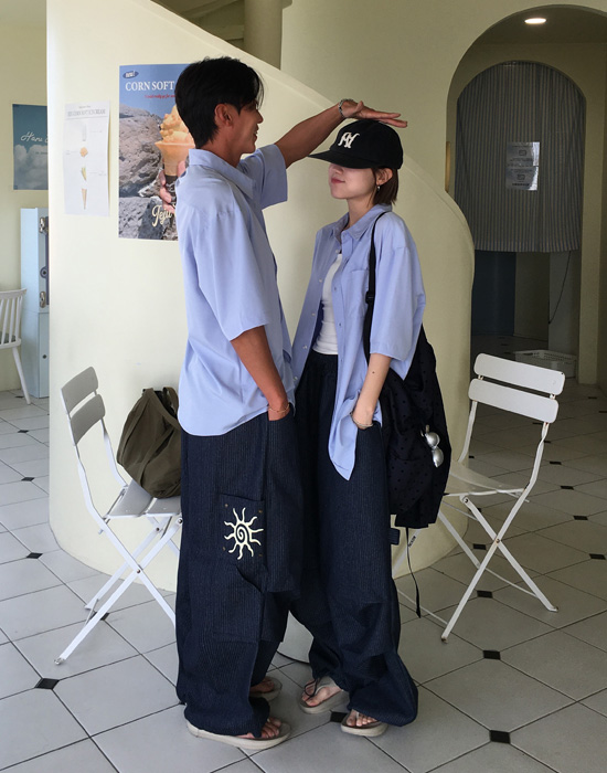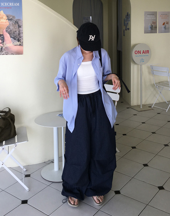 (UNISEX)ストライプバルーンデニムパンツ
