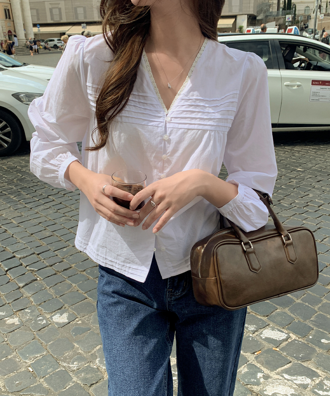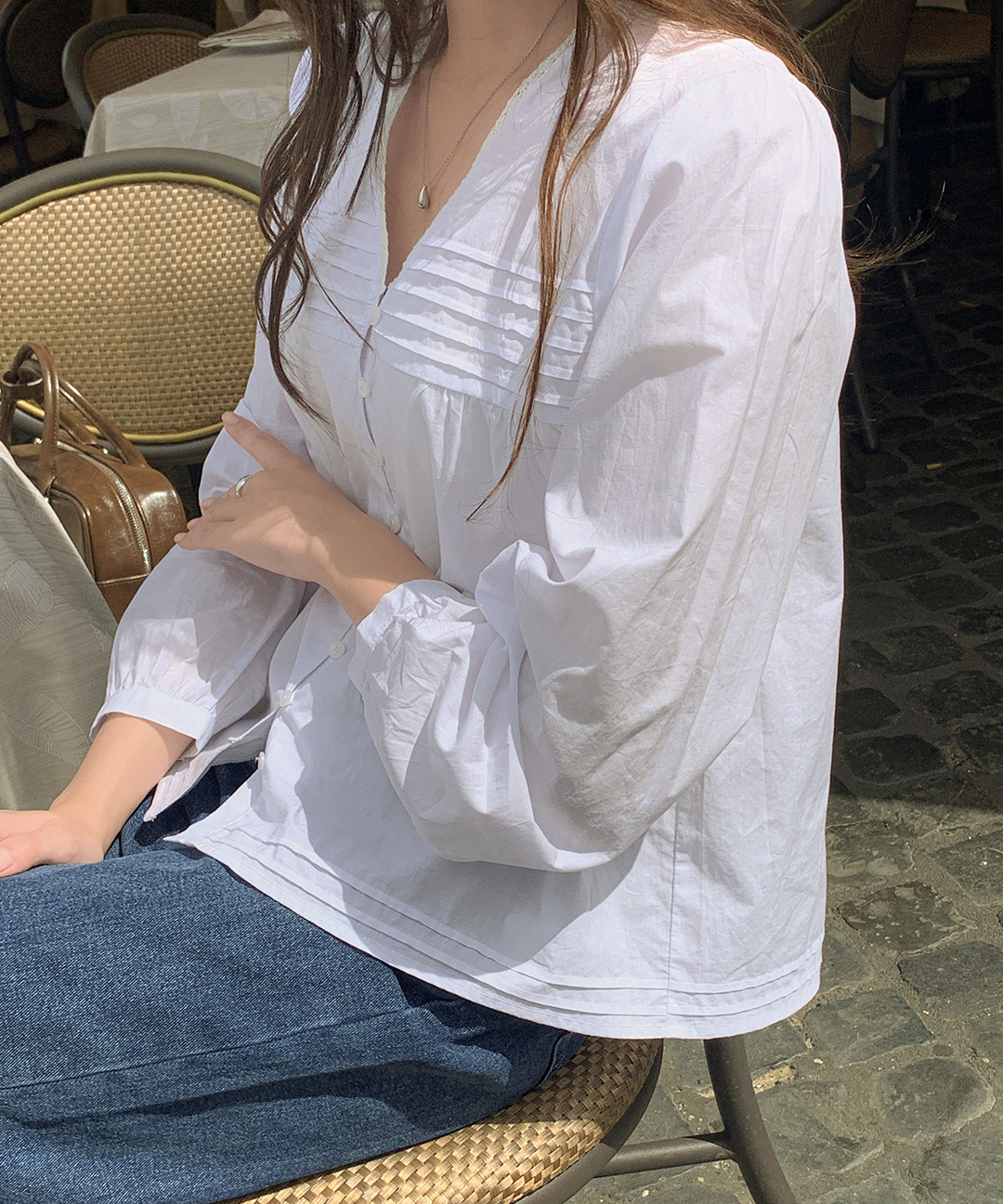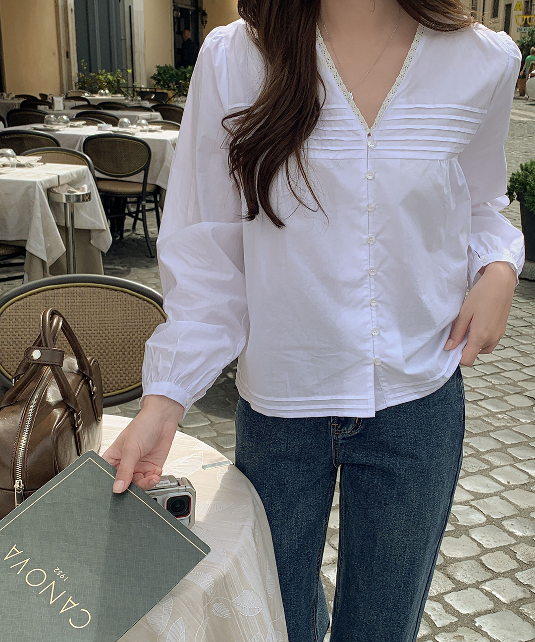 [original]ピーチズ Vネック ピンタック レース ブラウス (S-L)