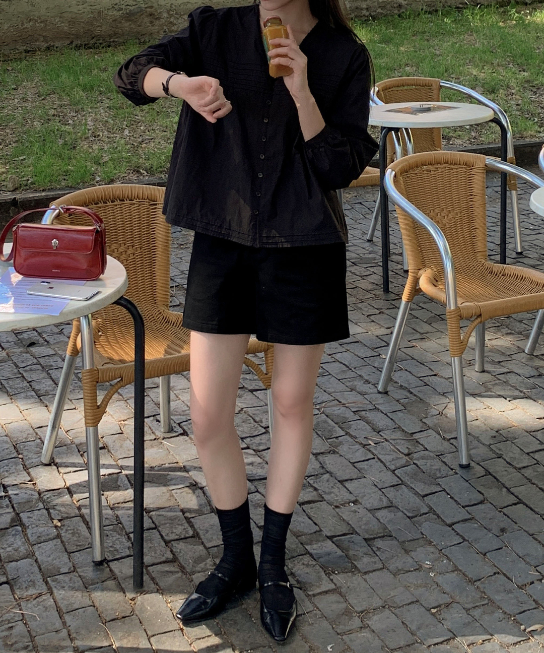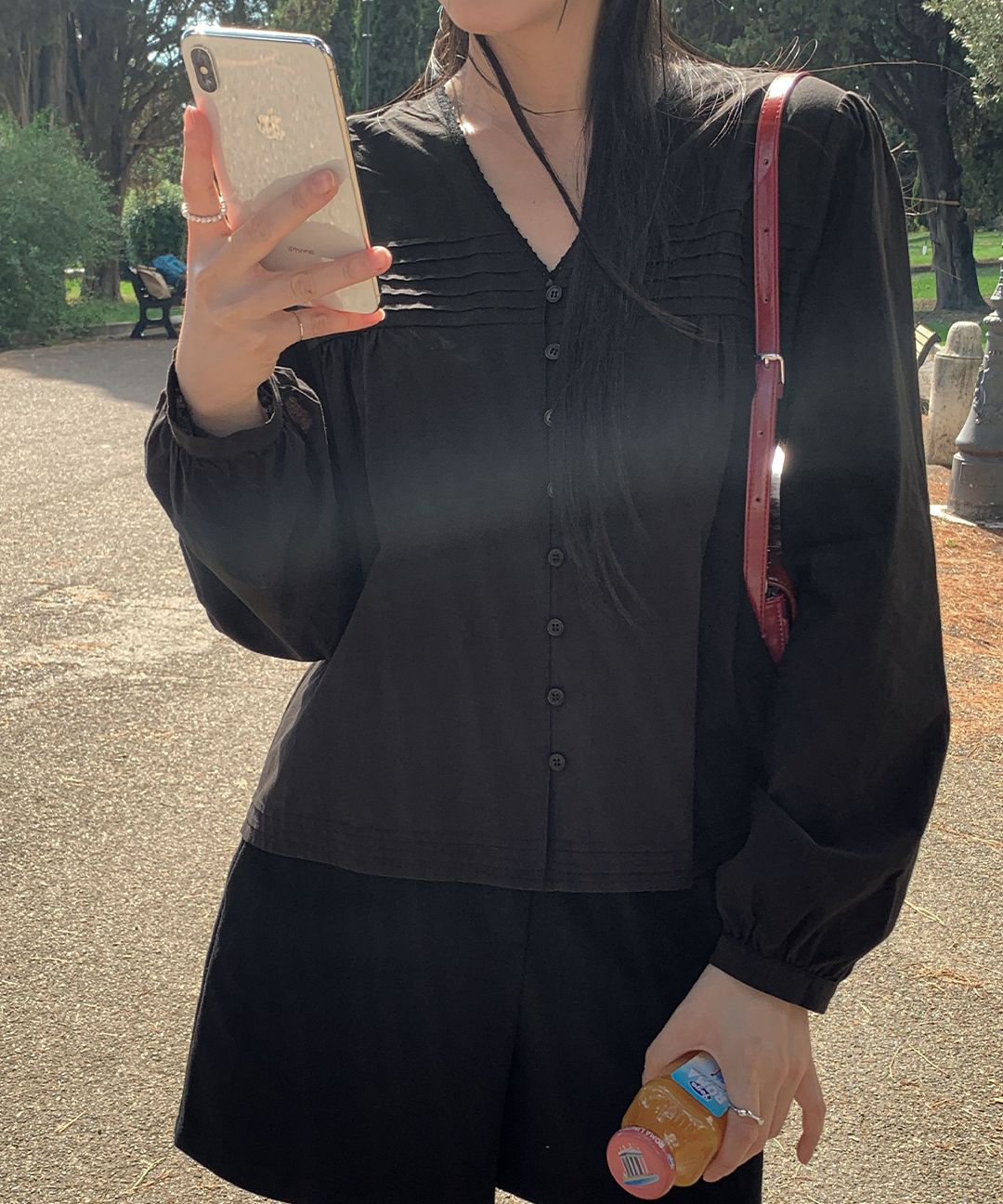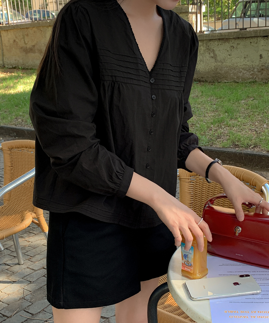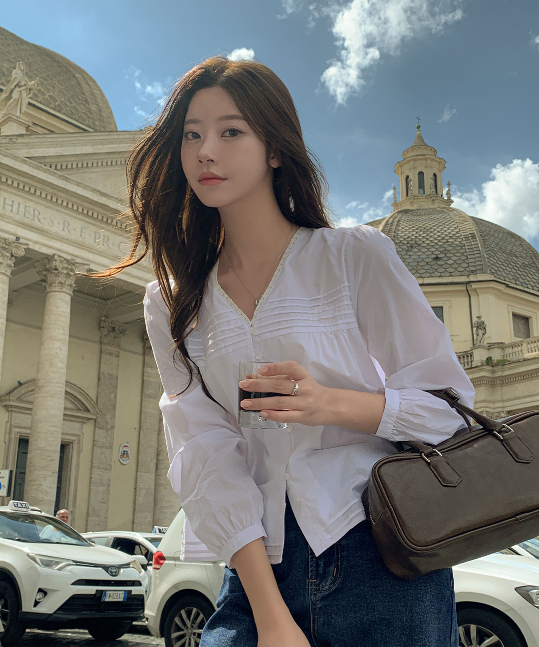 [original]ピーチズ Vネック ピンタック レース ブラウス (S-L)