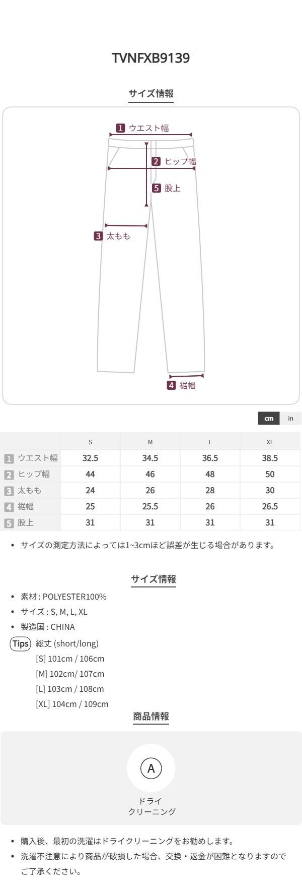 L ウエスト36.5 ヒップ49 太もも28 股上31.5 裾断面26 着丈(ショート/ロング)103/108