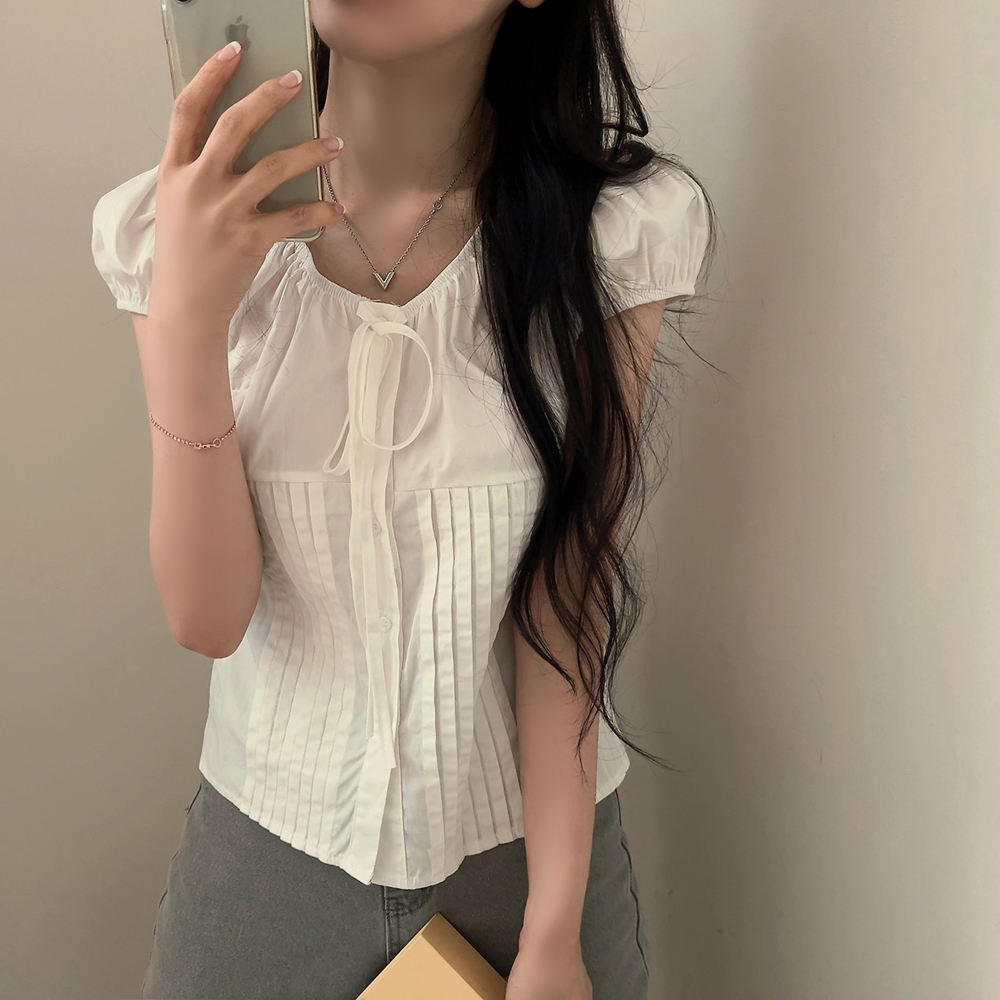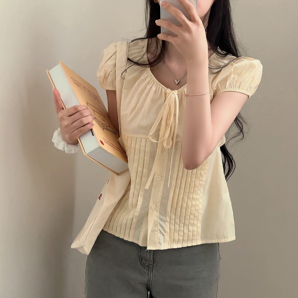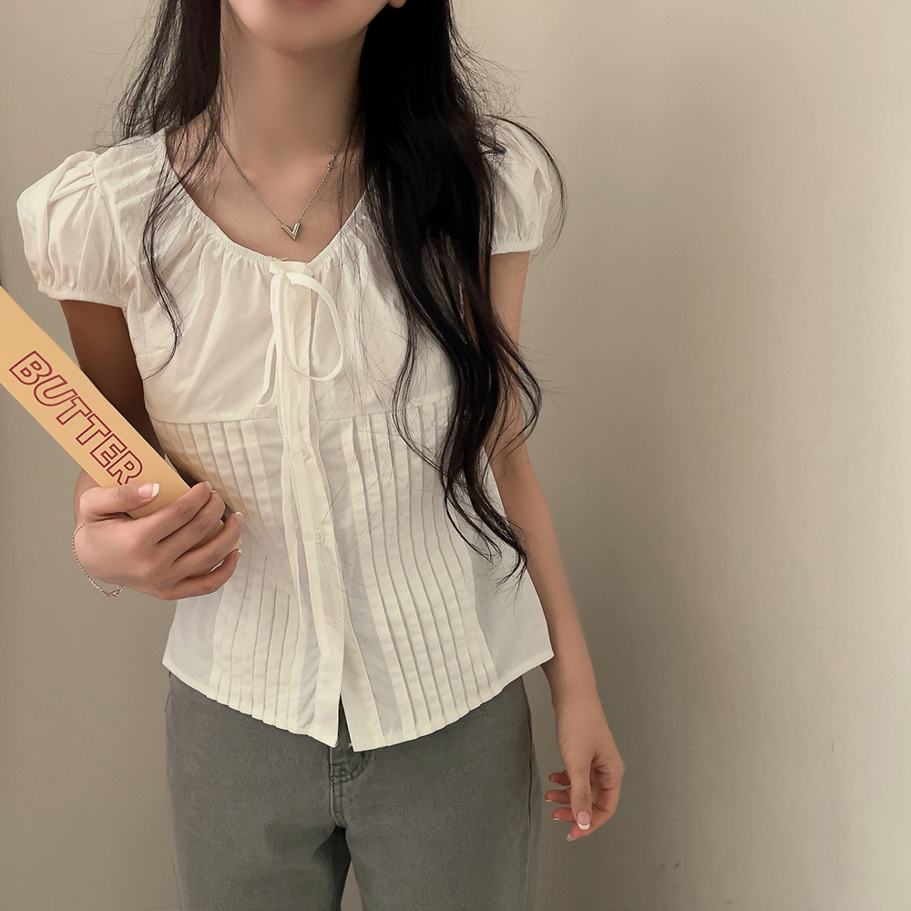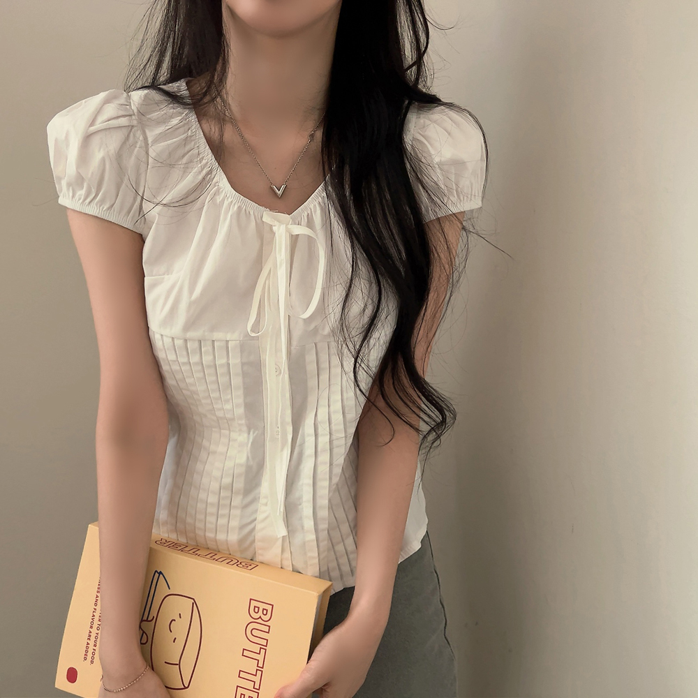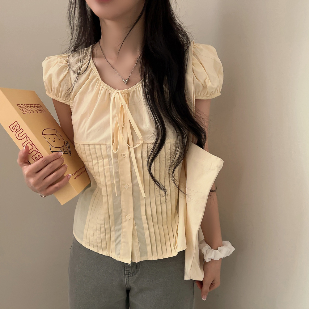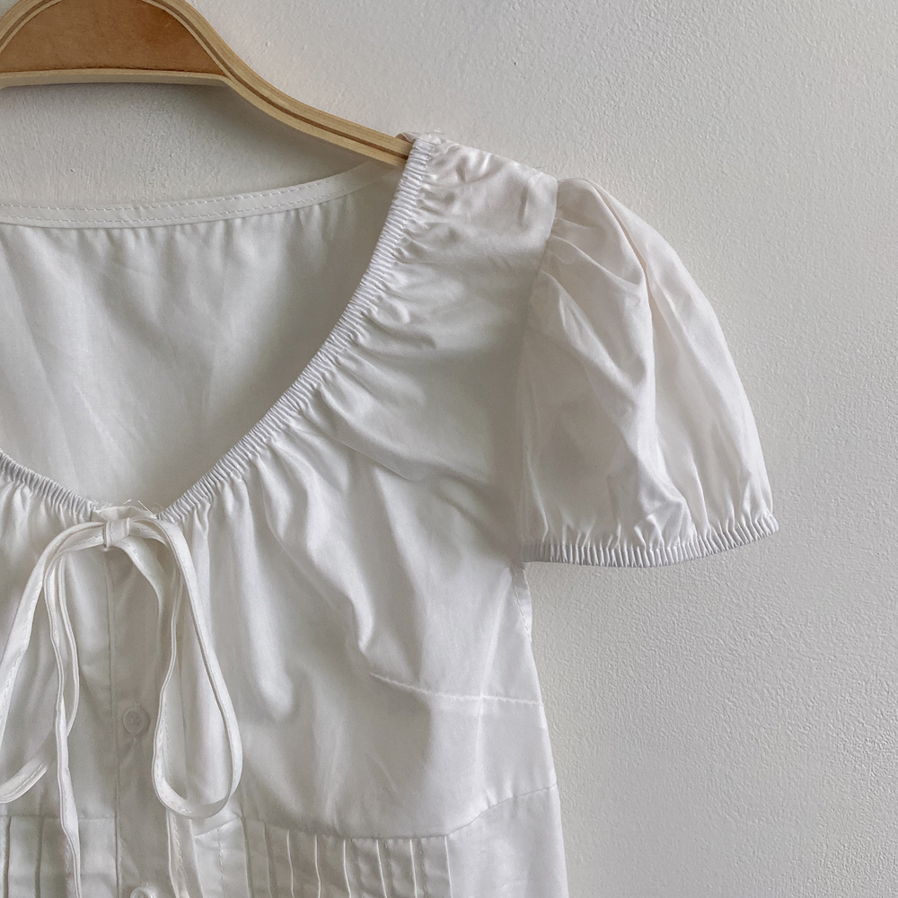 シャーリングリボンタック入りラウンドパフ半袖ブラウス